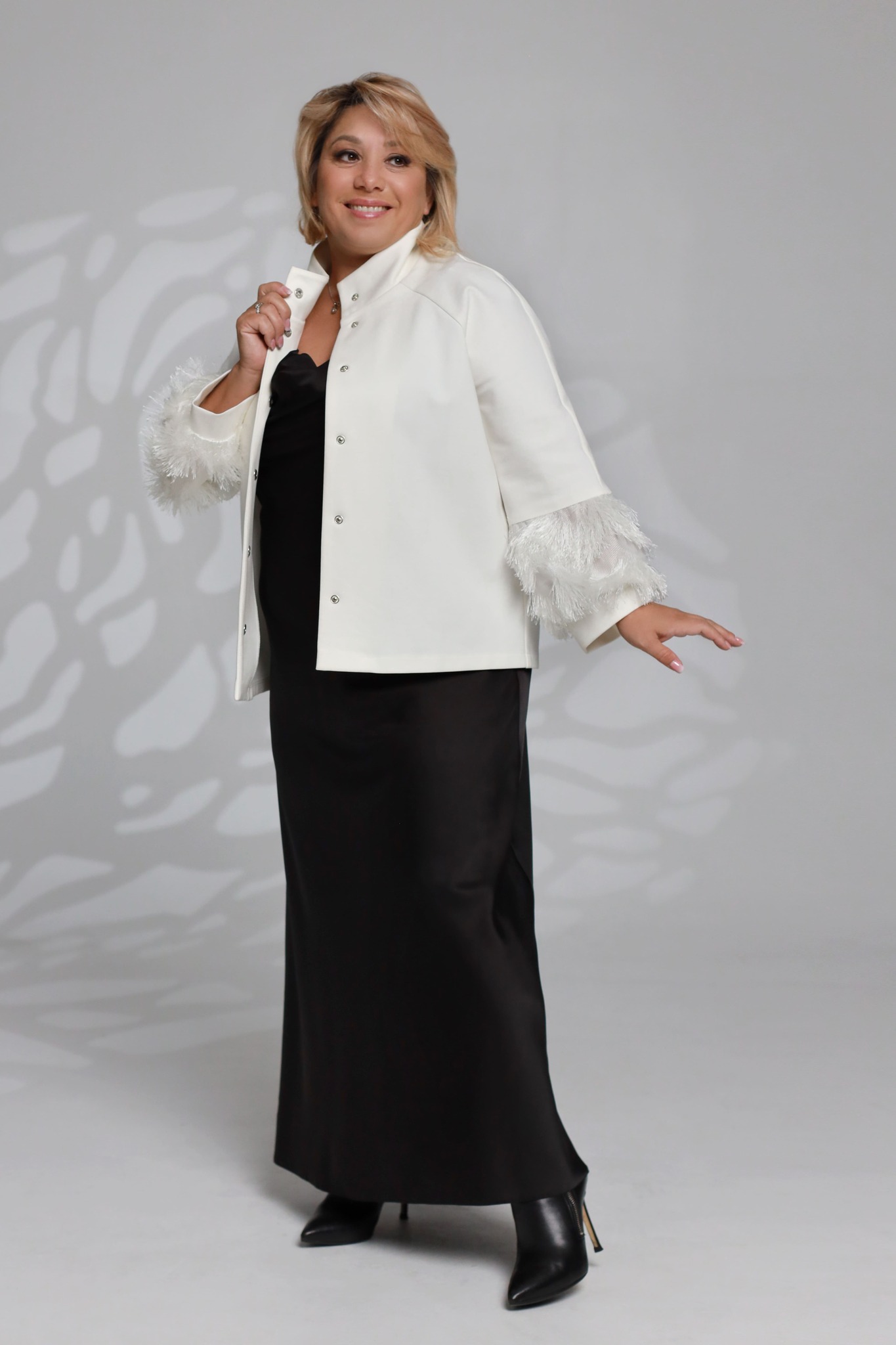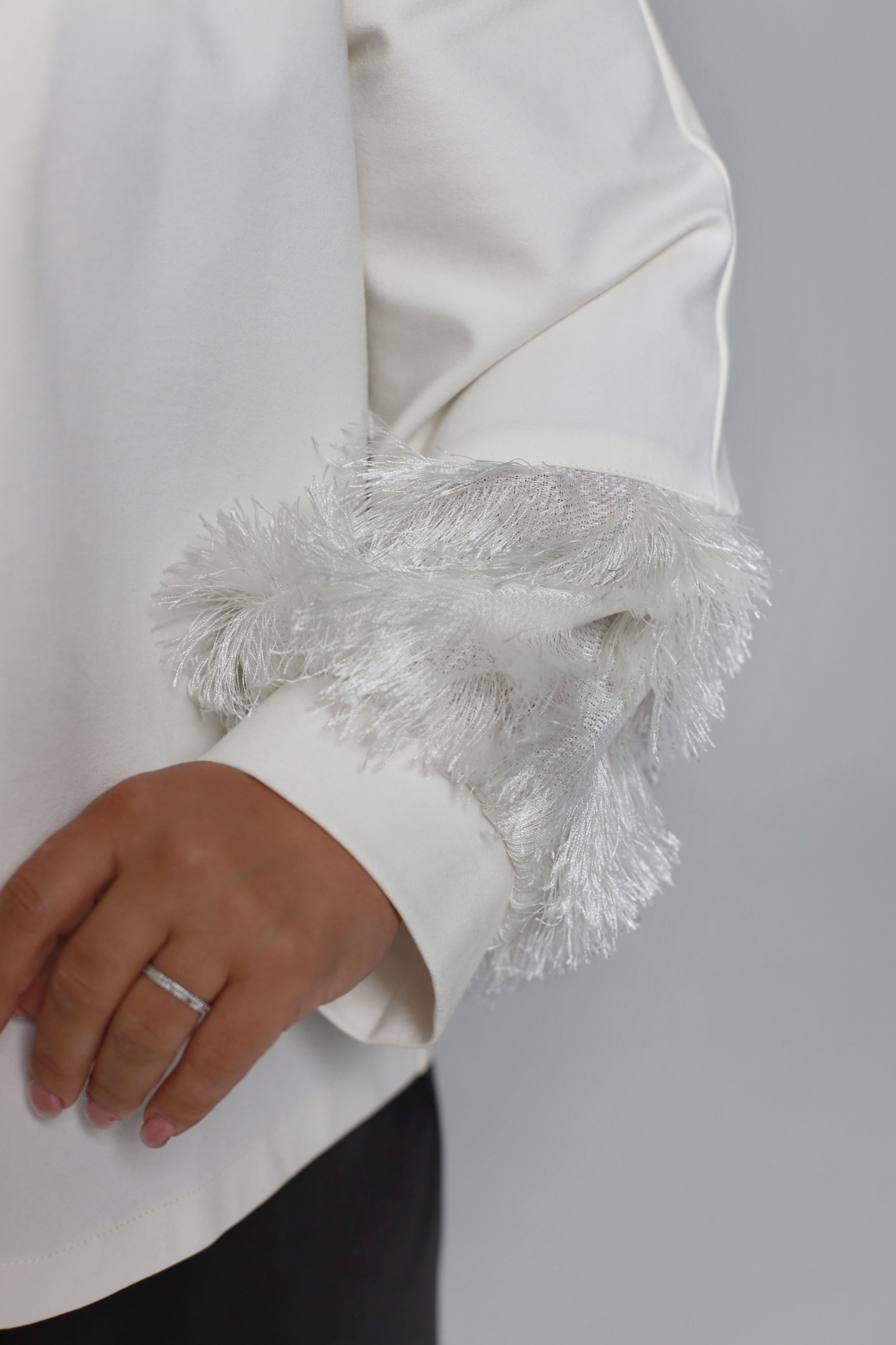 Болеро на кнопках с пушистой бахромой на рукавах белое