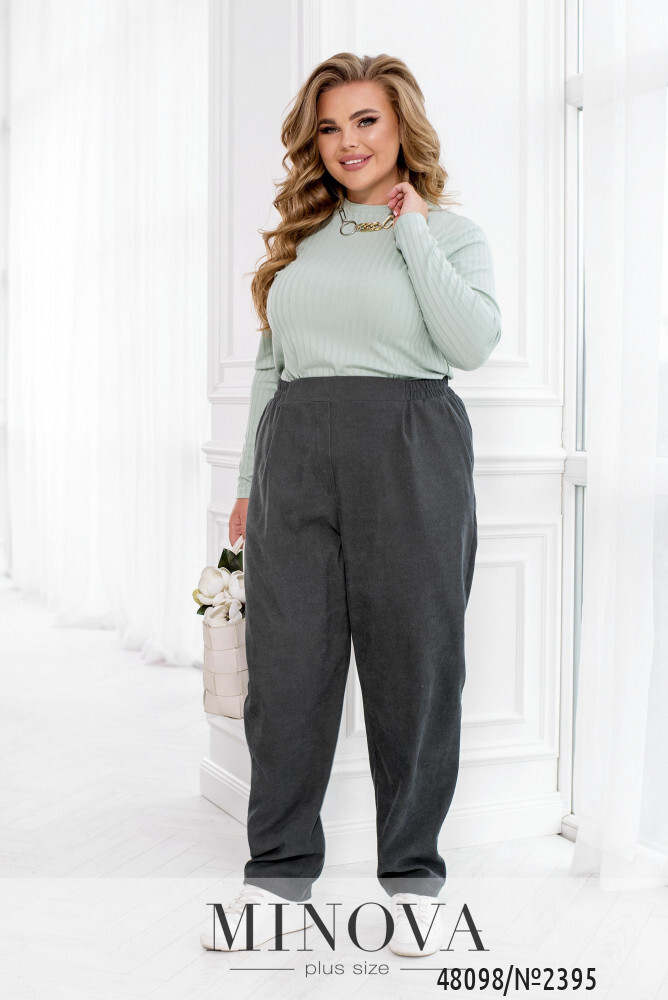 58-60 р-р: длина изделия брюк по внутреннему шву 74см, длина изделия брюк по внешнему шву с учетом пояса 106см, от - 92-116см, об -136см.