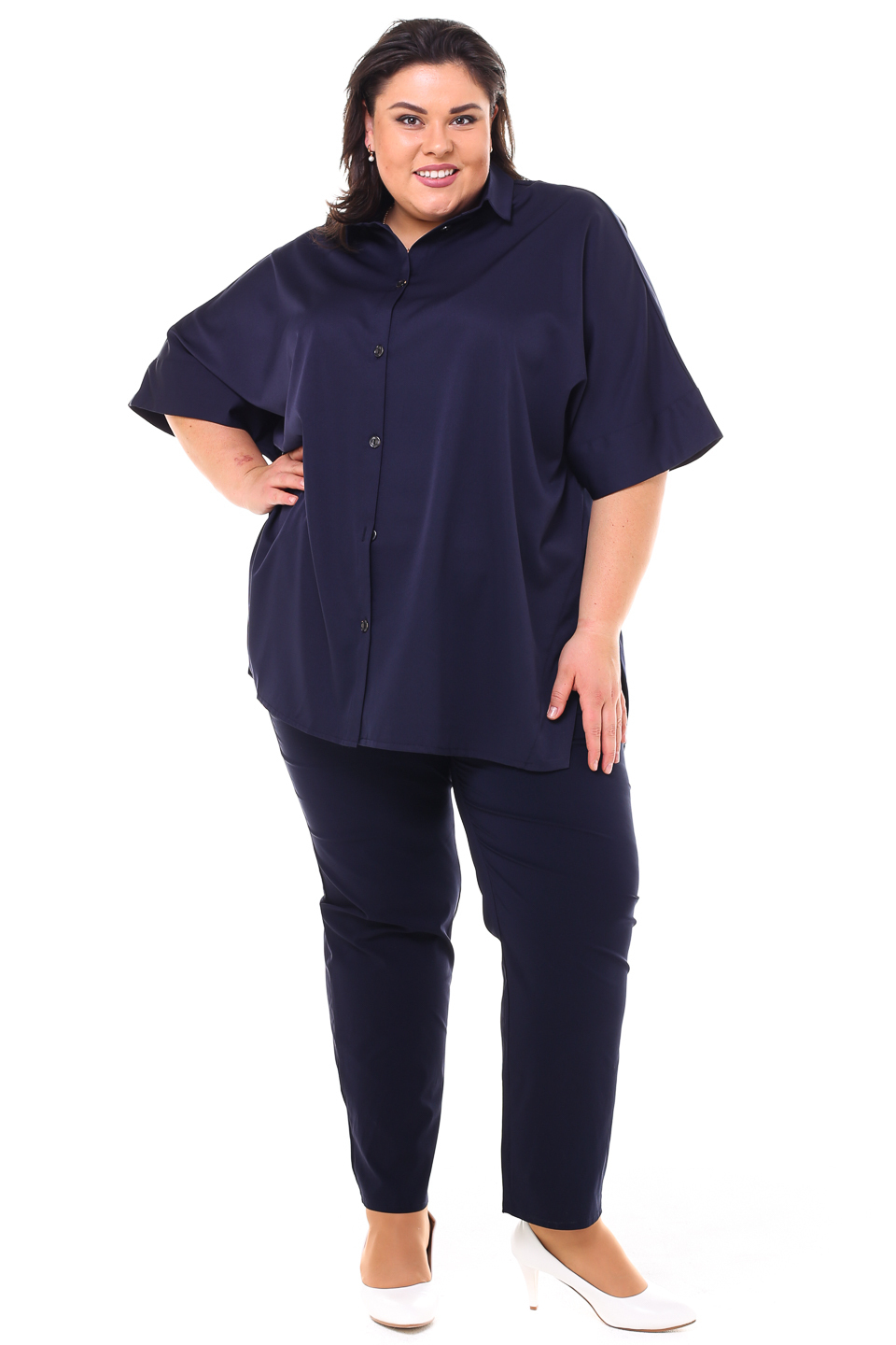 Брюки-стрейч прямого силуэта выполнены из мягкой легкой ткани. отлично сидят за счет эластичной резинки на поясе. карманы по бокам украшены пластиковыми пуговицами. модель с высокой посадкой не сковывает движений. слегка зауженные книзу брючины визуально стройнят.