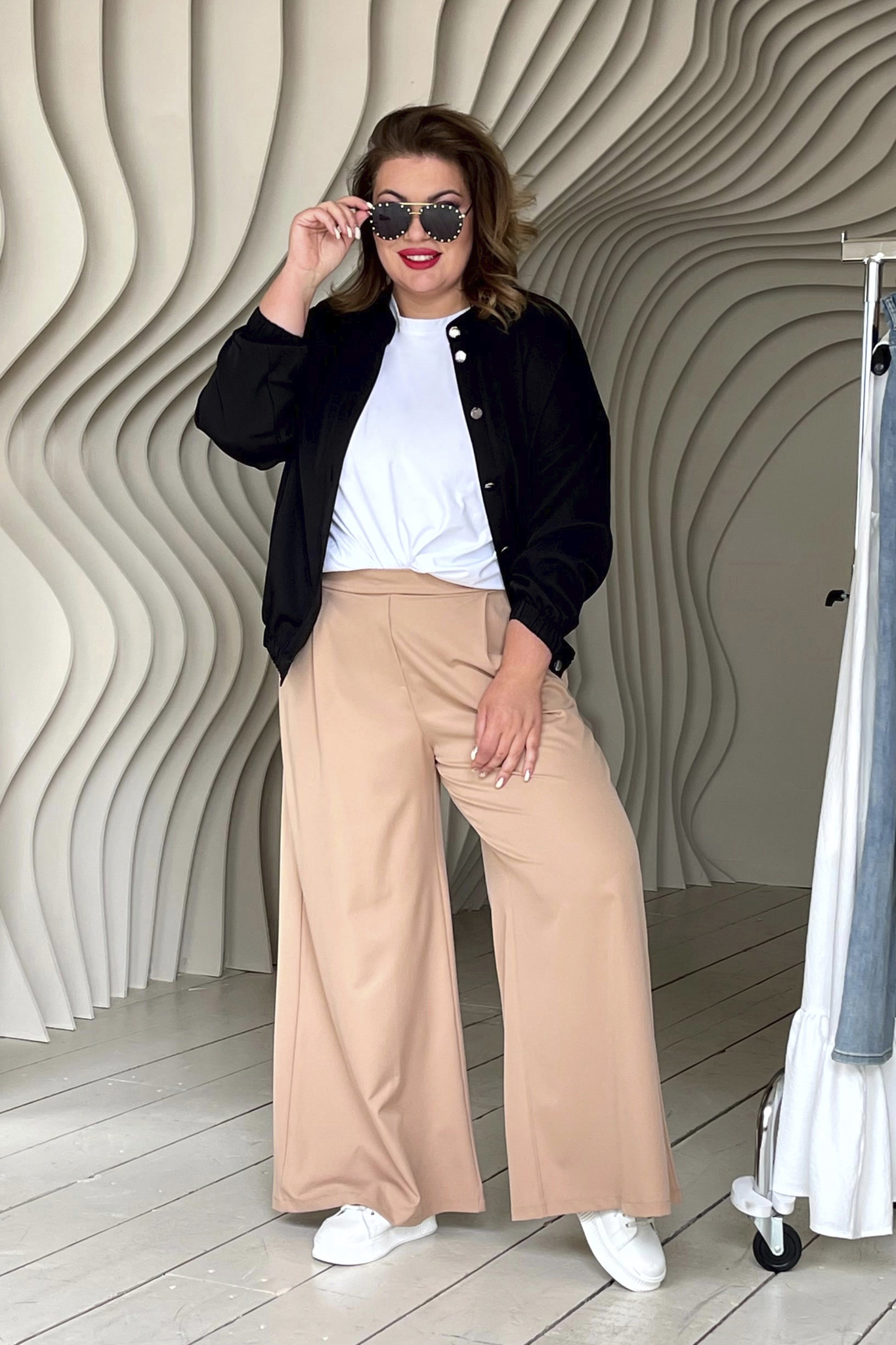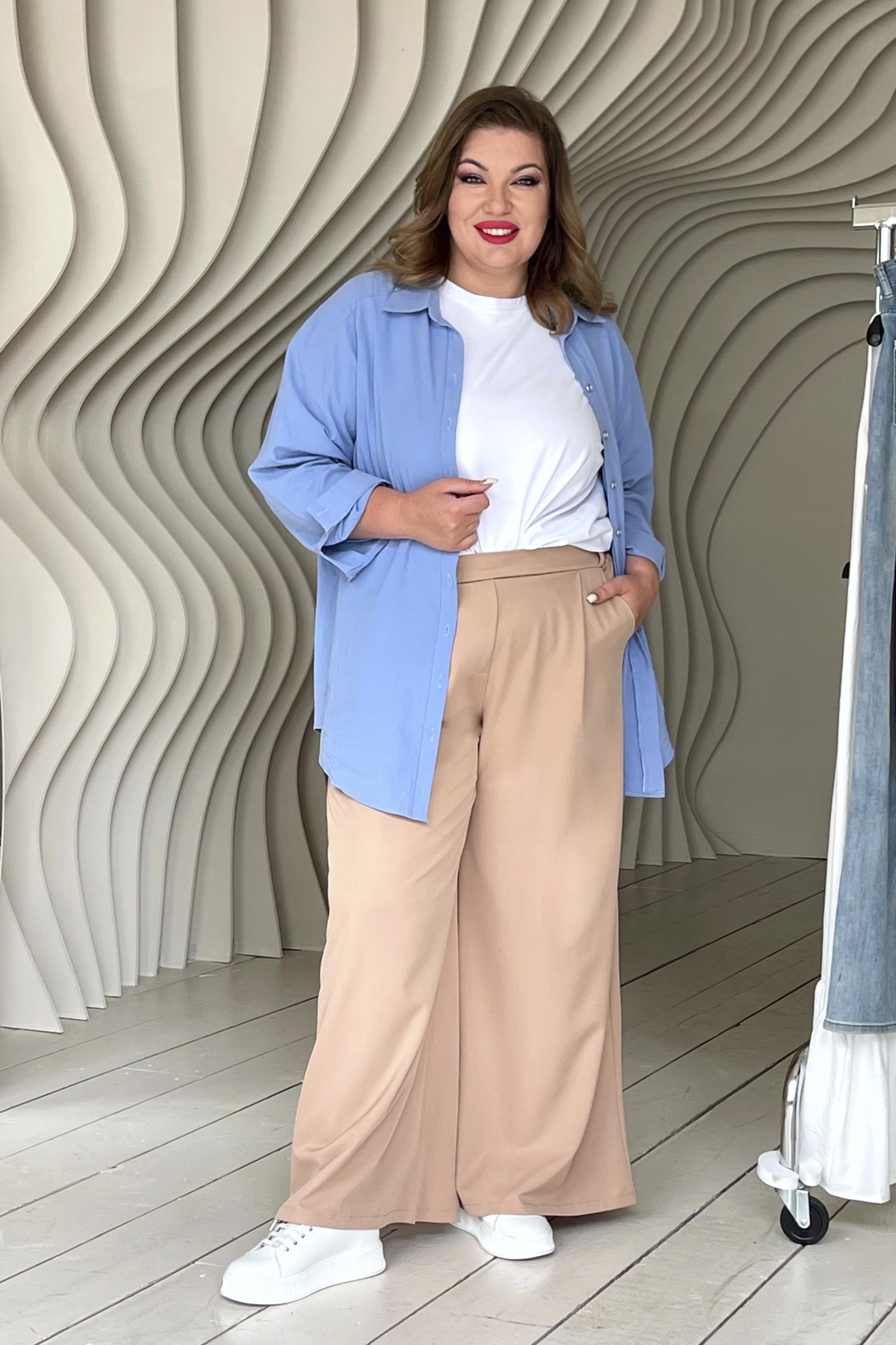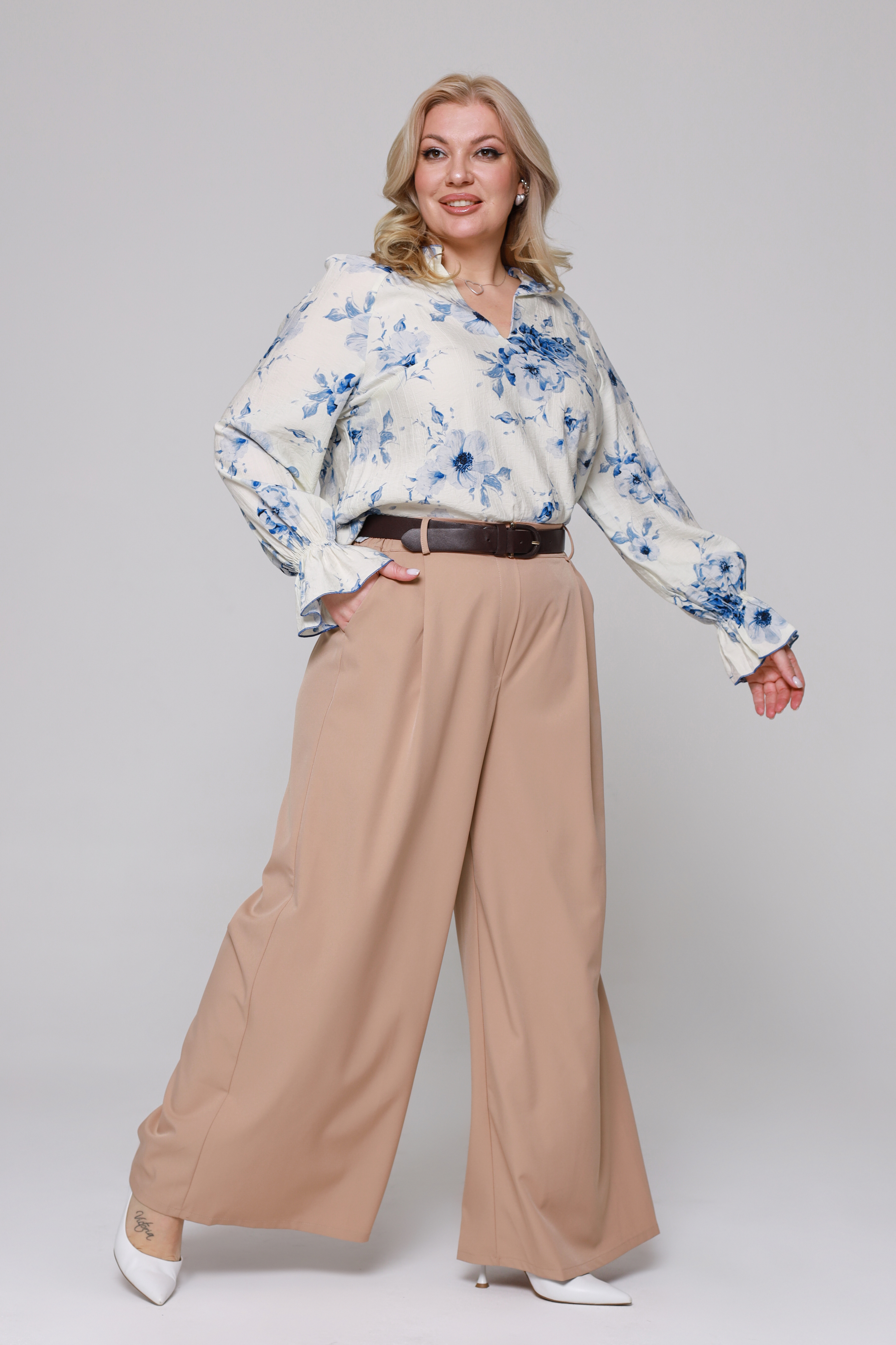 Оригинальные брюки свободного кроя из мягкого материала. имеют завышенную линию талии. брюки отлично сидят за счет комфортной резинки на поясе. модель привлекает внимание широким клешем, что добавляет модели оригинальности. по бокам практичные карманы. с помощью съемного пояса в тон можно выгодно обозначить талию. имеются шлёвки для поддержания пояса. подходят такие вещи представительницам прекрасного пола с разными типами фигуры. гламурные, легкие, выгодно подчеркивающие фигуру палаццо сделают вас заметной и выделит из толпы. для завершения стильного образа можно использовать туфли на высоких каблуках.