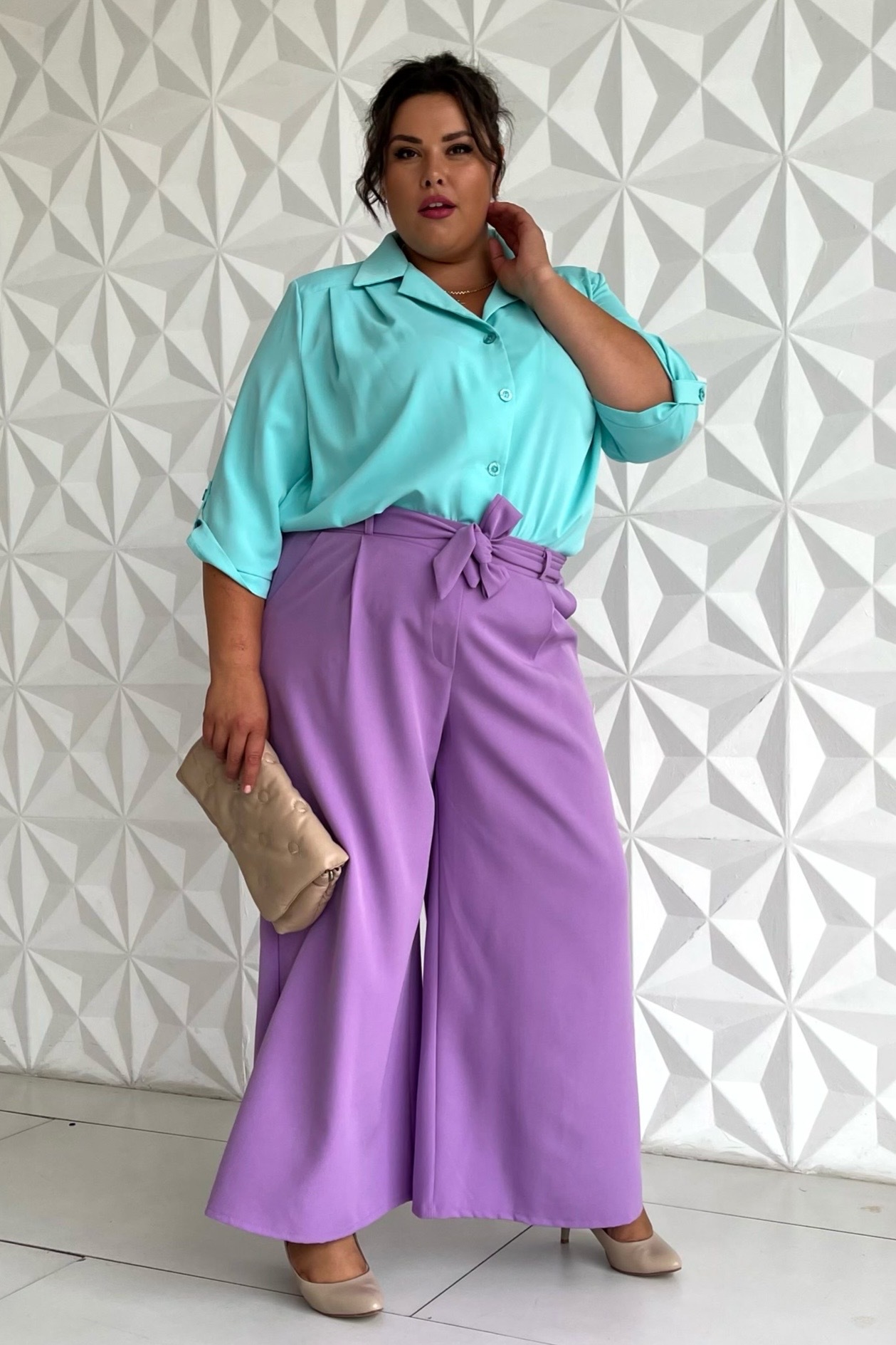Оригинальные брюки палаццо свободного кроя из мягкого материала имеют завышенную линию талии. брюки отлично сидят за счет комфортной резинки на поясе. модель привлекает внимание широким клешем, что добавляет модели оригинальности. по бокам практичные карманы. с помощью съемного пояса в тон можно выгодно обозначить талию. имеются шлёвки для поддержания пояса. подходят такие вещи представительницам прекрасного пола с разными типами фигуры. гламурные, легкие, выгодно подчеркивающие фигуру палаццо сделают вас заметной и выделит из толпы. для завершения стильного образа можно использовать туфли на высоких каблуках.