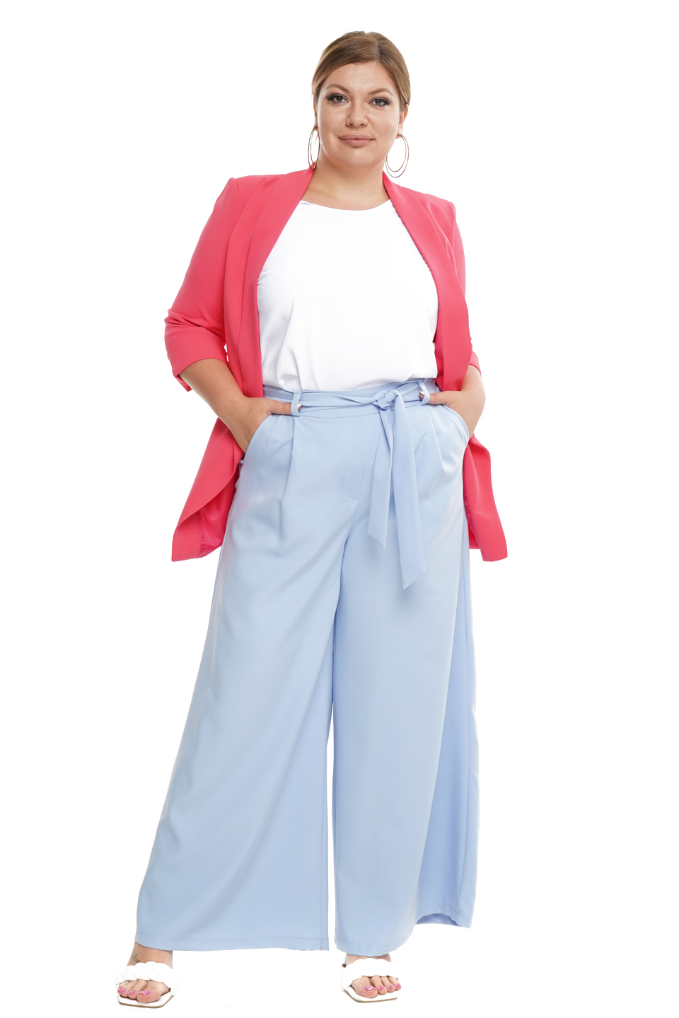 Оригинальные брюки палаццо свободного кроя из мягкого материала имеют завышенную линию талии. брюки отлично сидят за счет комфортной резинки на поясе. модель привлекает внимание широким клешем, что добавляет модели оригинальности. по бокам практичные карманы. с помощью съемного пояса в тон можно выгодно обозначить талию. имеются шлёвки для поддержания пояса. подходят такие вещи представительницам прекрасного пола с разными типами фигуры. гламурные, легкие, выгодно подчеркивающие фигуру палаццо сделают вас заметной и выделит из толпы. для завершения стильного образа можно использовать туфли на высоких каблуках.