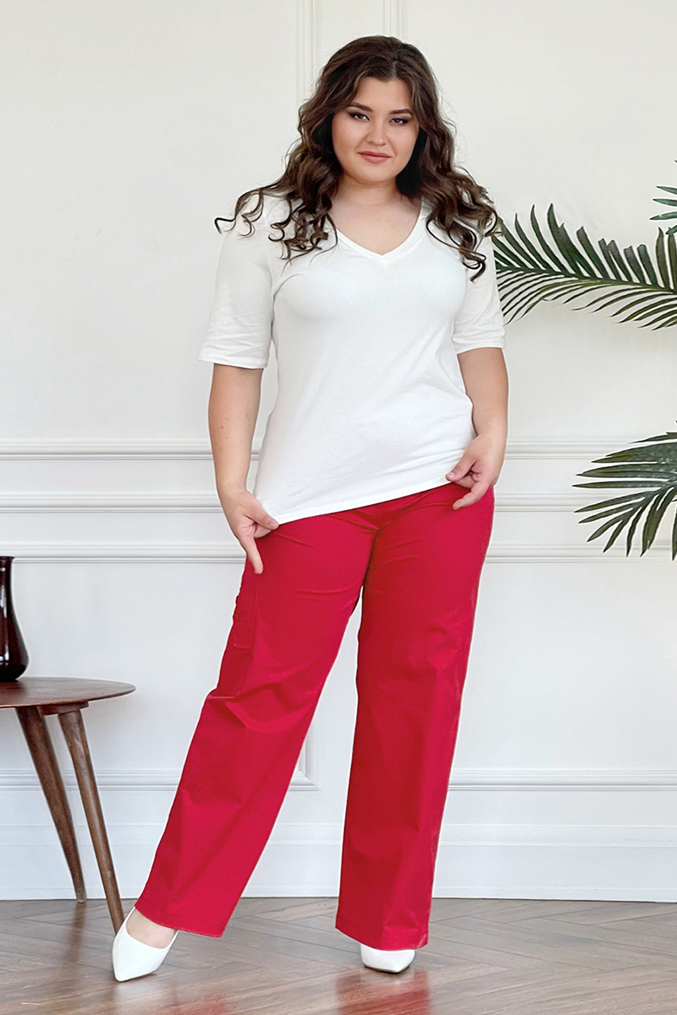 Комфортные брюки-карго свободного силуэта выполнены из мягкого материала. брюки отлично сидят за счет эластичной резинки на поясе. модель с комфортной высотой линии талии не сковывает движений. расклешенные книзу брючины визуально стройнят и зрительно вытягивают силуэт. боковые карманы, оформленные клапанами, и боковой карман на брючине сбоку добавляют практичности. брюки прекрасно подойдут для комбинирования с водолазками, свитерами, блузками и рубашками. эти модные брюки станут идеальным вариантом для создания стильного образа.