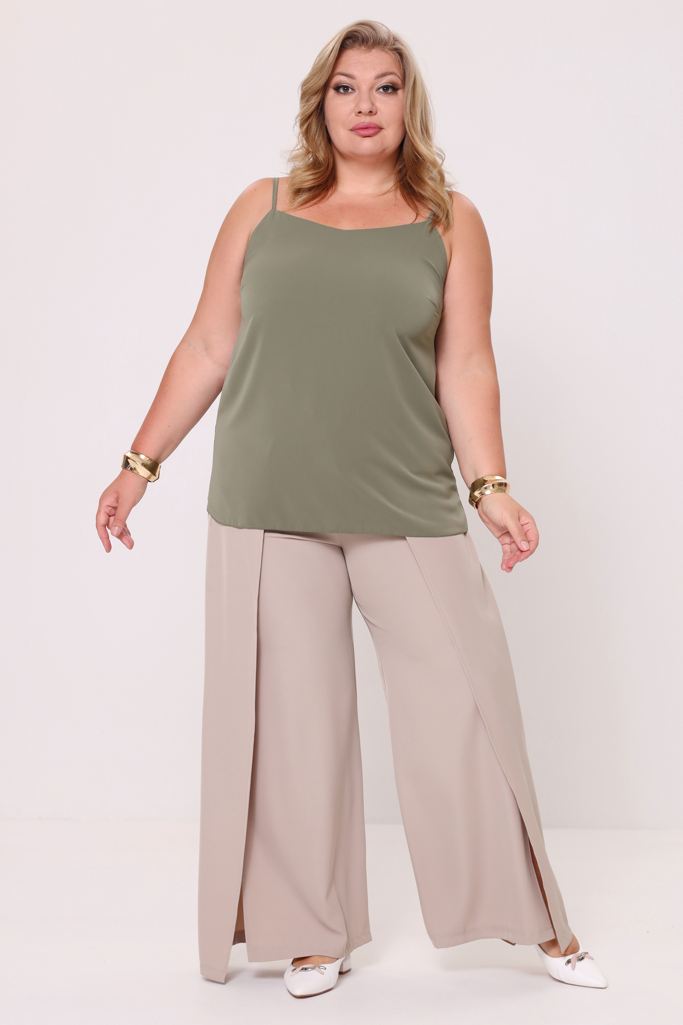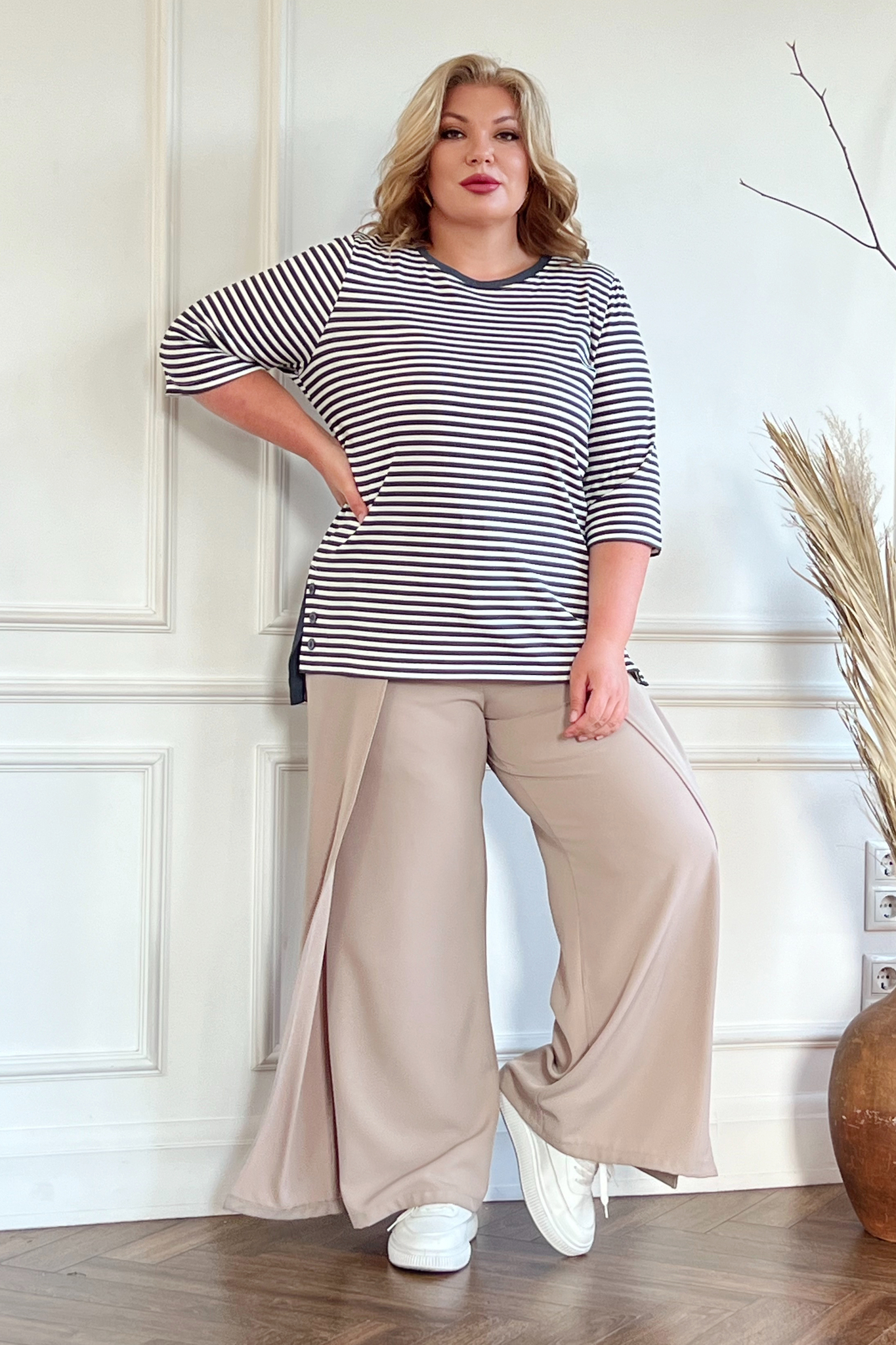 Элегантные брюки из мягкого струящегося материала. высокая посадка и комфортная резинка на поясе обеспечивают оптимальную посадку по фигуре. оригинальный асимметричный запах по бокам собирается спереди с помощью завязки. небольшие разрезы спереди добавляют женственности и кокетства. брюки подчеркивают женственные формы и скрывают недостатки фигуры. модель прекрасно подойдёт для комбинирования с блузками, рубашками, топами и жакетами. эти модные брюки станут идеальным вариантом для создания стильного образа.