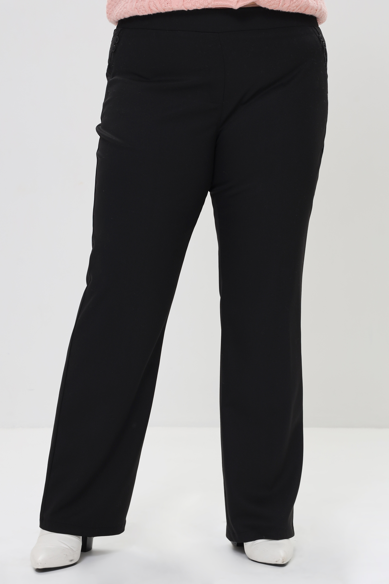 Брюки-стрейч прямого силуэта выполнены из мягкой ткани. по бокам и сзади декоративные карманы с пуговицами. отлично сидят за счет эластичной резинки на поясе. модель с комфортной высотой линии талии не сковывает движений. слегка зауженные книзу брючины со стрелками визуально стройнят.