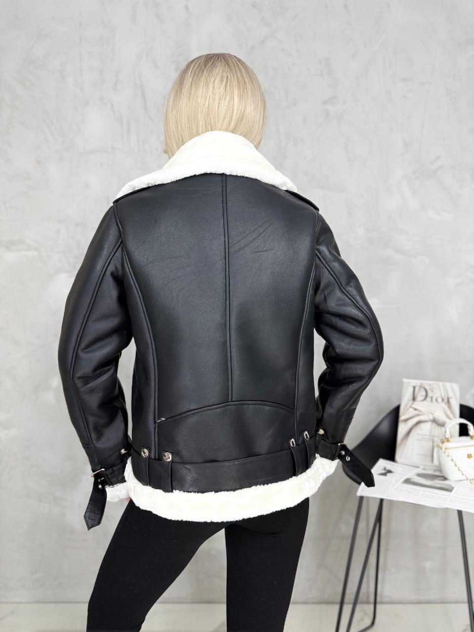 модная чёрная косуха на белом меху (дубленка с двойными карманами на молниях и поясом внизу)
