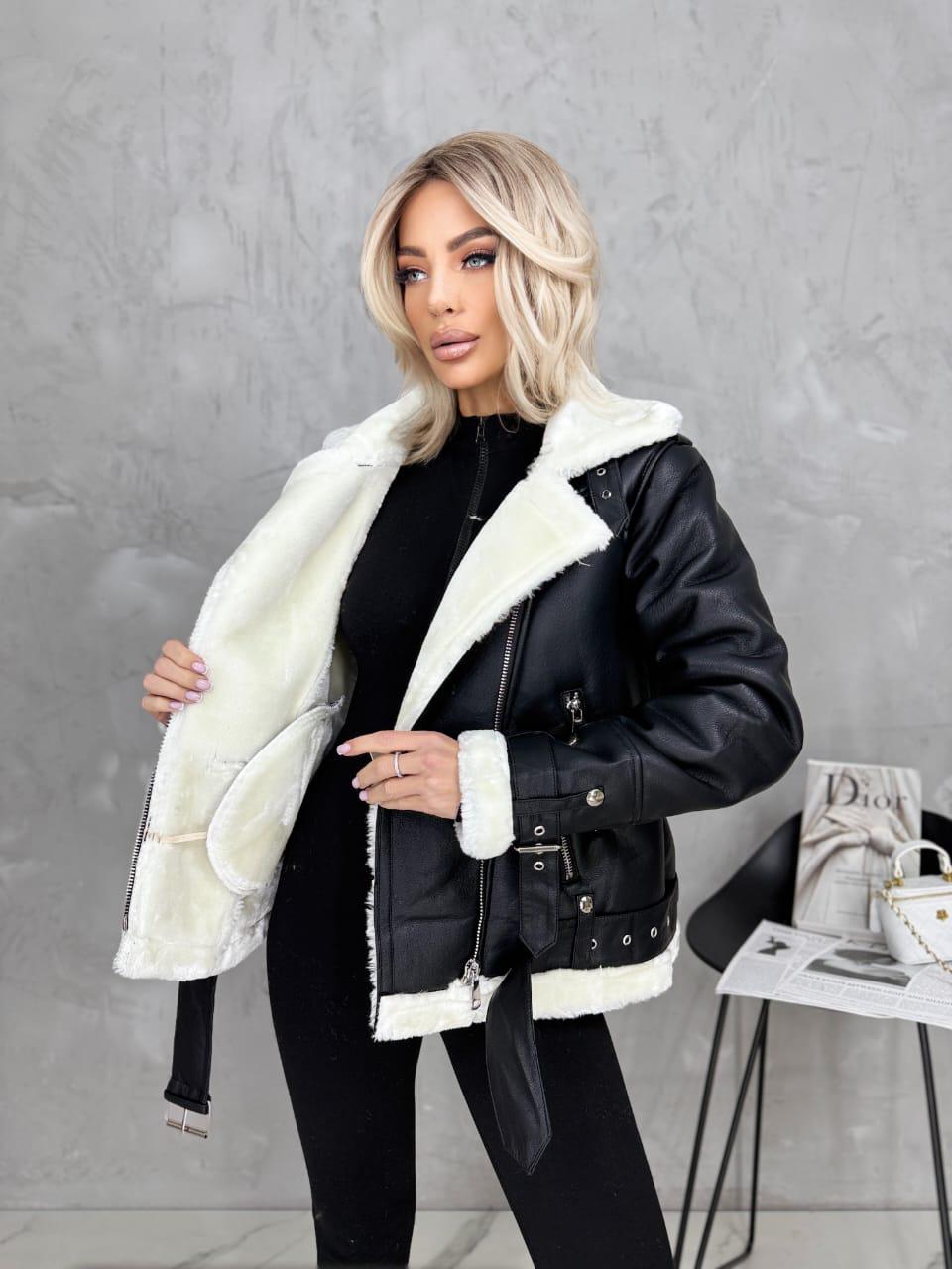 модная чёрная косуха на белом меху (дубленка с двойными карманами на молниях и поясом внизу)