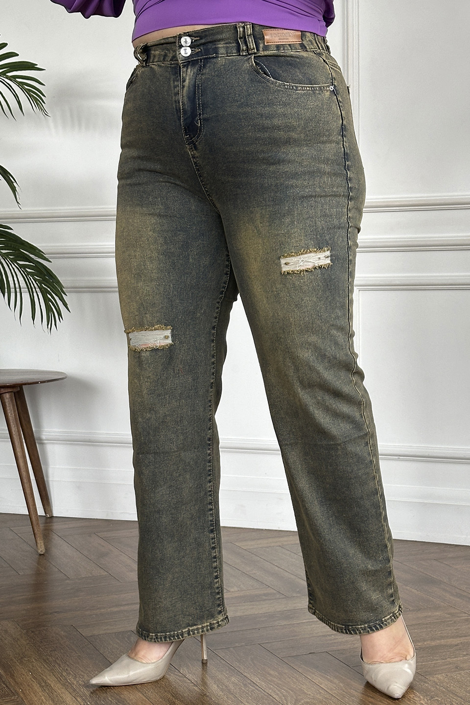 Элегантные брюки из мягкой джинсовой ткани с добавлением стрейча. модель отлично сидит за счет притачного пояса и кокетки по спинке. боковые карманы с отрезным бочком и задние накладные карманы добавляют модели практичности и функциональности. модель с комфортной посадкой не сковывает движений. брюки привлекают внимание широким клешем, которые зрительно вытягивают силуэт. модель застегивается спереди на пуговицу и скрытую молнию. рванный эффект по переду брючин добавляют оригинальности. комфортные джинсы - отличная база для создания разнообразных образов. их могут смело носить как юные, спортивные барышни, так и изысканные дамы в возрасте. правильно подобрав аксессуары, можно создавать смелые, утонченно женственные, строгие, деловые образы. (во избежание окраски при первой носке, удалить с ткани новых джинсов излишки пигмента поможет легкая стирка с одним из закрепителей цвета (пищевой соды, уксуса, лимонной кислоты).