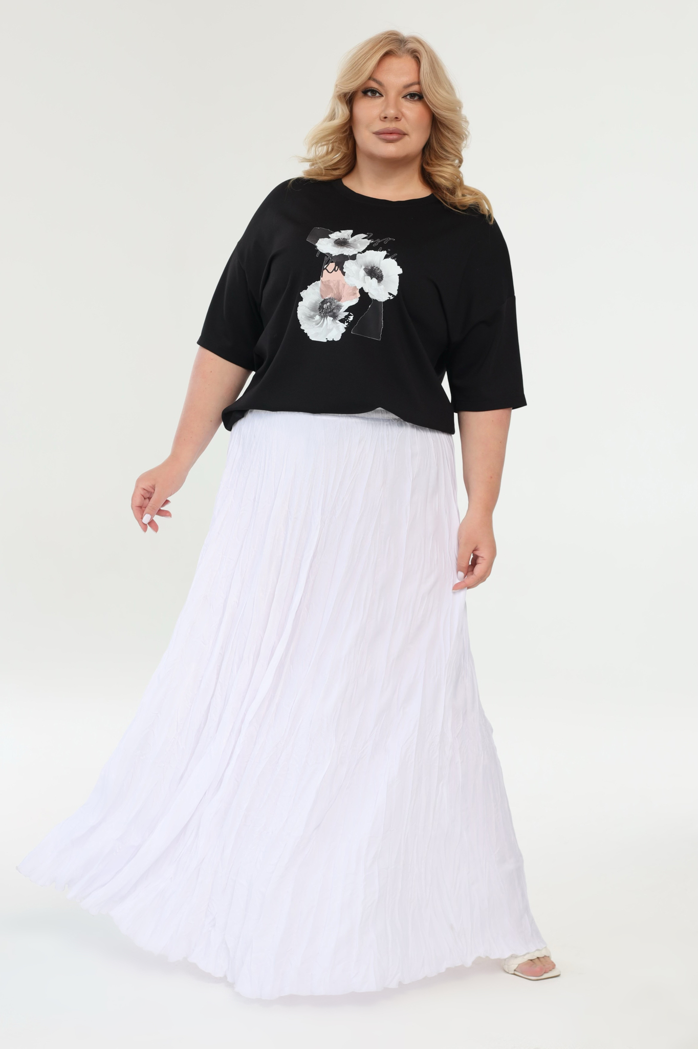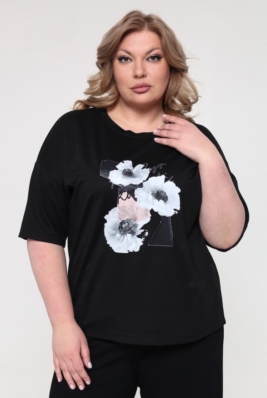 Футболка прямого кроя из мягкого трикотажа. модель имеет круглый вырез с узким кантом и короткие приспущенные рукава. свободный силуэт искусно обыгрывает фигуру и не сковывает движений. актуальная шелкография на груди освежает образ и добавляет нарядности. модель легко сочетается с любым низом, поэтому скомбинировать чудесный и стильный образ с легинсами, брюками, шортами и джинсами не составит труда.
