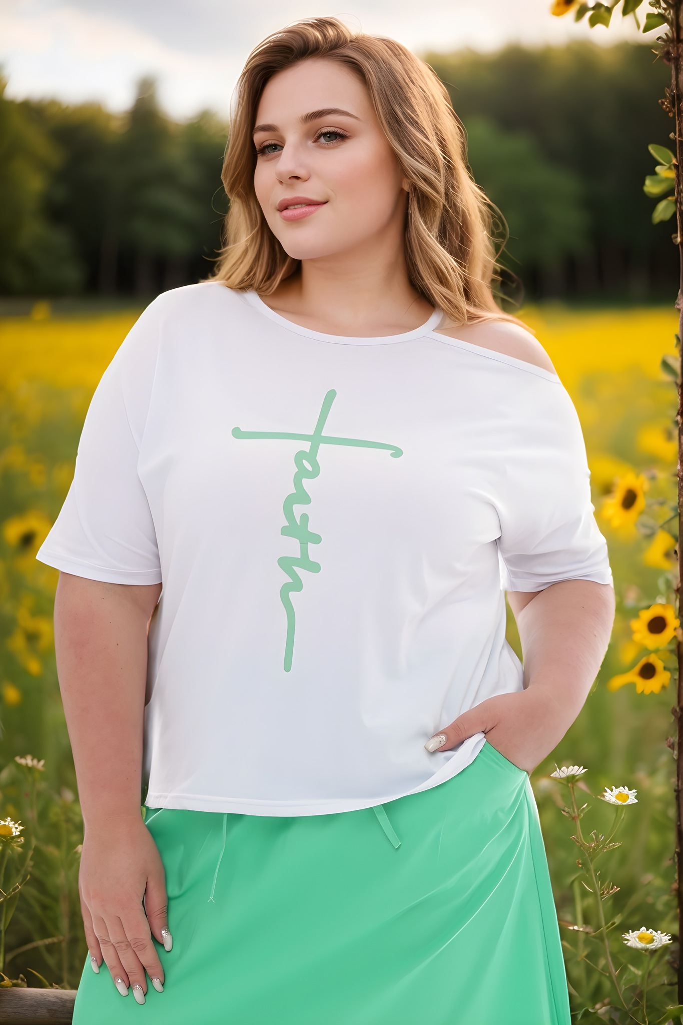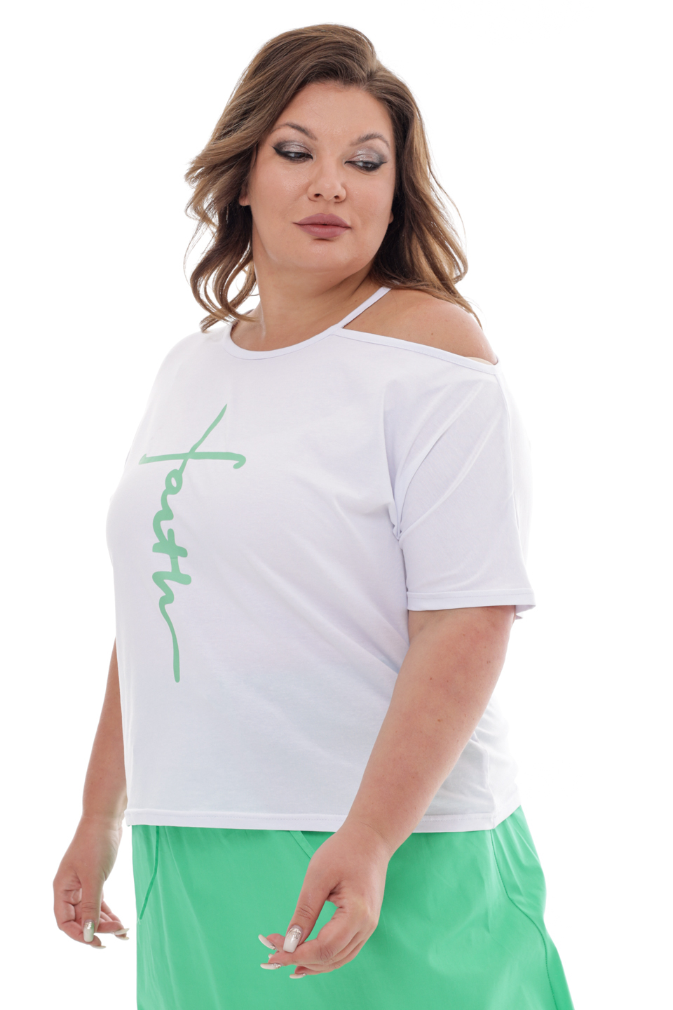 Футболка с вырезом на плече с ярко-зеленой надписью белая