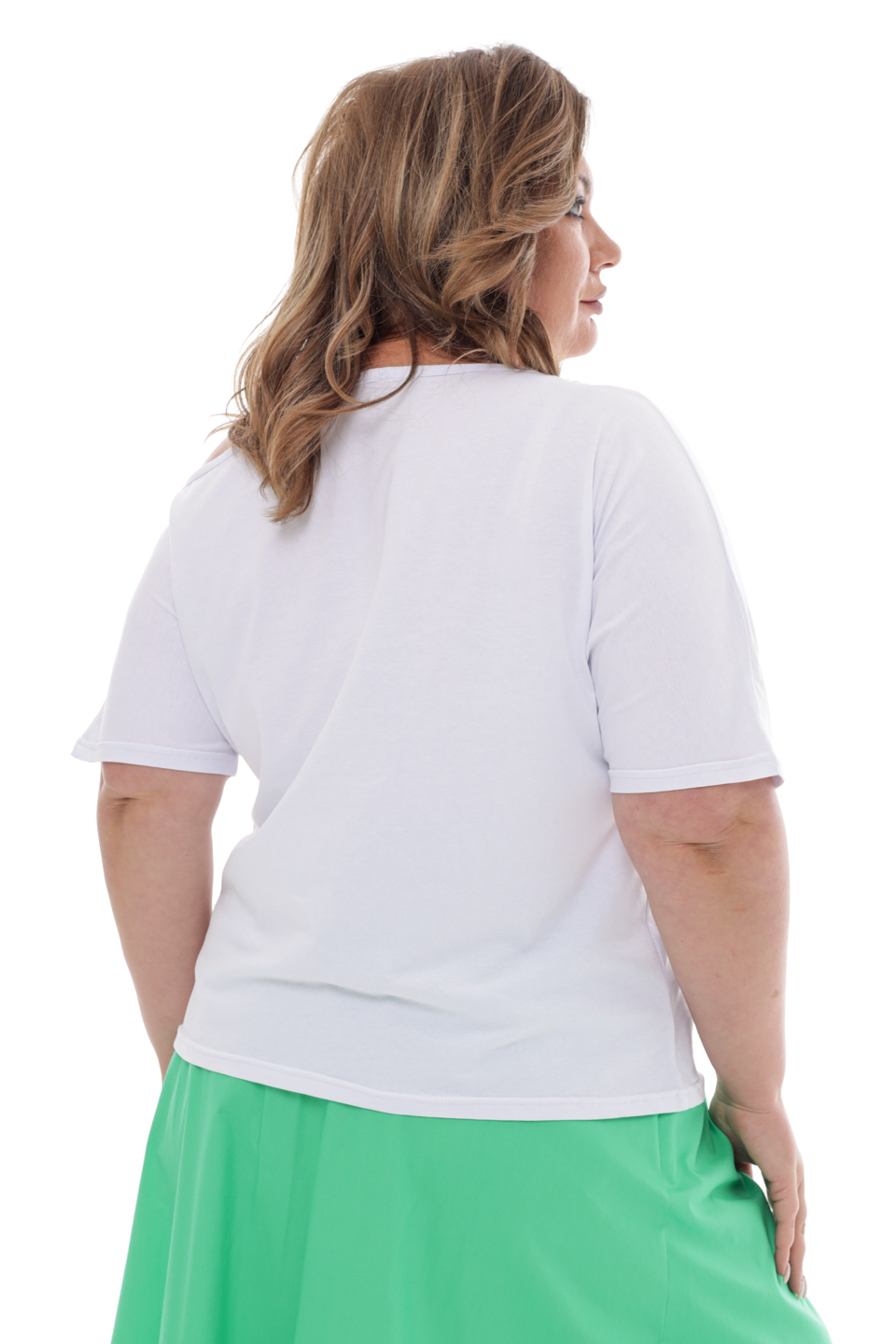 Футболка прямого кроя из мягкого трикотажа. круглый вырез по краям декорирован узким кантом. короткие цельнокроеные рукава, с одной стороны, оформлены вырезом на плечах, что добавляет модели женственности и романтизма. оригинальная шелкография по переду освежает образ. свободный силуэт искусно обыгрывает фигуру и не сковывает движений. модель легко сочетается с любым низом, поэтому скомбинировать чудесный и стильный образ с юбками, брюками, шортами и джинсами не составит труда.