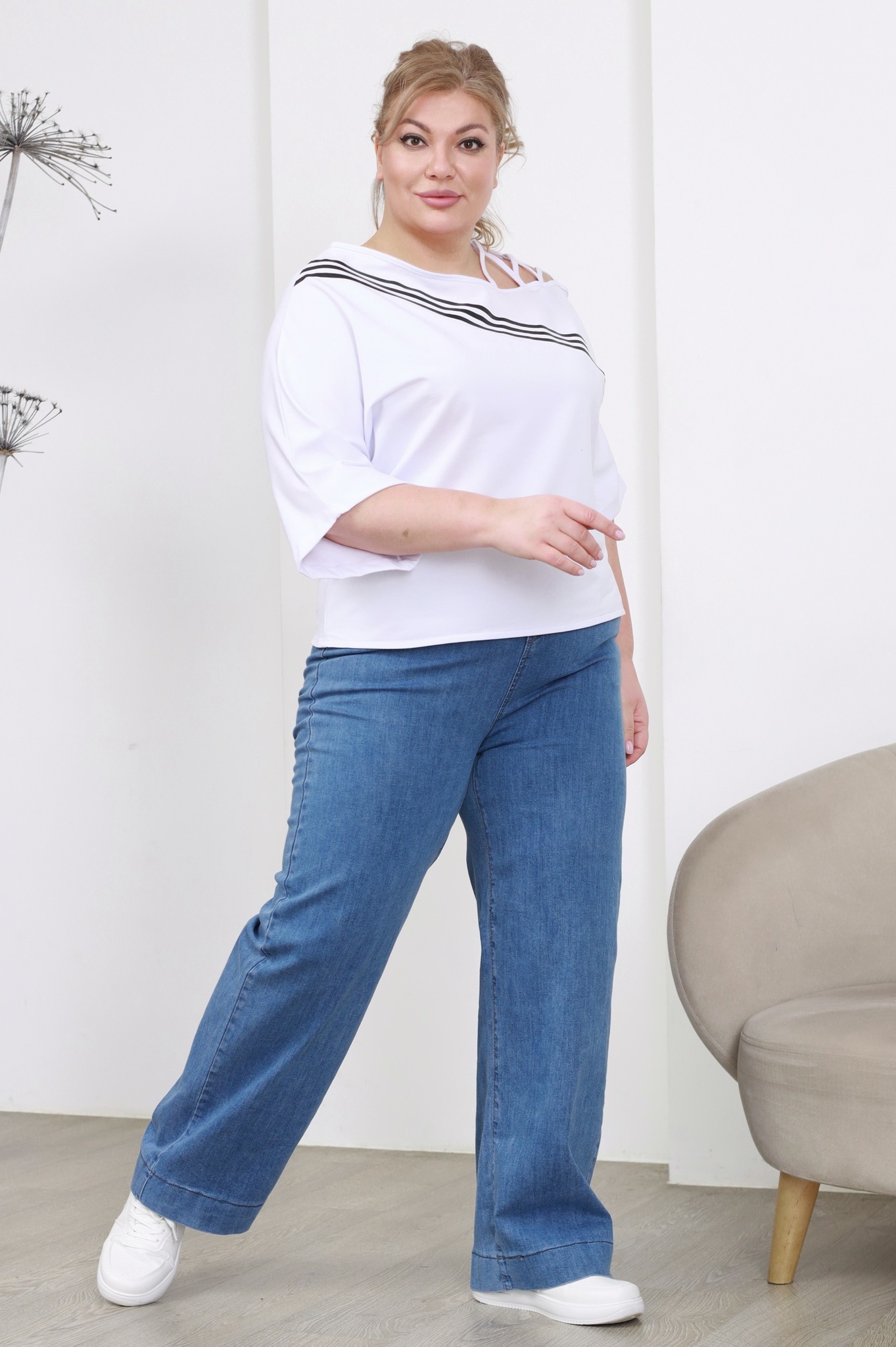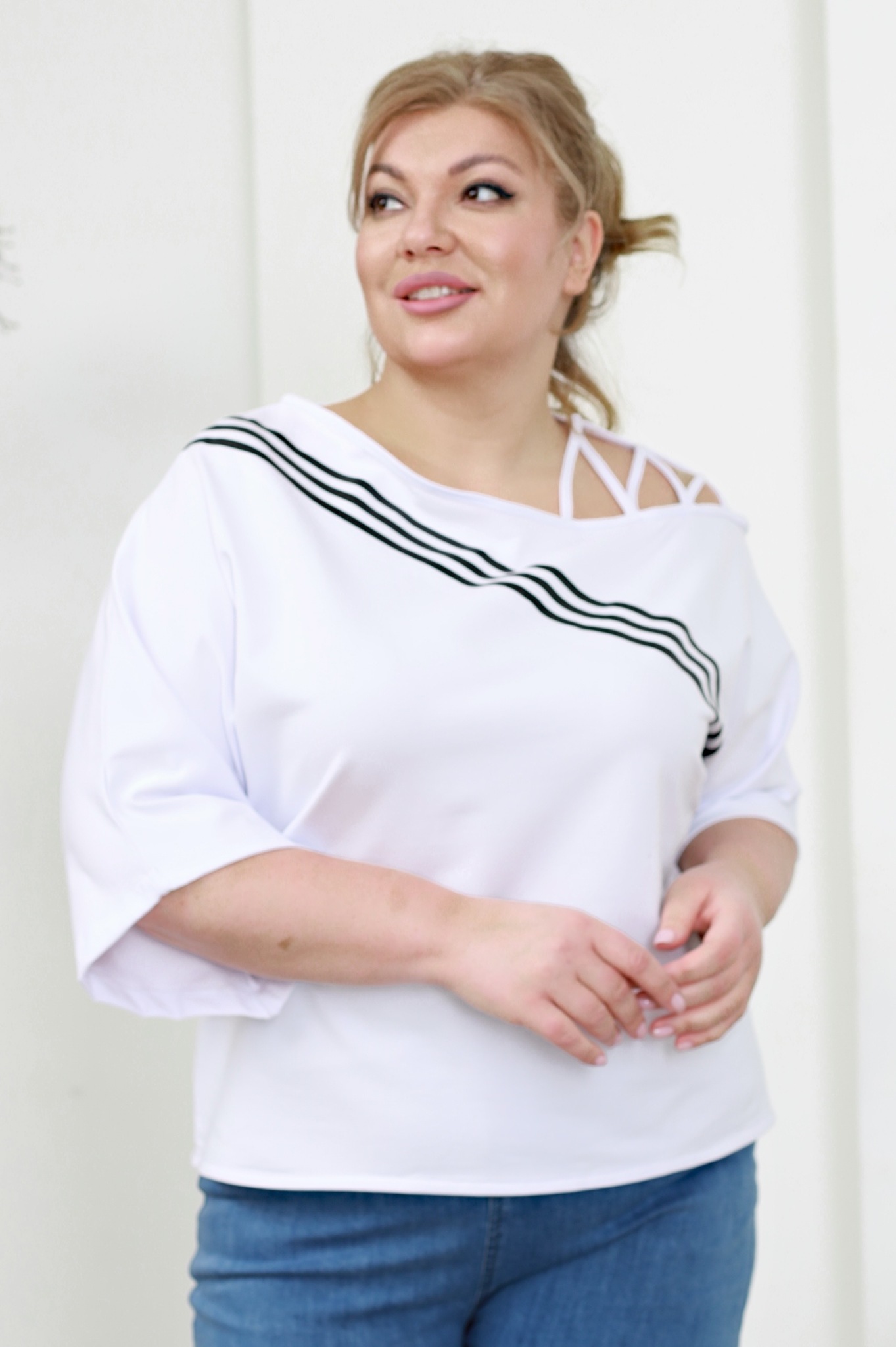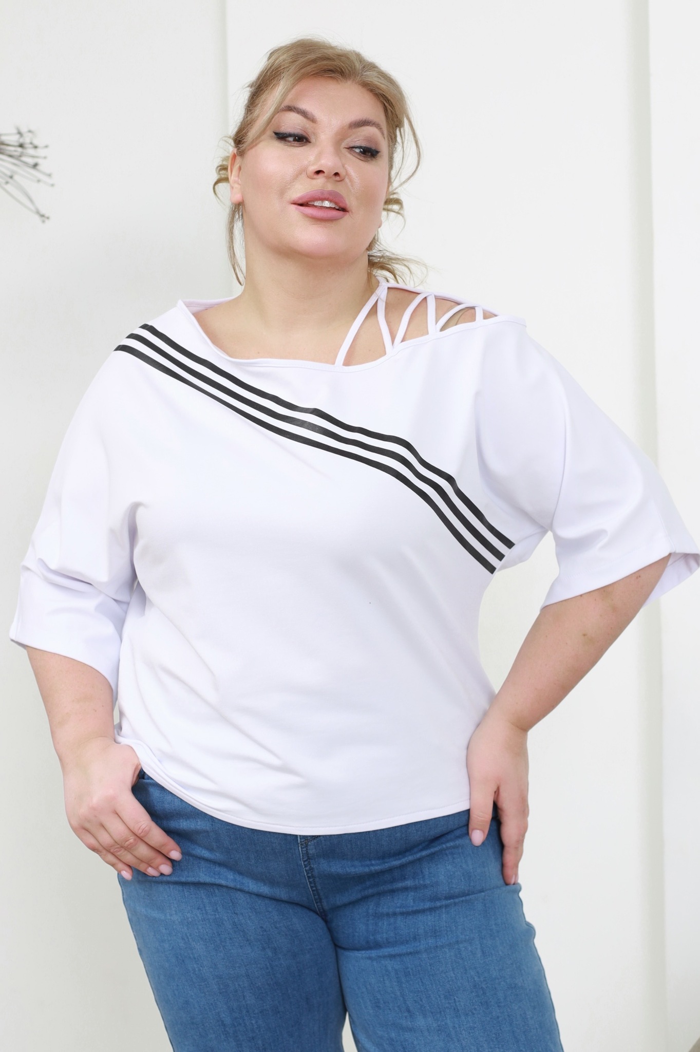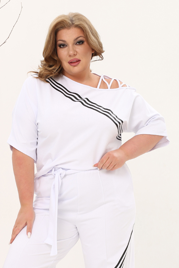 Футболка свободного силуэта искусно обыгрывает фигуру и не сковывает движений. имеет круглый вырез и цельнокроеные рукава длиной 3/4. кокетливый вырез на плечах оригинально декорирован ремешками. контрастные полосы освежают образ. костюм отлично подойдёт для прогулок в прохладную погоду.