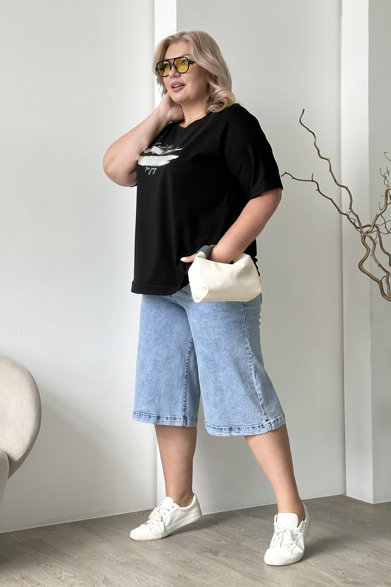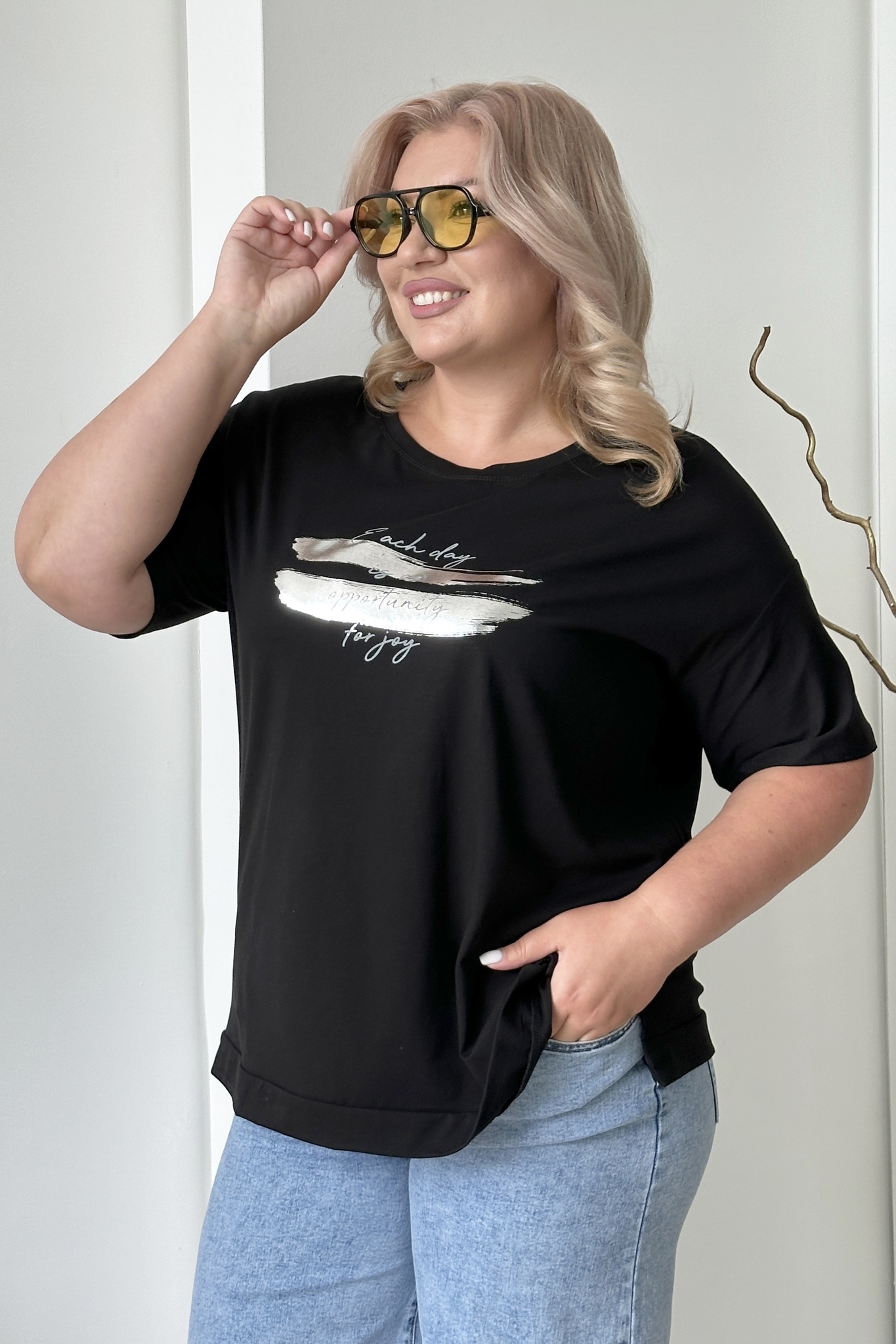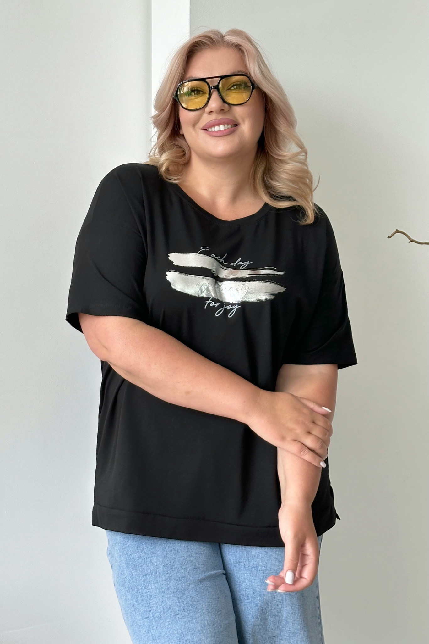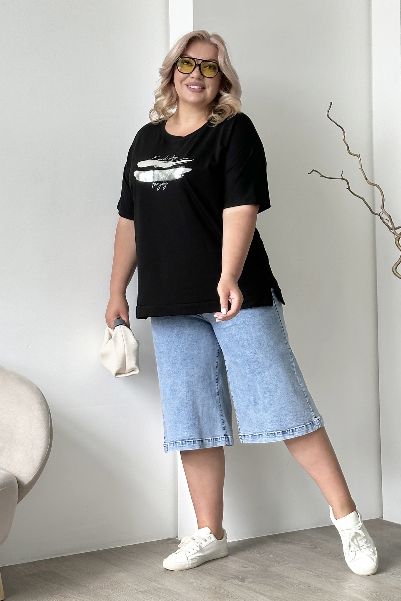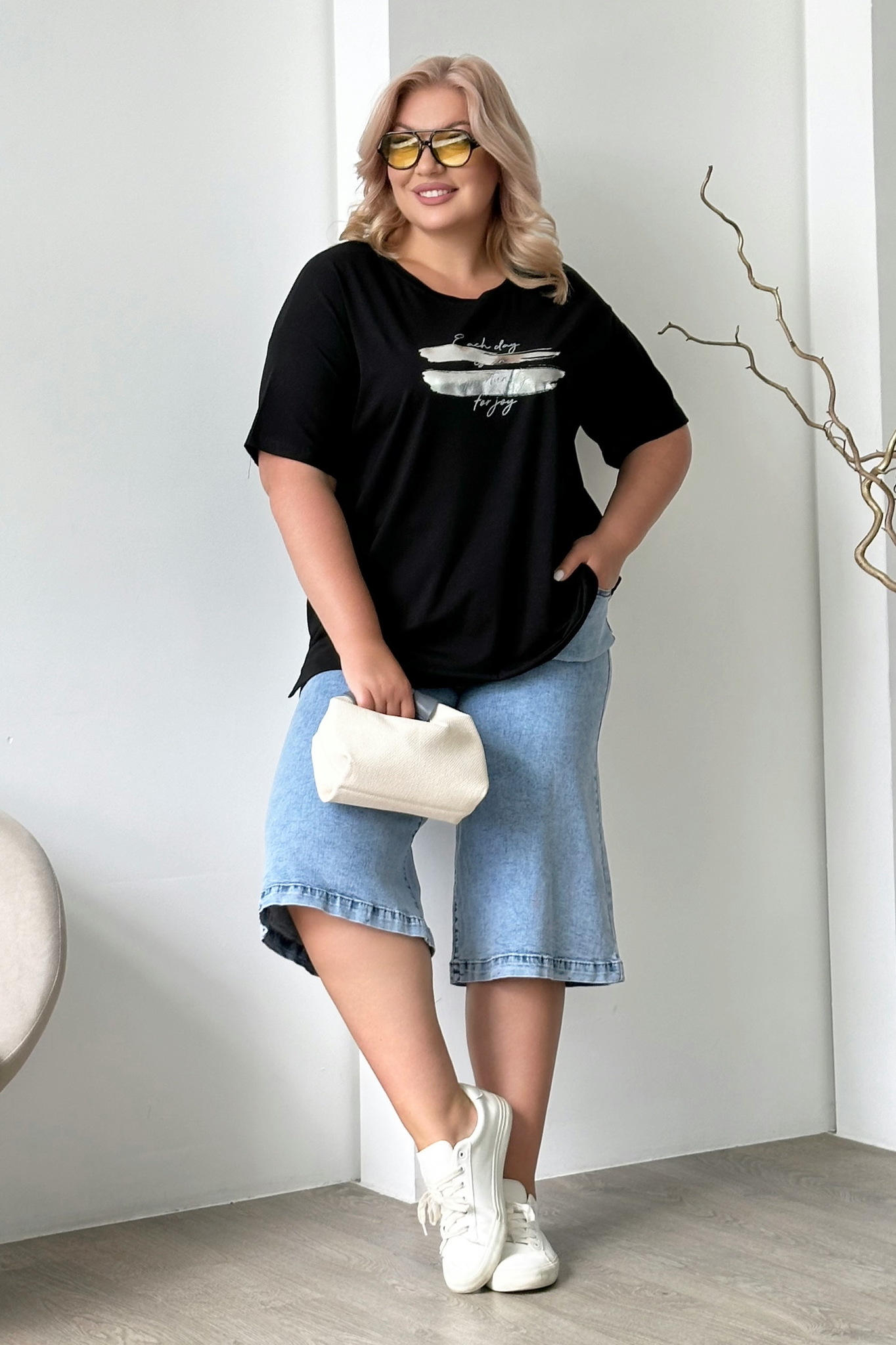 Футболка с серебристыми разводами и надписью черная Длина изделия 50 размера по спинке - 92 см. в каждом следующем размере длина увеличивается. Параметры модели: Рост 173 см, Размер 54