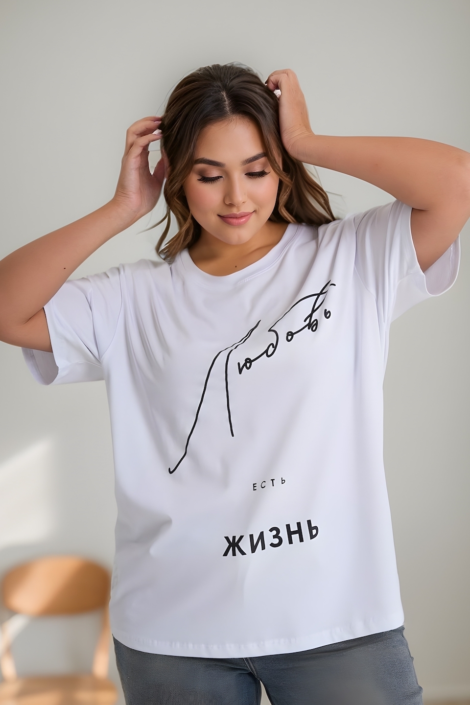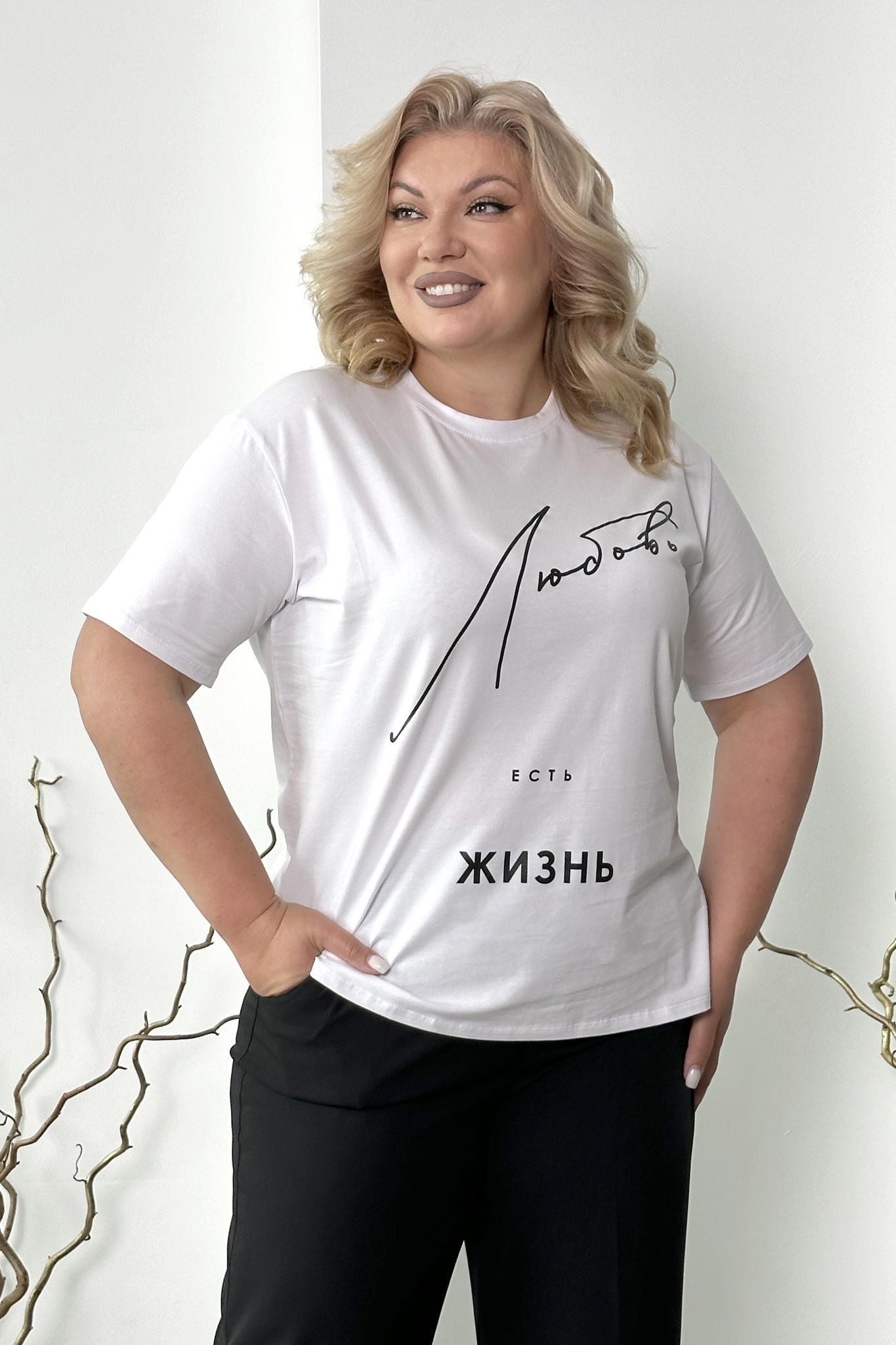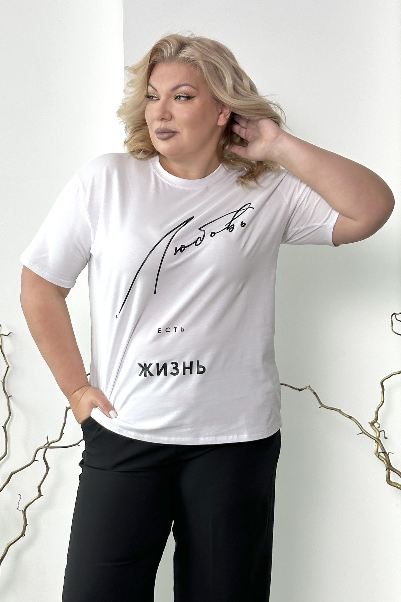 Футболка прямого кроя из мягкого трикотажа. модель имеет круглый вырез с узким кантом и короткие приспущенные рукава. свободный силуэт искусно обыгрывает фигуру и не сковывает движений. актуальная надпись на груди освежает образ и добавляют нарядности. модель легко сочетается с любым низом, поэтому скомбинировать чудесный и стильный образ с легинсами, брюками, шортами и джинсами не составит труда.