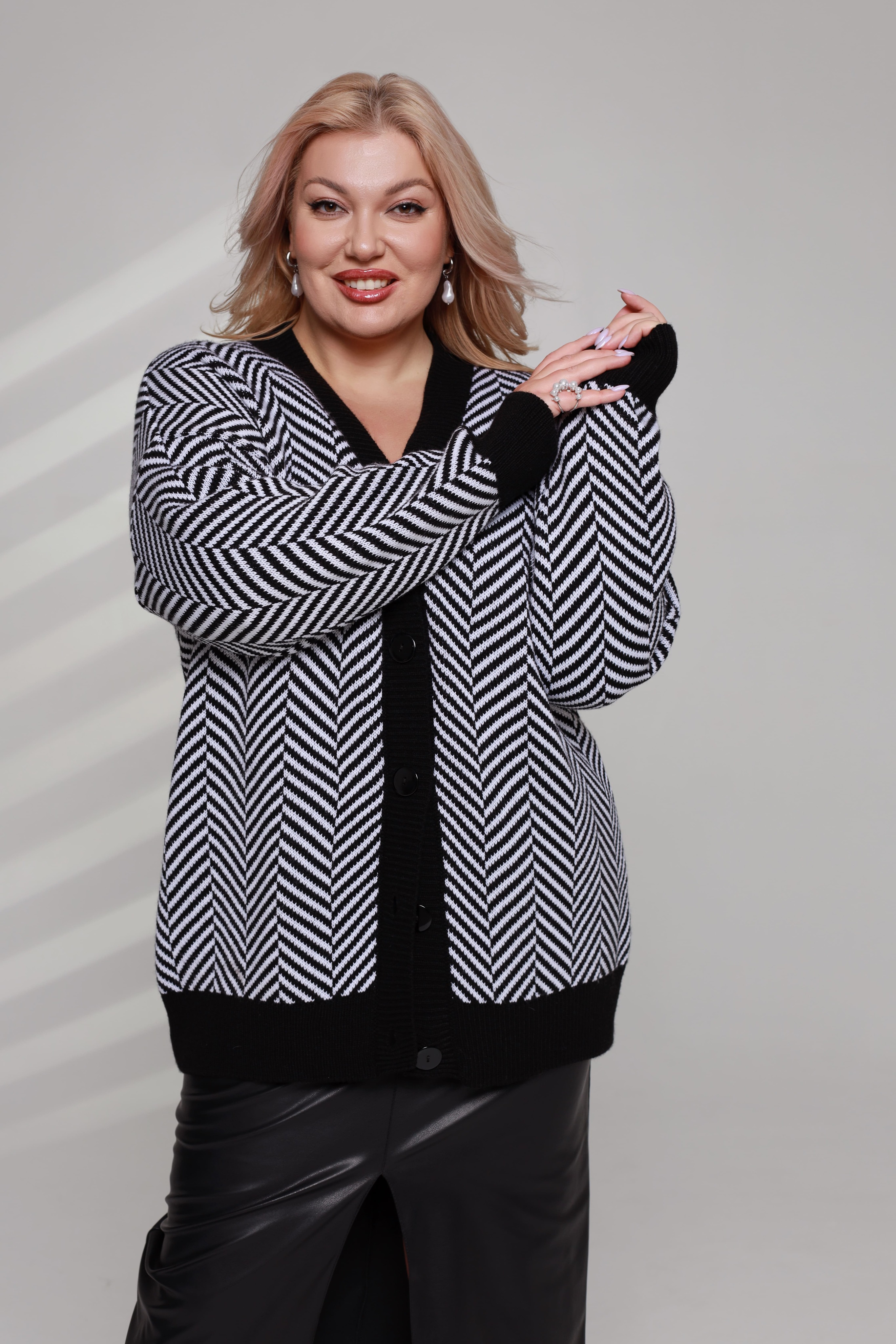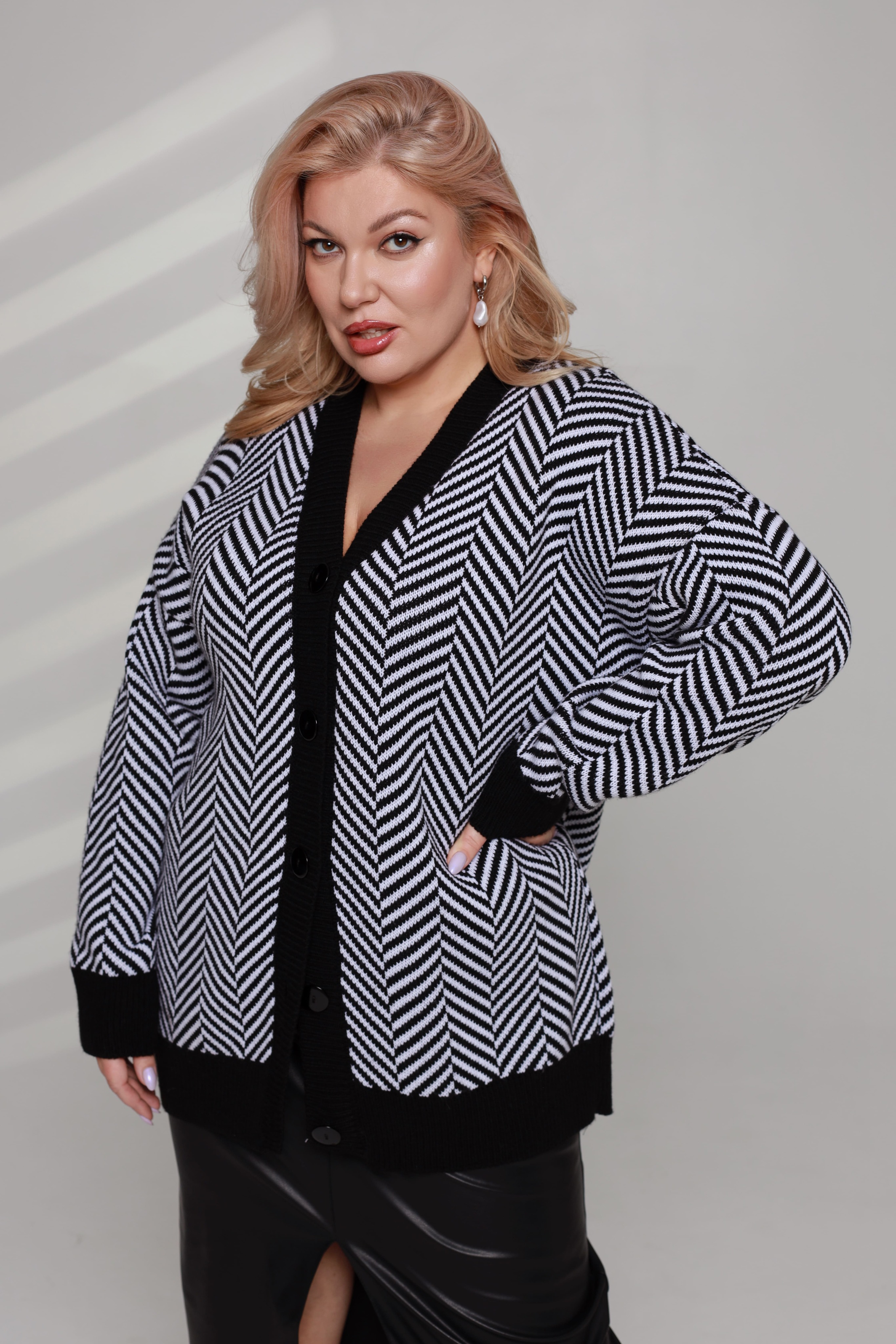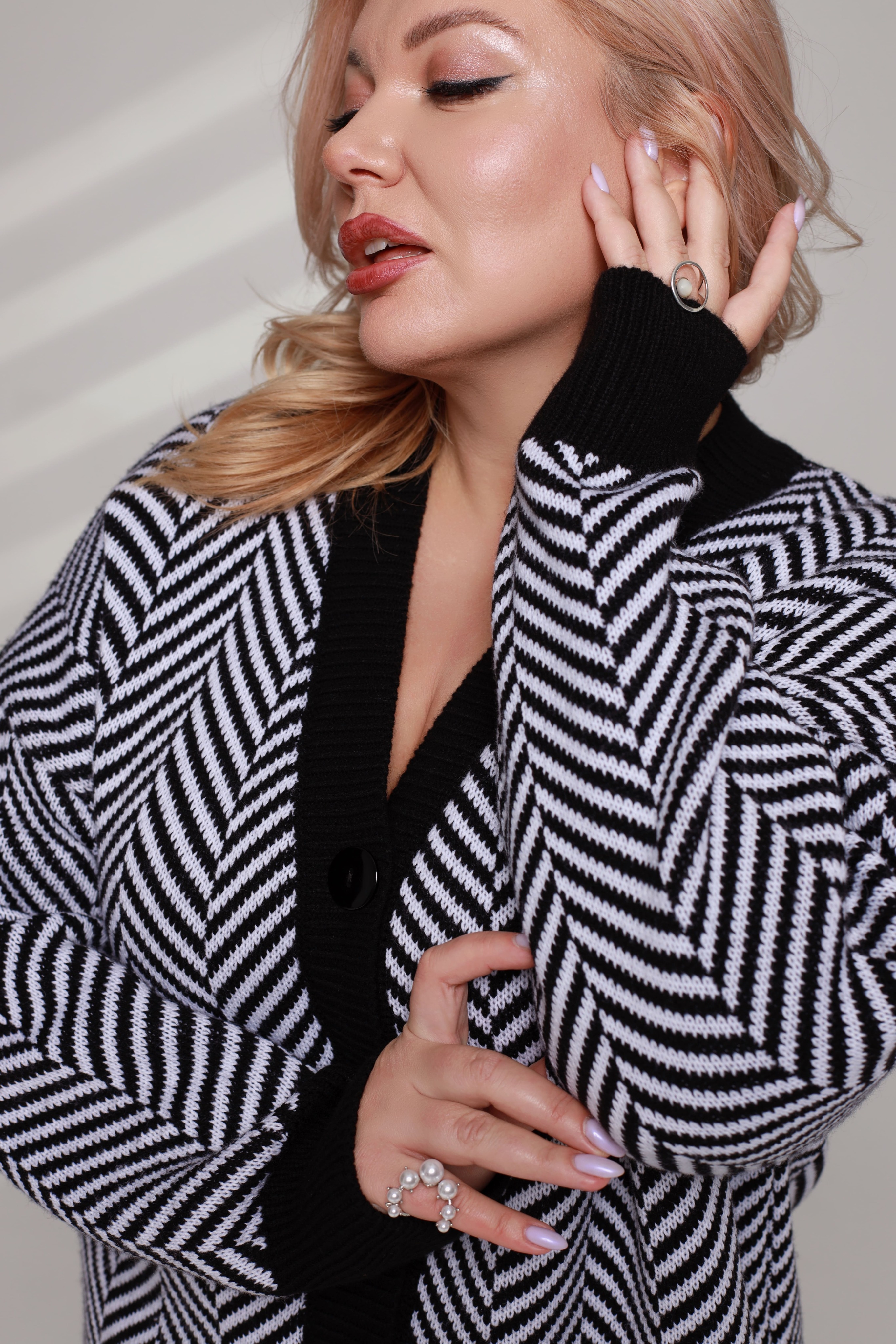 Кардиган из вязанного трикотажа идеальное решение для стильных и модных женщин, которые стремятся выглядеть привлекательно и комфортно в любое время года. глубокий v-образный вырез переходит в планку с пуговками. кардиган можно носить как открытым, так и застегнутым на пуговицы – это позволяет создавать различные стильные сочетания. манжеты на рукавах полной длины и низ изделия связаны в технике английской резинки. актуальный принт добавляет динамичности и оригинальности. благодаря своему универсальному дизайну, этот кардиган идеально сочетается с любыми нарядами - от повседневных до вечерних. безупречный стиль этого изделия подчеркнет вашу индивидуальность и придаст образу шарма и элегантности.