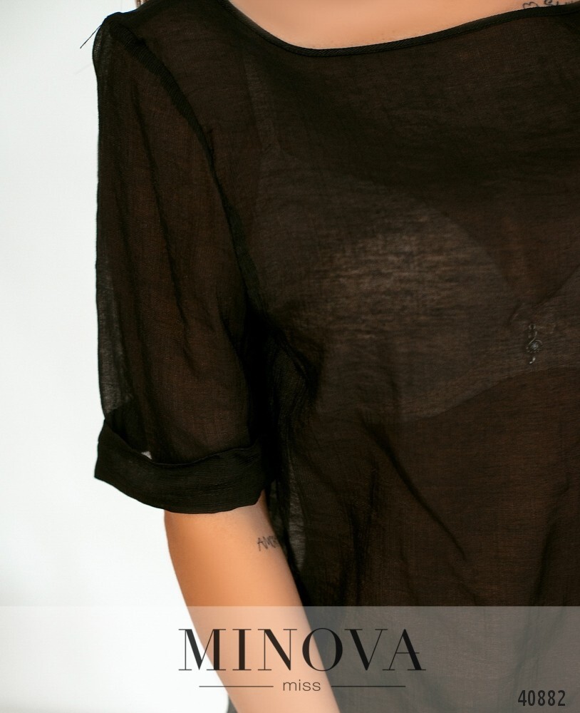 Лёгкая, воздушная, полупрозрачная блуза без застёжек и карманов, с небольшими отворотами на рукавах, вырез горловины "лодочка".