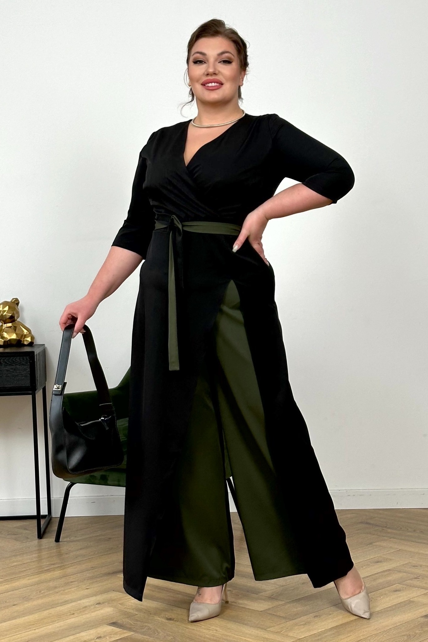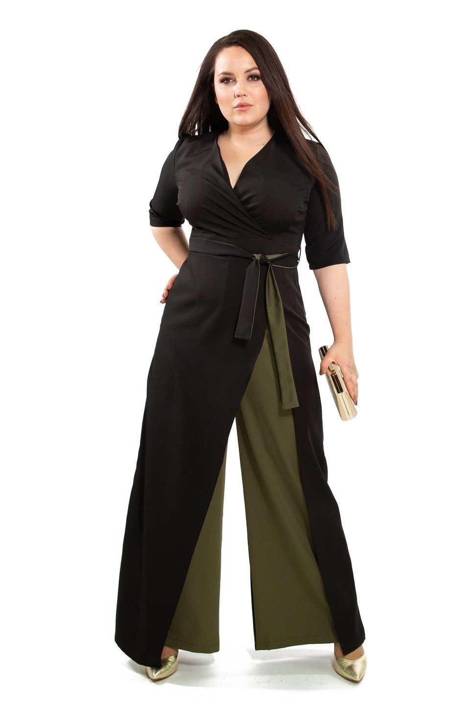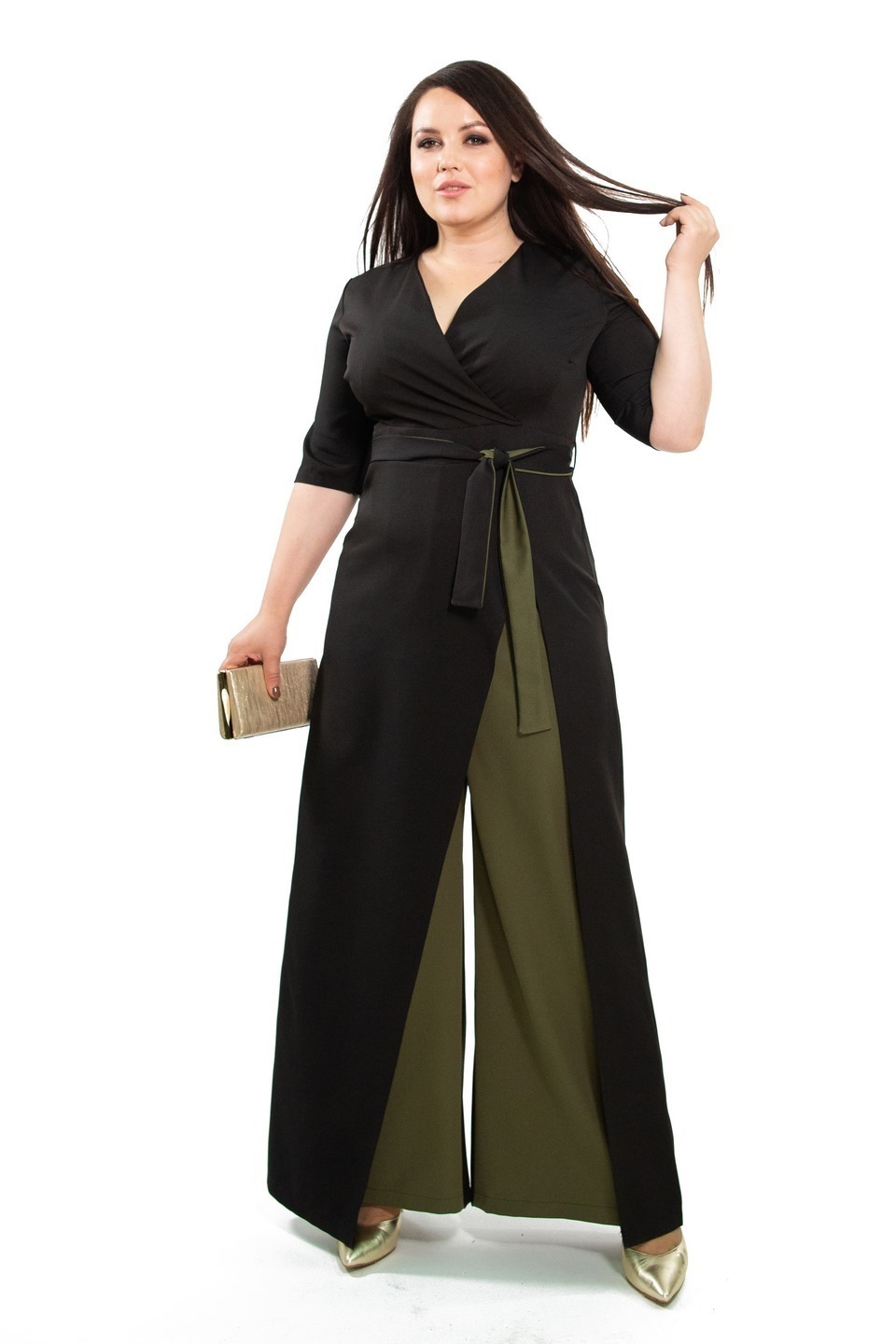 Комбинезон с запахом черный с отделкой хаки