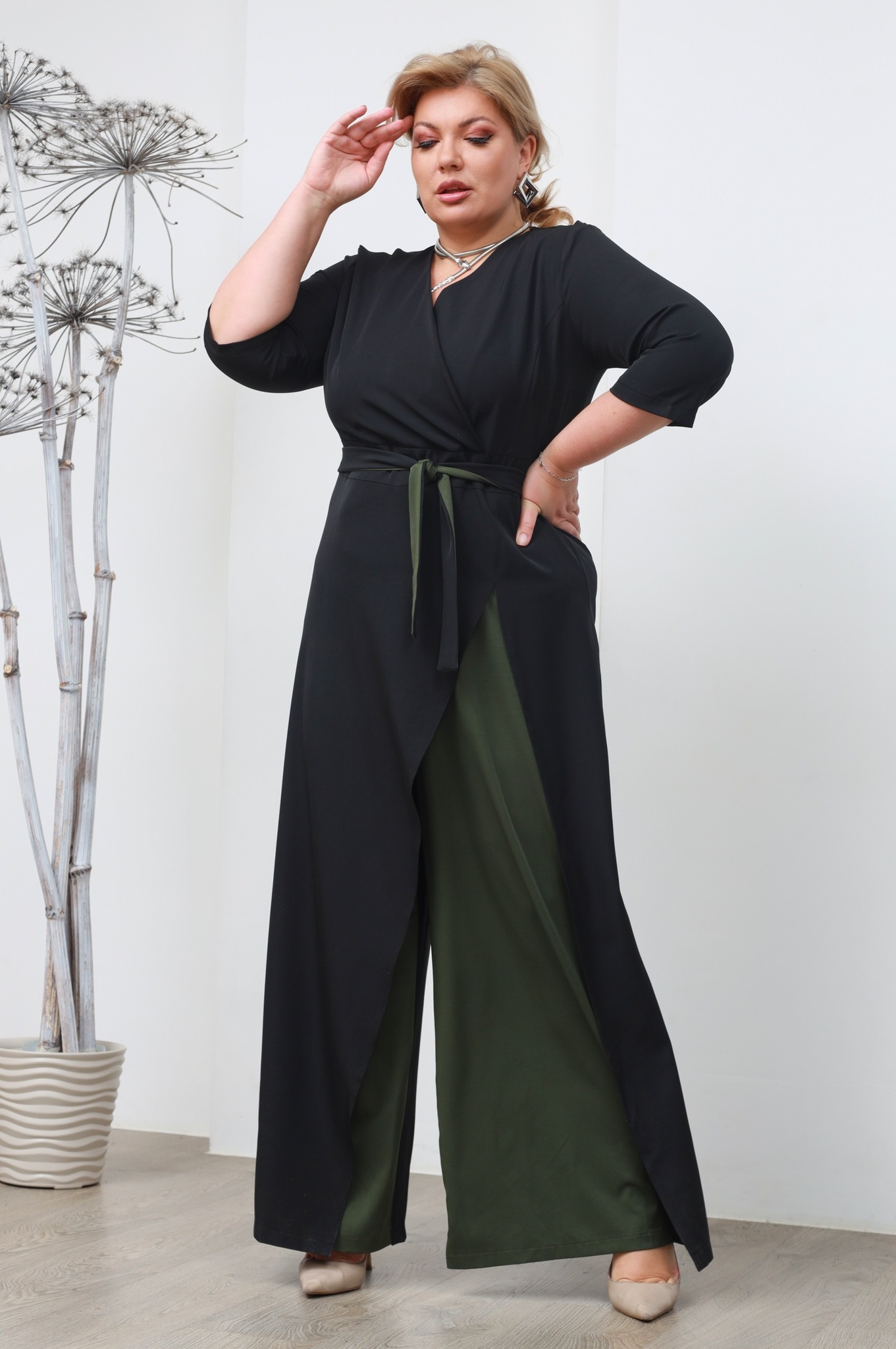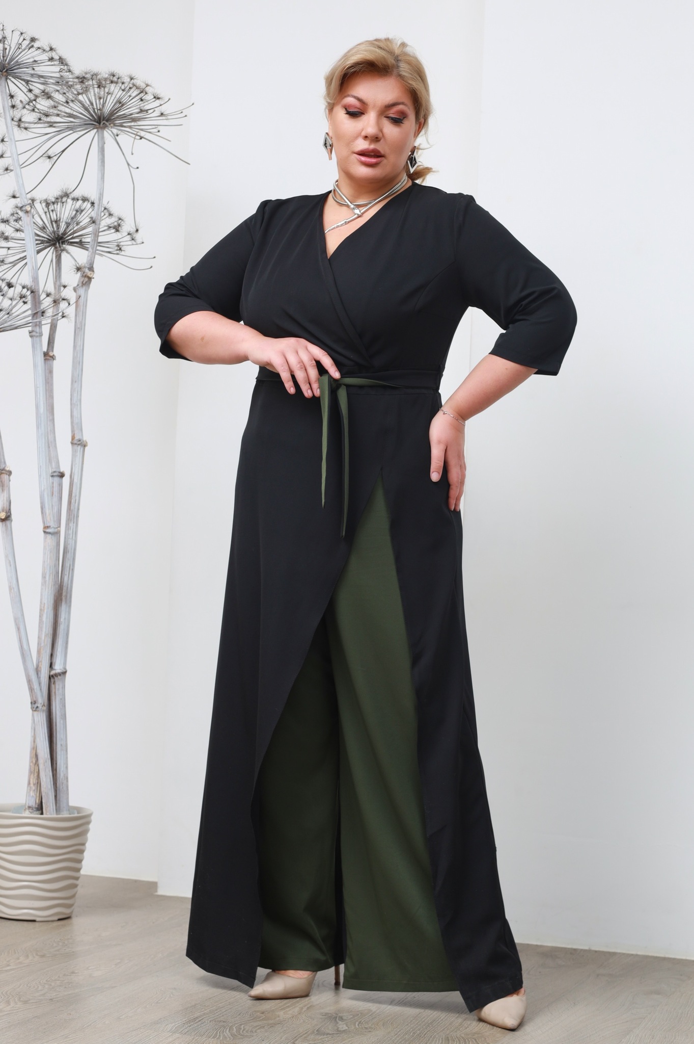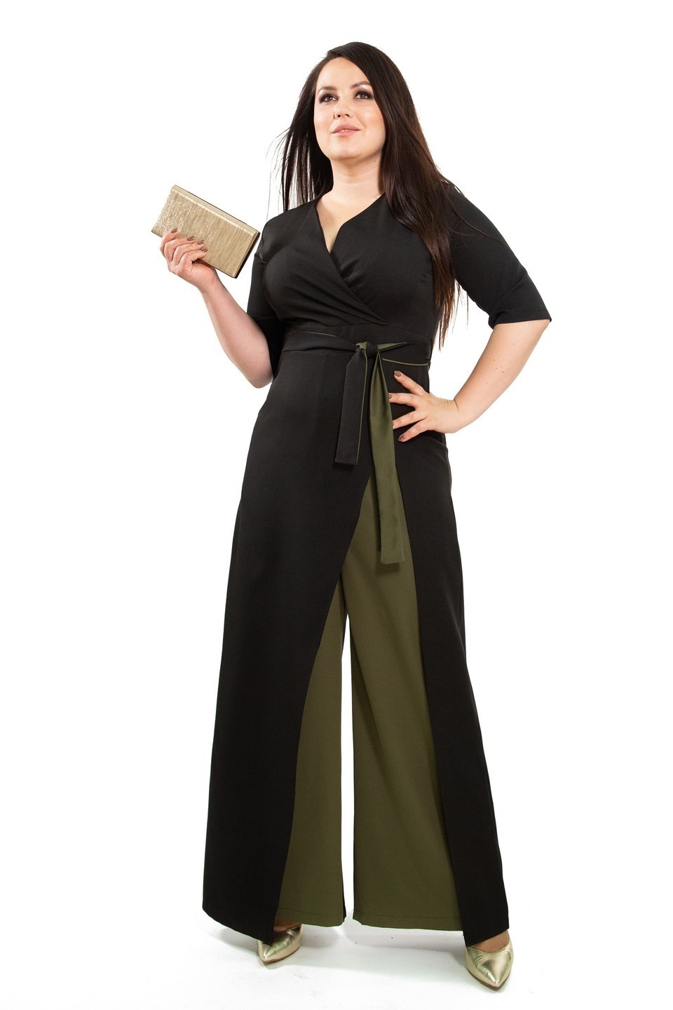 Комбинезон с запахом черный с отделкой хаки
