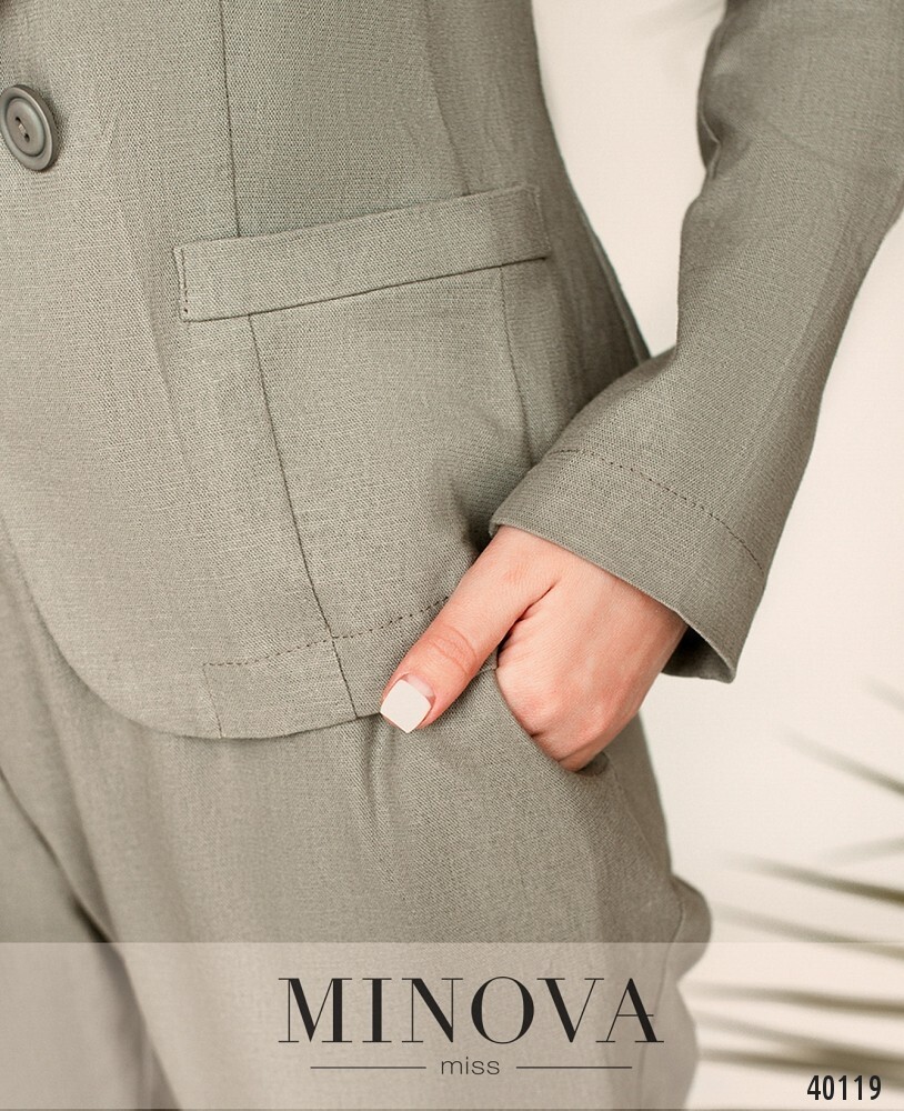 Очаровательный костюм-двойка с пиджаком и брюками. пиджак без подкладки, однобортный, по бокам - декоративные клапаны, рукава без пуговиц и без манжет. брюки с подворотами, в пояс сзади вшита резинка, по бокам врезные карманы, в наличии декоративная ширинка. посадка высокая.