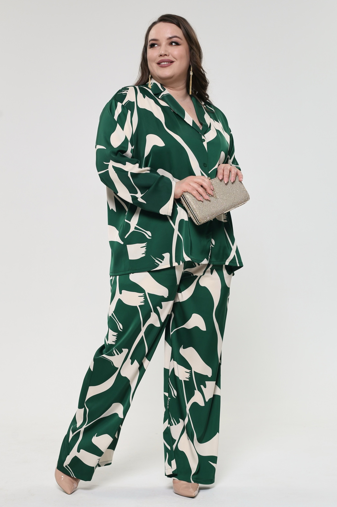 Удлиненная рубашка прямого кроя. v-образный вырез оформлен классическим отложным воротником с лацканами. свободные приспущенные рукава полной длины. модель застёгивается на оригинальные пуговки под планку. кокетка на плечах способствует оптимальной посадке по фигуре. оригинальный принт добавляет динамичности и освежает образ. костюм превосходно сочетается как с обувью на каблуках для создания нарядного образа, так и с кедами для более повседневного стиля. элементы модели можно также носить по отдельности.