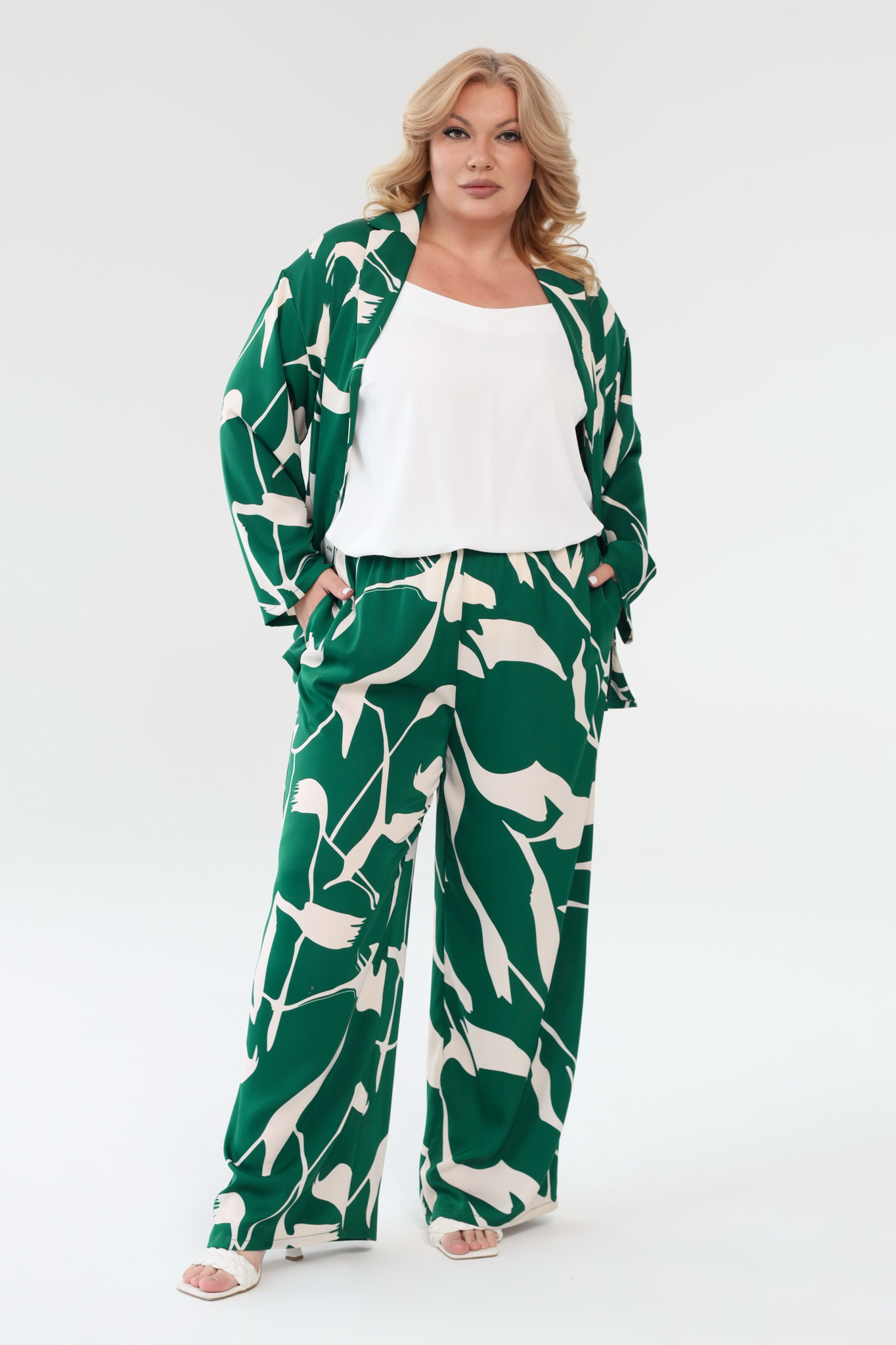 Костюм из мягкого струящегося материала состоит из удлиненной рубашки и брюк. материал устойчив к деформации и практически не мнется. удобные брюки-палаццо отлично сидят за счет широкой эластичной резинки на поясе. имеют завышенную линию талии. карманы по бокам добавляют практичности.