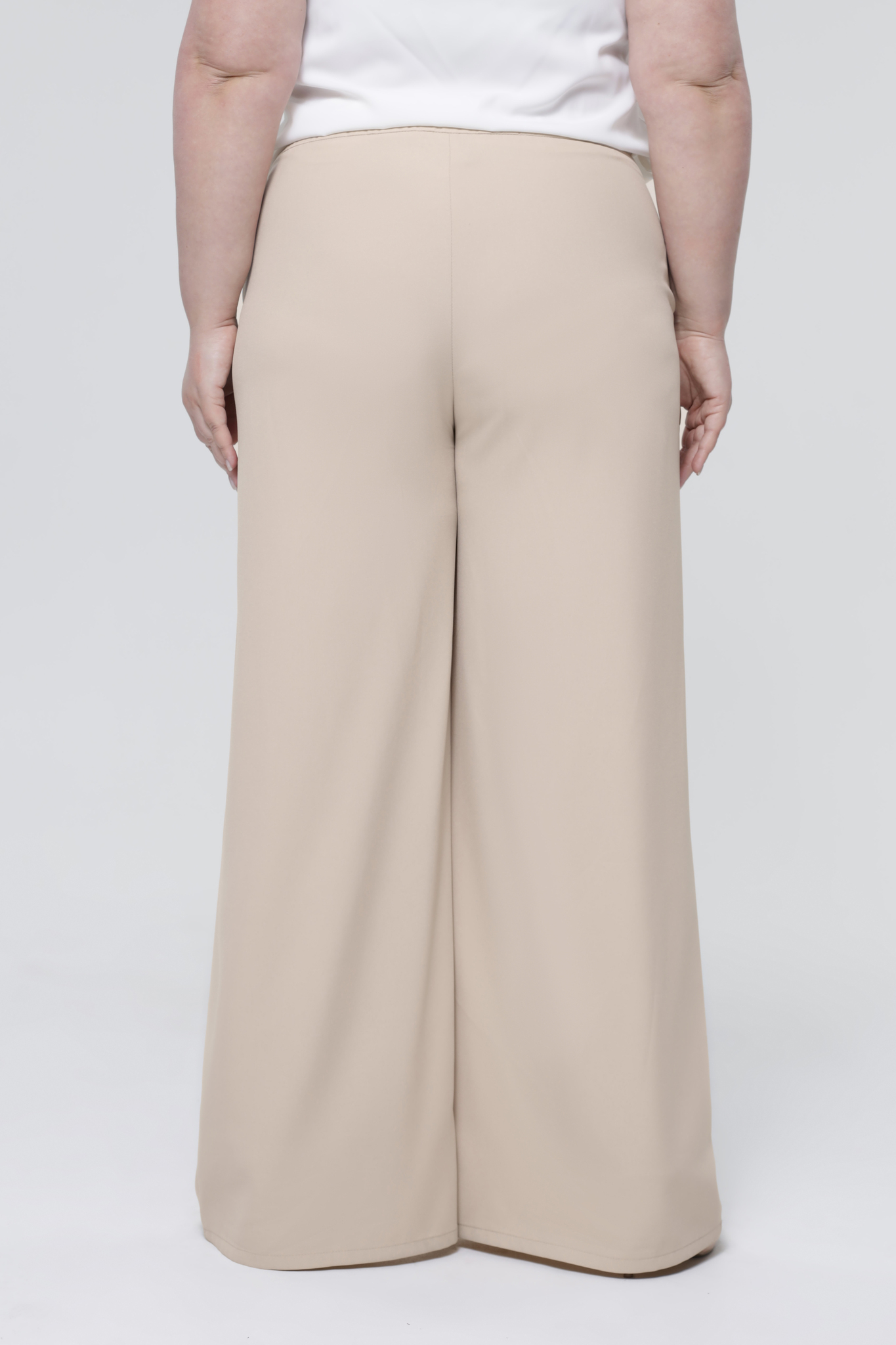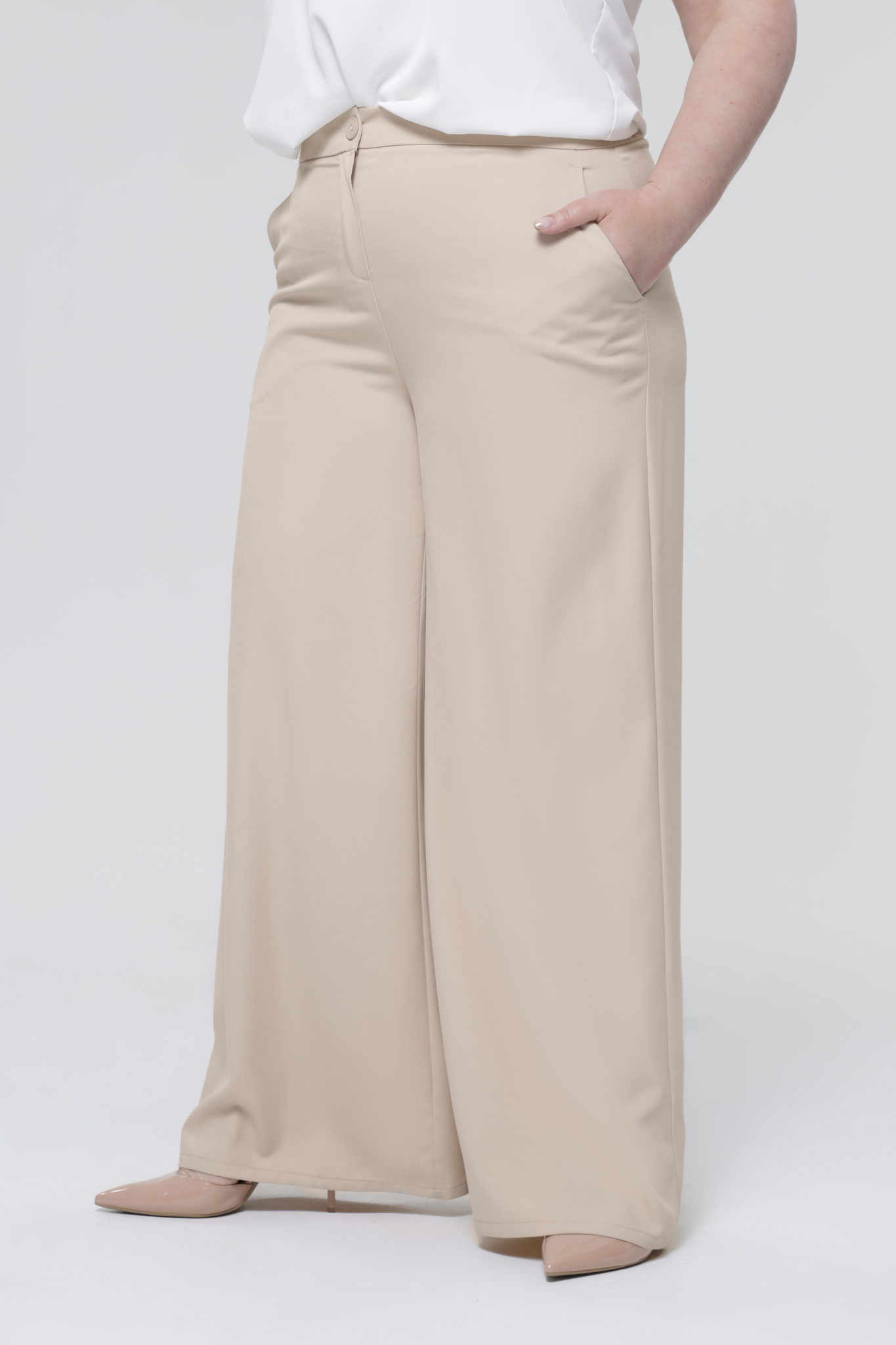 Брюки отлично сидят за счет эластичной резинки на поясе по спинке. модель с комфортной высотой линии талии не сковывает движений. расклешенные книзу брючины визуально стройнят и зрительно вытягивают силуэт. боковые карманы добавляют практичности. брюки застегиваются спереди на скрытую молнию и пуговицу.
