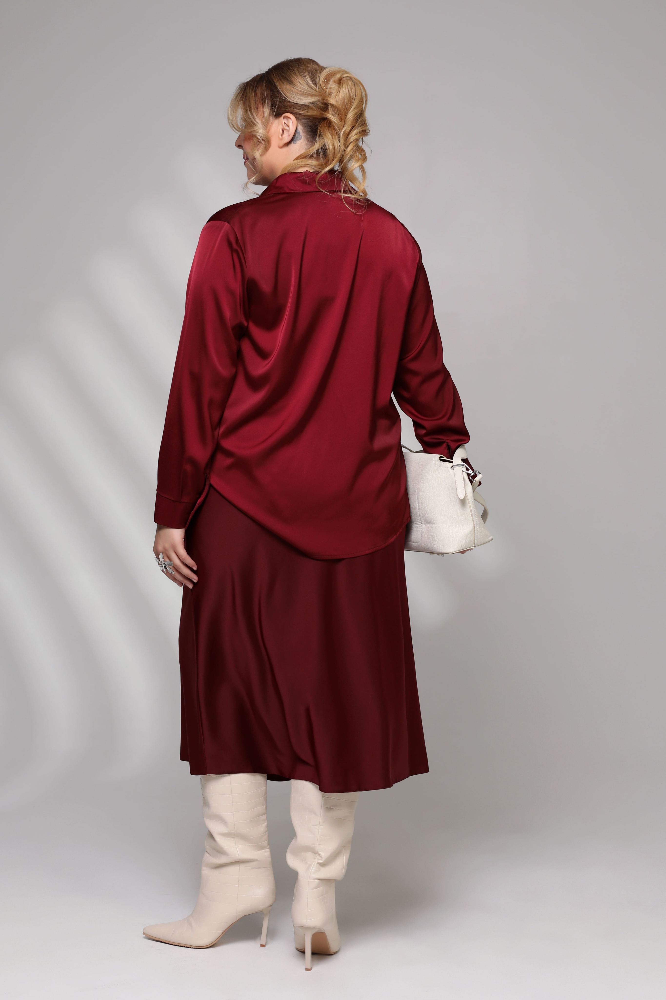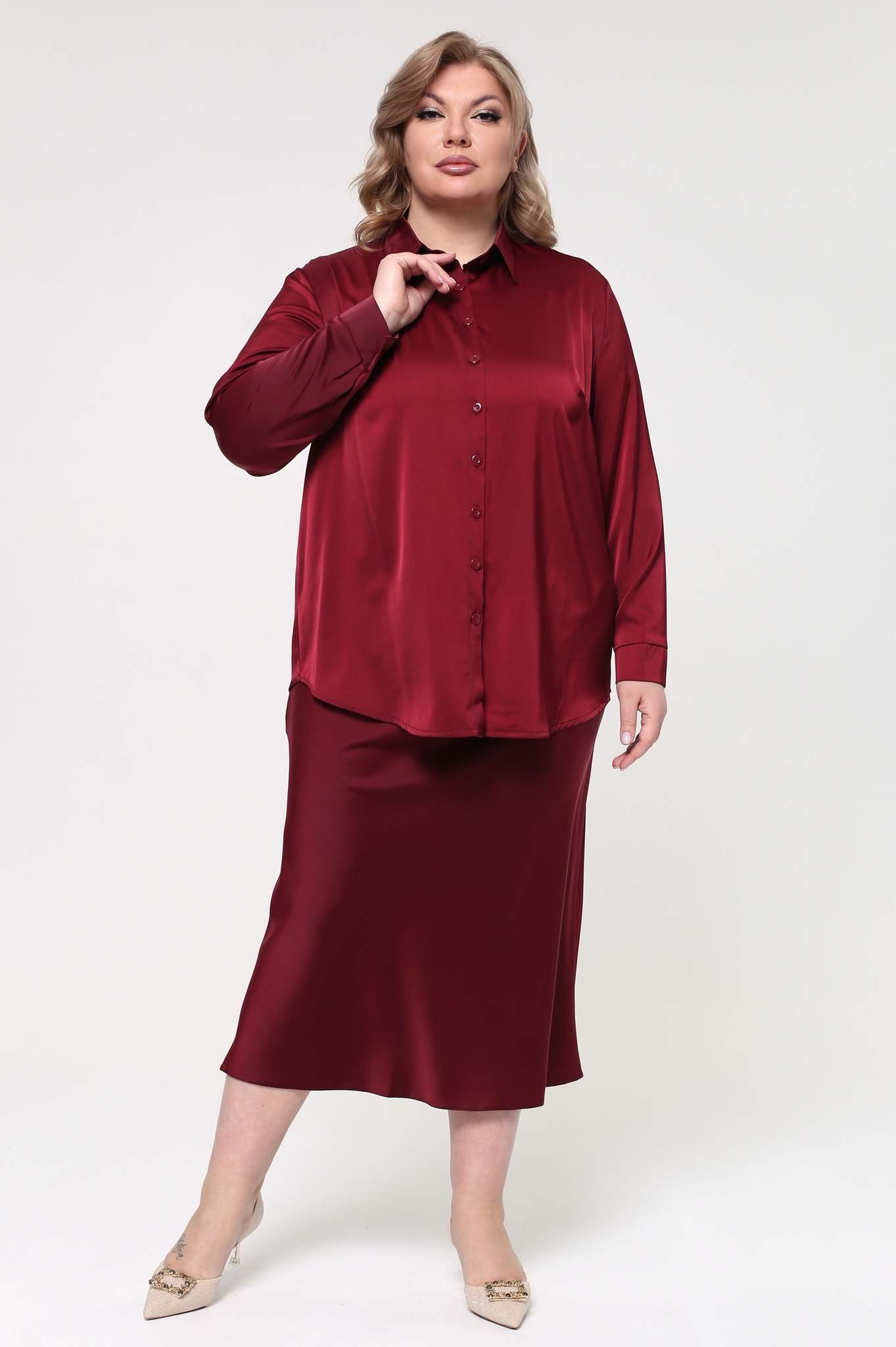 Стильный женский костюм из мягкого струящегося материала состоит из рубашки и юбки. удлиненная рубашка свободного кроя имеет классический отложной воротник. вытачки на груди и закругленные бока способствуют оптимальной посадке по фигуре. модель застегивается спереди под планку на пуговицы по всей длине. рукава полной длины с приспущенной проймой по низу оформлены манжетами с пуговками. юбка прямого силуэта виртуозно обыгрывает фигуру благодаря оригинальному крою модели. пояс на резинке способствует оптимальной посадке по фигуре. женственный костюм идеально подойдет для торжественных мероприятий разного характера. подчеркните лаконичность образа длинными серьгами и туфлями на высоких каблуках. элементы костюма можно также носить по отдельности. длина изделия 50 размера по спинке верх - 76 см, низ - 90 см. в каждом следующем размере длина увеличивается.