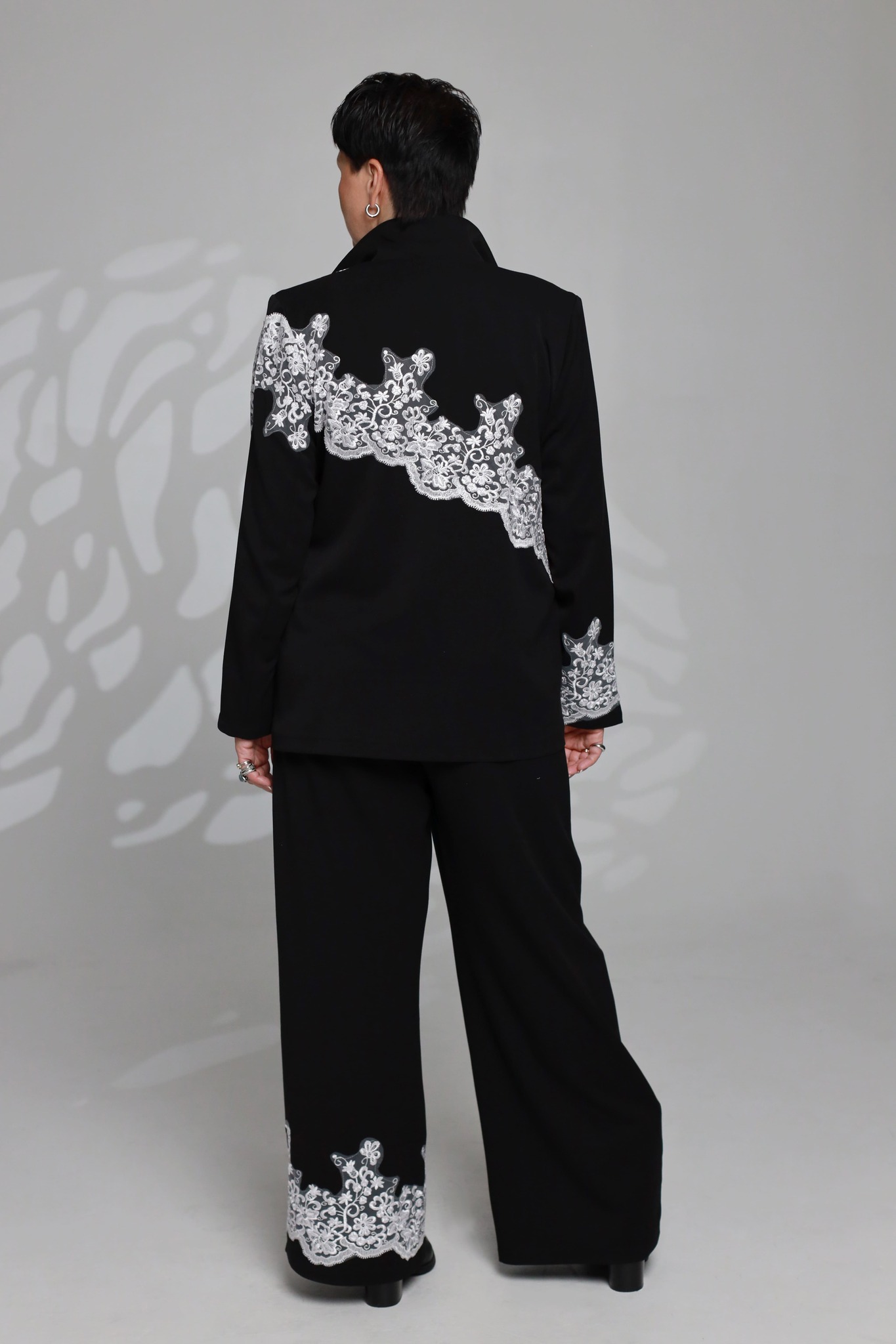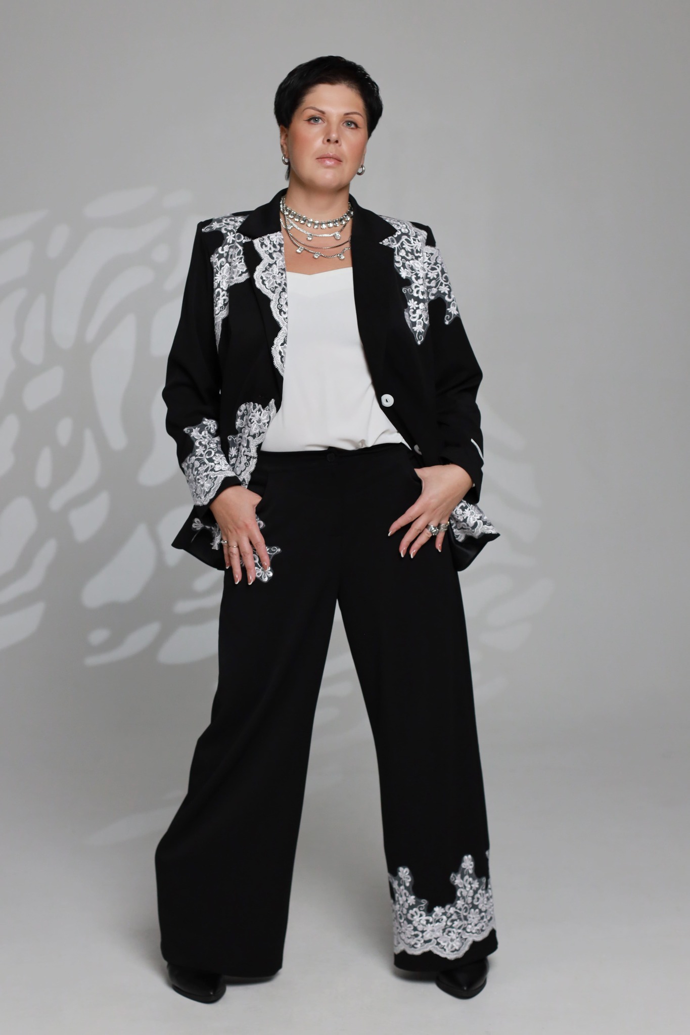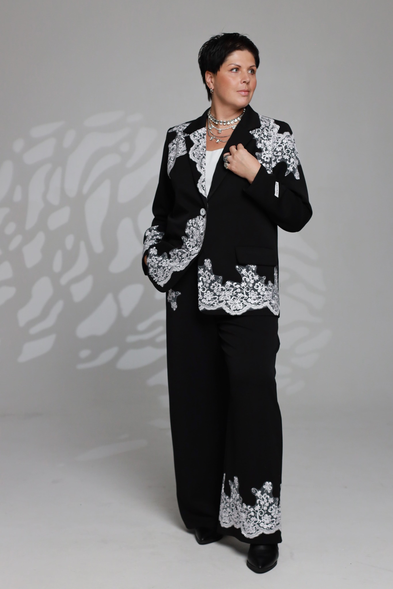 Брюки также выполнены свободного кроя и дополнены карманами, что делает костюм удобным в повседневной жизни. особое внимание заслуживает изящная вышивка, которая подчёркивает индивидуальность модели и придаёт ей элегантный акцент.