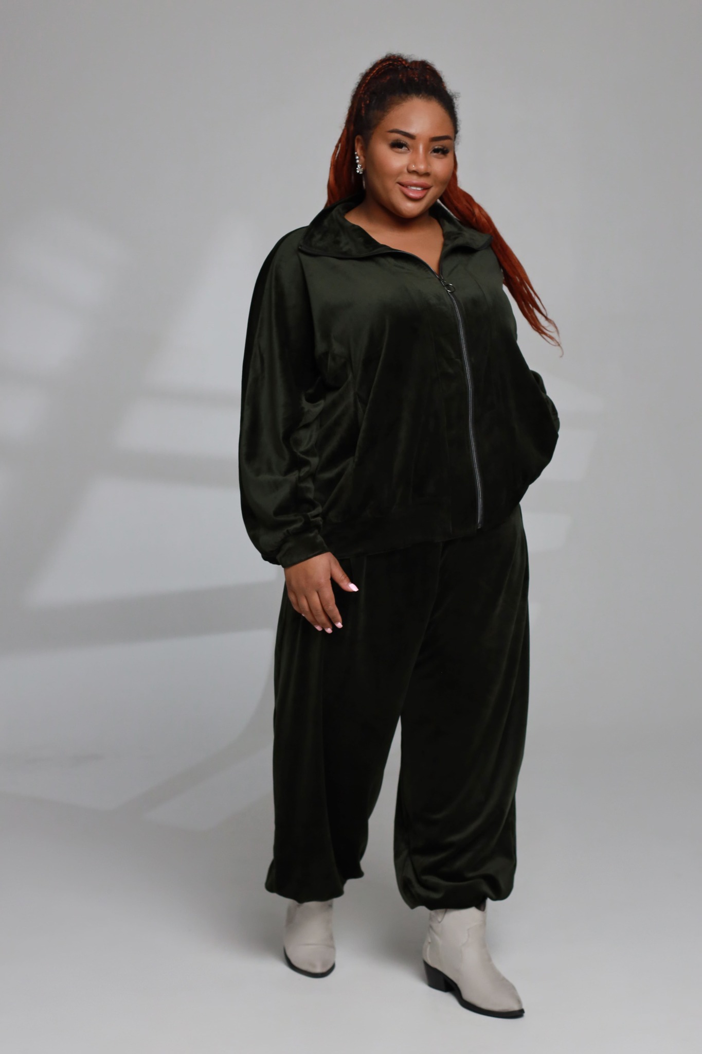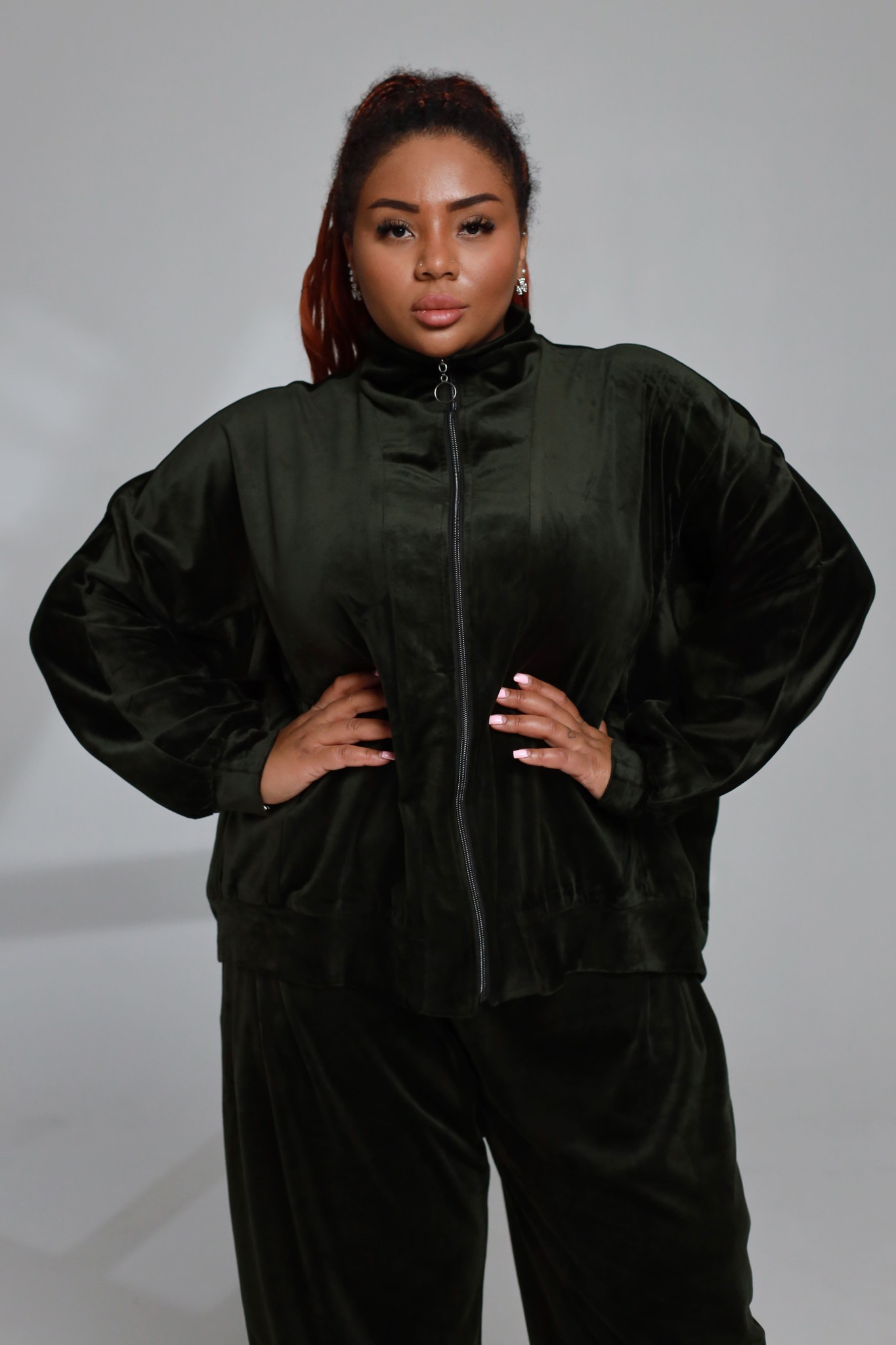 Костюм велюровый, с высоким воротником, темно-зеленый