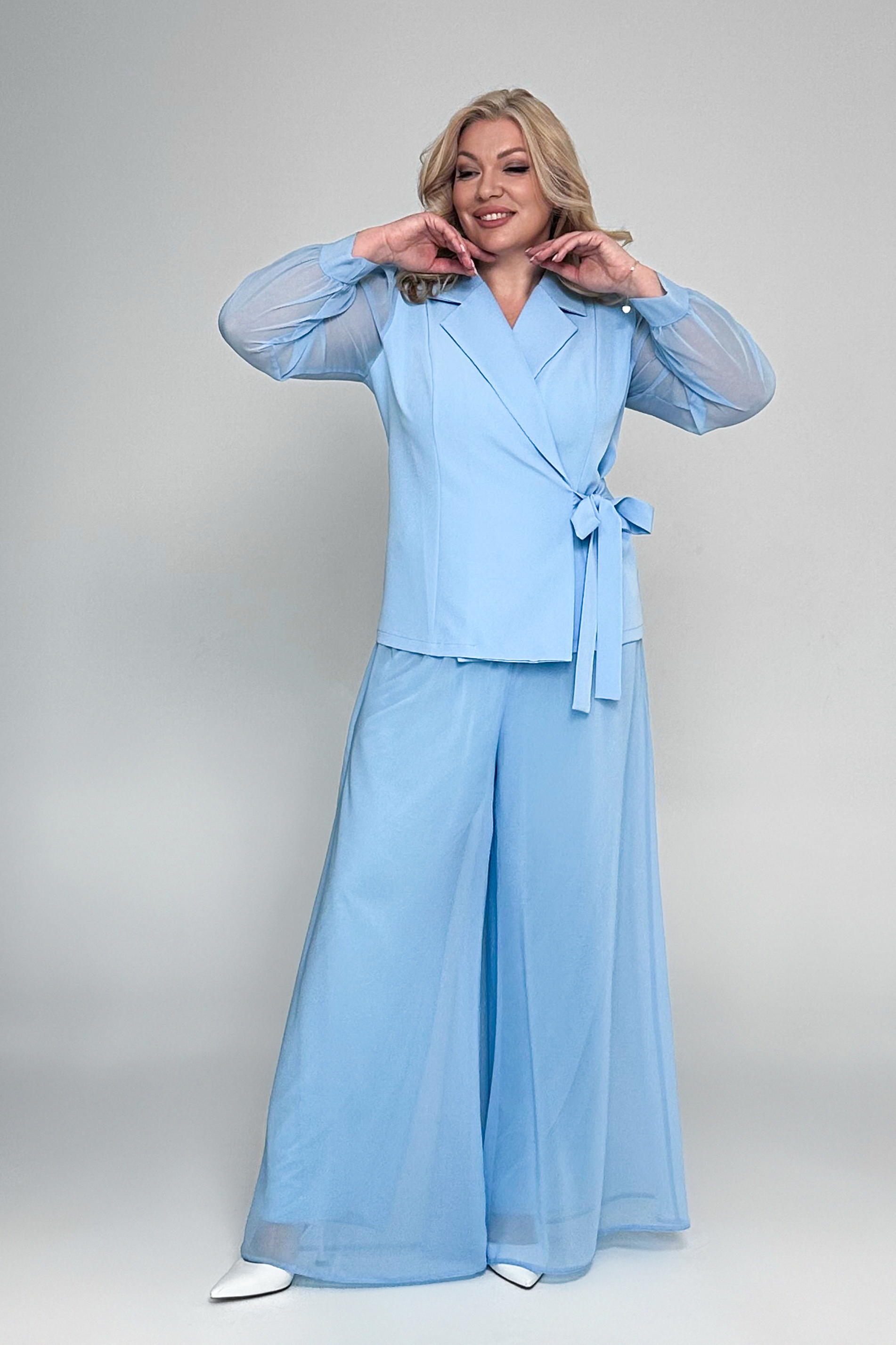Костюм брючный "версаль" с завязкой сбоку голубой