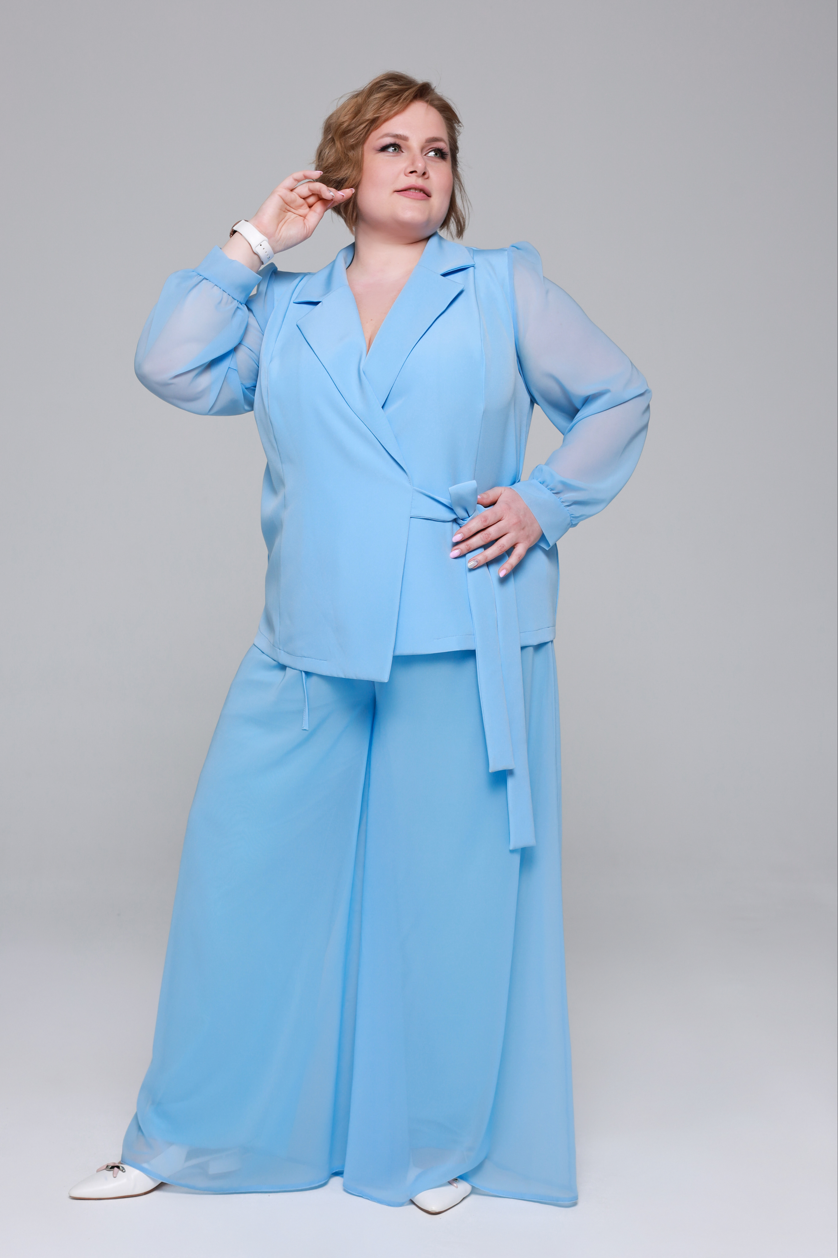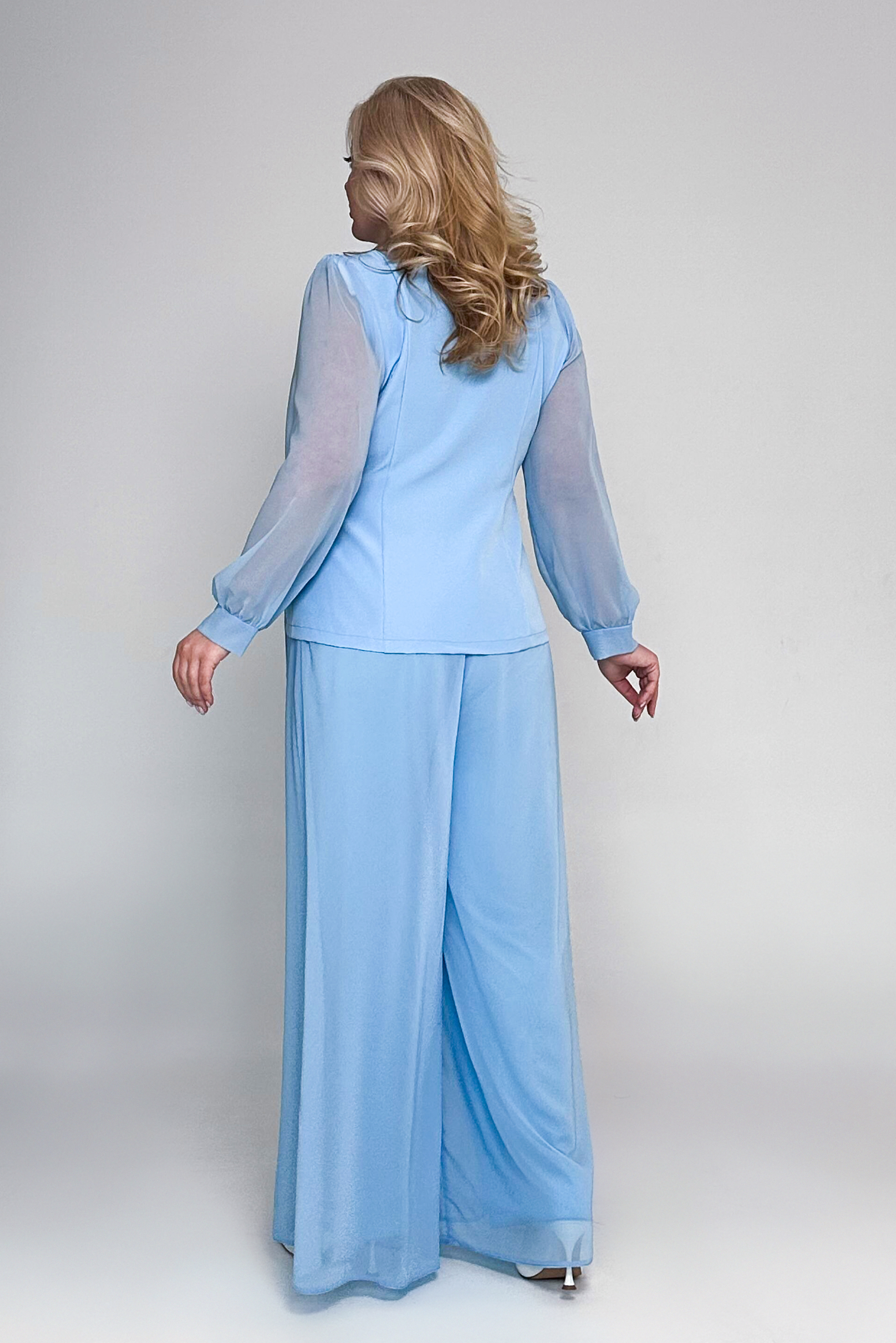 Стильный костюм из мягкого струящегося материала состоит из жакета и брюк. удобные брюки-палаццо свободного кроя имеют завышенную линию талии. шифоновый верх искусно скрывает мелкие недостатки фигуры. брюки отлично сидят за счет комфортной резинки на поясе.