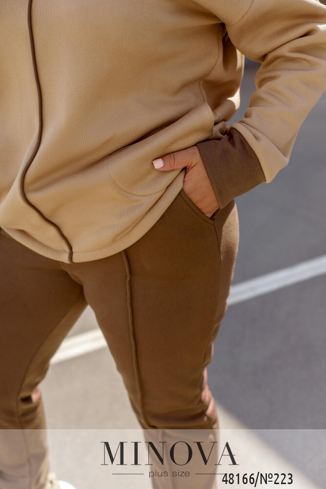 Современный костюм двойка в спортивном стиле, состоящий из кофты с капюшоном, дополненной боковыми карманами и приспущенными рукавами на манжете и брюки с резинкой на талии и пропущенным шнурком. брюки с нашитой "стрелкой" спереди по центру. к манжетам внизу вшита резинка по бокам – карманы в шве. универсальный костюм, который подходит как для прогулок, так и для занятий спортом.