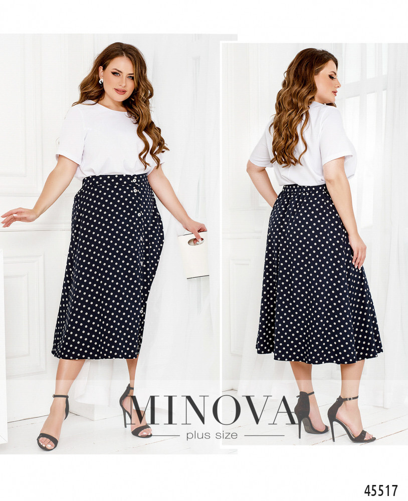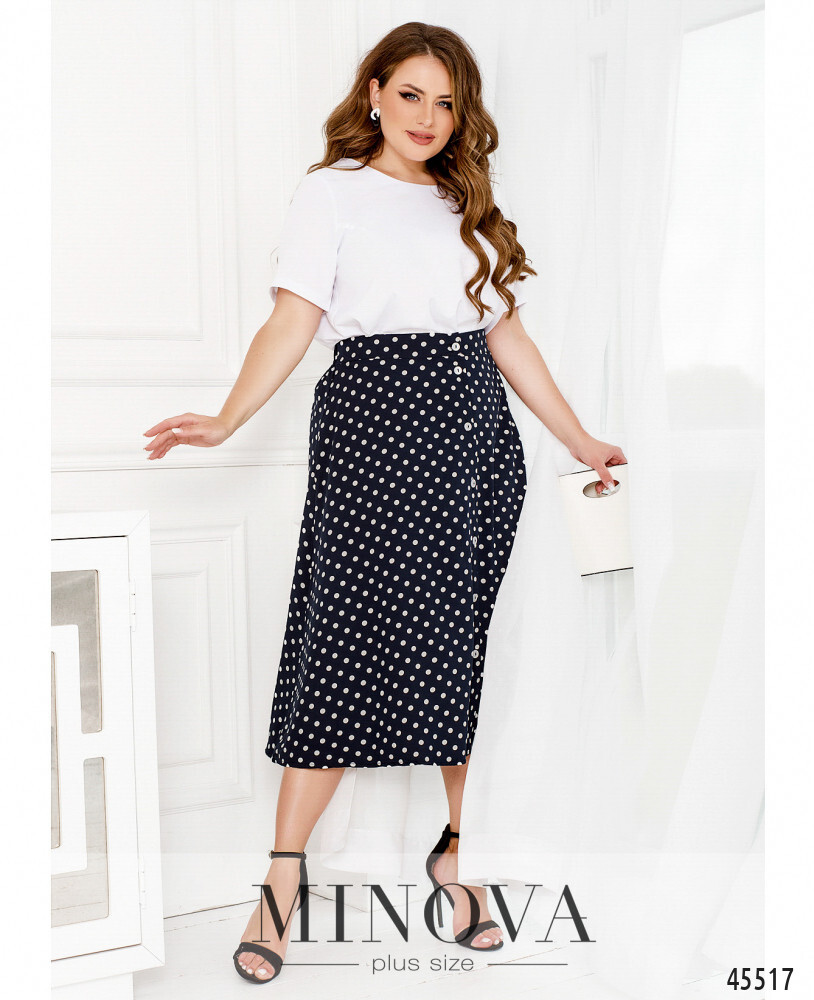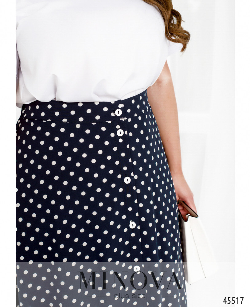 Очаровательный летний костюм, состоящий из однотонной блузы и юбки с актуальным принтом в горошек, станет идеальным дополнением вашего базового гардероба. минималистичная блуза с короткими рукавами и ассиметричным подолом дополнена юбкой миди с резинкой, вставленной в линию талии по спинке, и расстегивающимися пуговицами по центру спереди. контрастный принт и лаконичный фасон делают этот костюм одновременно простым и эффектным. Ориентировочные замеры по готовому изделию: Блуза: 46-48 р-р: длина блузки 66-70см, длина рукава от плечевого шва 21см, обхват рукава 36см, ог - 104см, от -108см. 50-52 р-р: длина блузки 69-73см, длина рукава от плечевого шва 22см, обхват рукава 38см, ог - 112см, от -116см. 54-56 р-р: длина блузки 70-74см, длина рукава от плечевого шва 23см, обхват рукава 40см, ог - 120см, от -124см. 58-60 р-р: длина блузки 71-75см, длина рукава от плечевого шва 24см, обхват рукава 42см, ог - 128см, от -132см. 62-64 р-р: длина блузки 72-76см, длина рукава от плечевого шва 25см, обхват рукава 44см, ог - 136см, от -140см. 66-68 р-р: длина блузки 73-77см, длина рукава от плечевого шва 26см, обхват рукава 46см, ог - 144см, от -148см. Юбка: 46-48 р-р: от - 70-82см, об -128см. длина юбки: 74см. 50-52 р-р: от - 76-89см, об -136см. длина юбки: 75см. 54-56 р-р: от - 82-95см, об -144см. длина юбки: 76см. 58-60 р-р: от - 88-101см, об -152см. длина юбки: 77см. 62-64 р-р: от - 94-107см, об -160см. длина юбки: 78см. 66-68 р-р: от - 100-113см, об -168см. длина юбки: 79см. Рекомендации по уходу: машинная стирка при низких температурах (до 40 градусов) *замеры могут отличаться от указанных на +-2см в зависимости от особенностей ткани, техническим особенностям пошива, степенью усадки ткани **в зависимости от цветопередачи вашего монитора, оттенок изделия может немного отличаться ***обратите внимание, фурнитура по изделию может меняться ***в зависимости от партии фурнитура в изделии может меняться