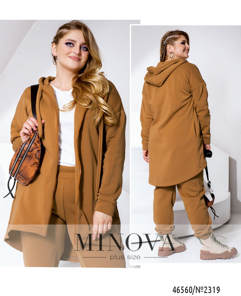 Монохромный утепленный спортивный костюм — идеальный вариант для любителей комфортного минимализма. в комплект входят лаконичные брюки-джоггеры на резинке с карманами в боковых швах, а также удлиненная кофта-туника на змейке с капюшоном и карманами, изюминкой которой являются рукава с манжетами и приспущенной линией плеч и ассиметричный низ, удлиненный по спинке.