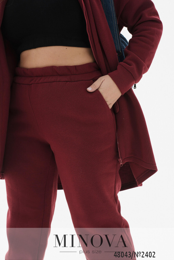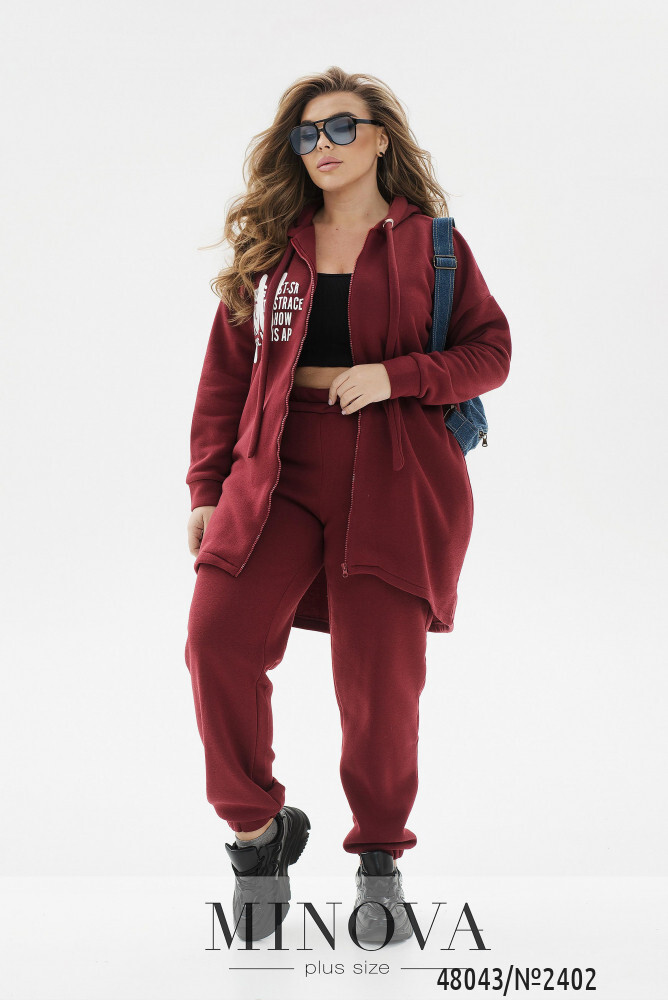 Костюм, который точно стоит вашего внимания. яркие цвета и удобный крой – главные элементы для вашего комфорта. удлиненная кофта со спущенным плечевым швом на молнии в тон костюма. рукава на манжетах. изделие также дополнено капюшоном со шнуровкой. правая часть декорирована термонаклейкой. подол кофты удлинено по спинке и округлено.