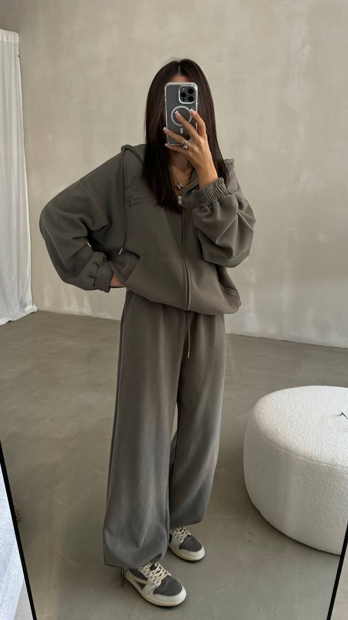 спортивный костюм свободного кроя: худи на молнии с вышивкой и широкие брюки на резинке.трехнитка