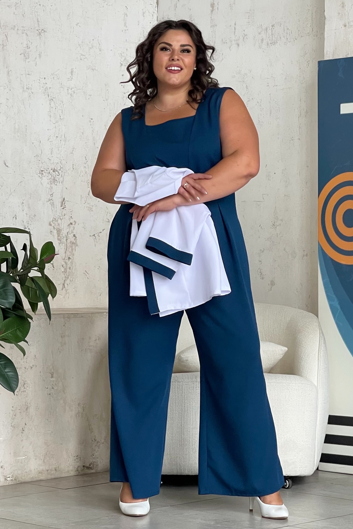 Стильный костюм состоит из жакета и комбинезона. эффектный комбинезон без рукавов имеет квадратный вырез, что оригинально подчеркивает женственность и изящность. модель застёгивается по спинке на скрытую молнию. формирующие швы по переду и вытачки по спинке способствуют оптимальной посадке по фигуре. по бокам практичные вшивные карманы. модель привлекает внимание широким клешем, что добавляет модели оригинальности.