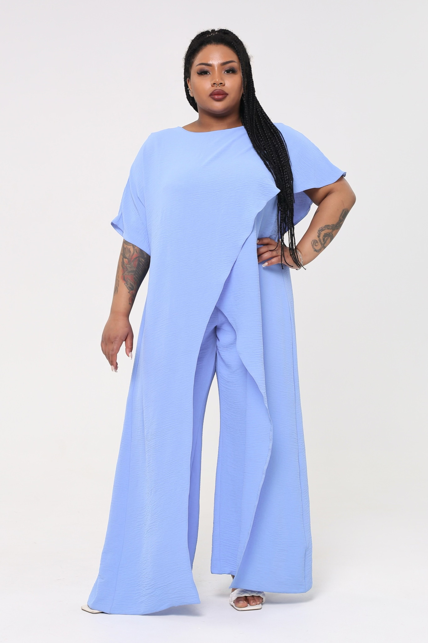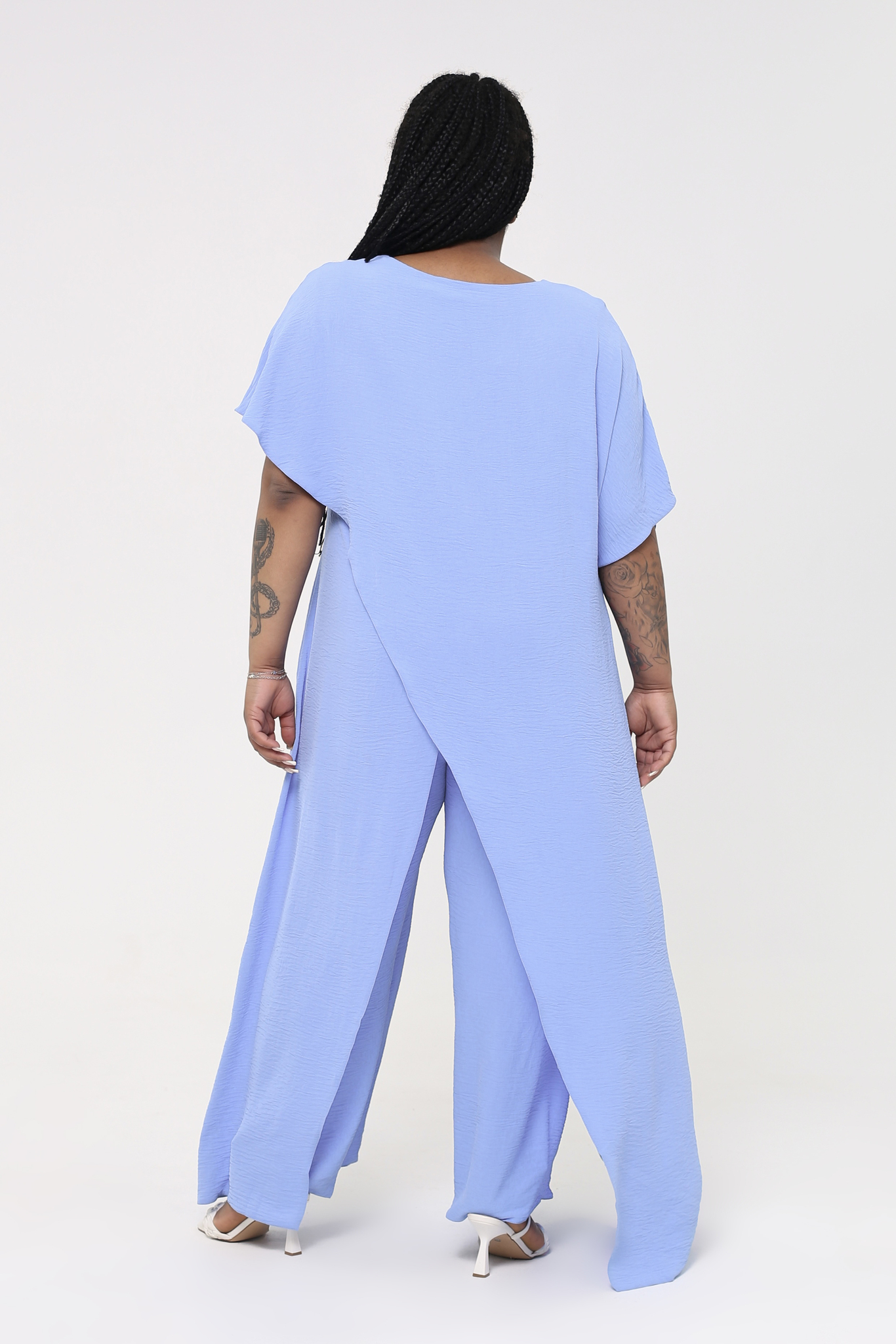 Костюм брючный "ласточка" палаццо с длинным верхом с запахом голубой