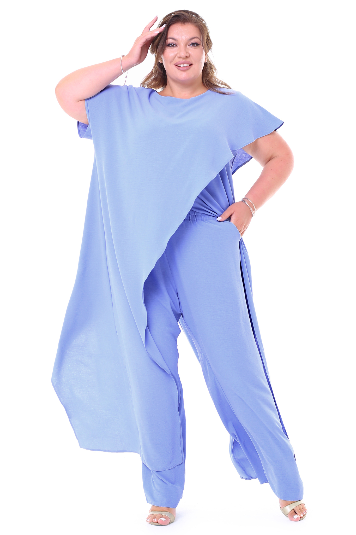 Оригинальная удлиненная туника с запахом имеет круглый вырез и короткие цельнокроеные рукава. ассиметричные края по бокам зрительно вытягивают силуэт и визуально стройнят. оригинальный крой модели подойдёт как для офиса, так и для праздничных мероприятий. элементы костюма можно также носить по отдельности. длина изделия 50 размера по спинке верх - 140 см,длина брюк по внутреннему шву 78 см,по боковому шву 108 см. в каждом следующем размере длина увеличивается.