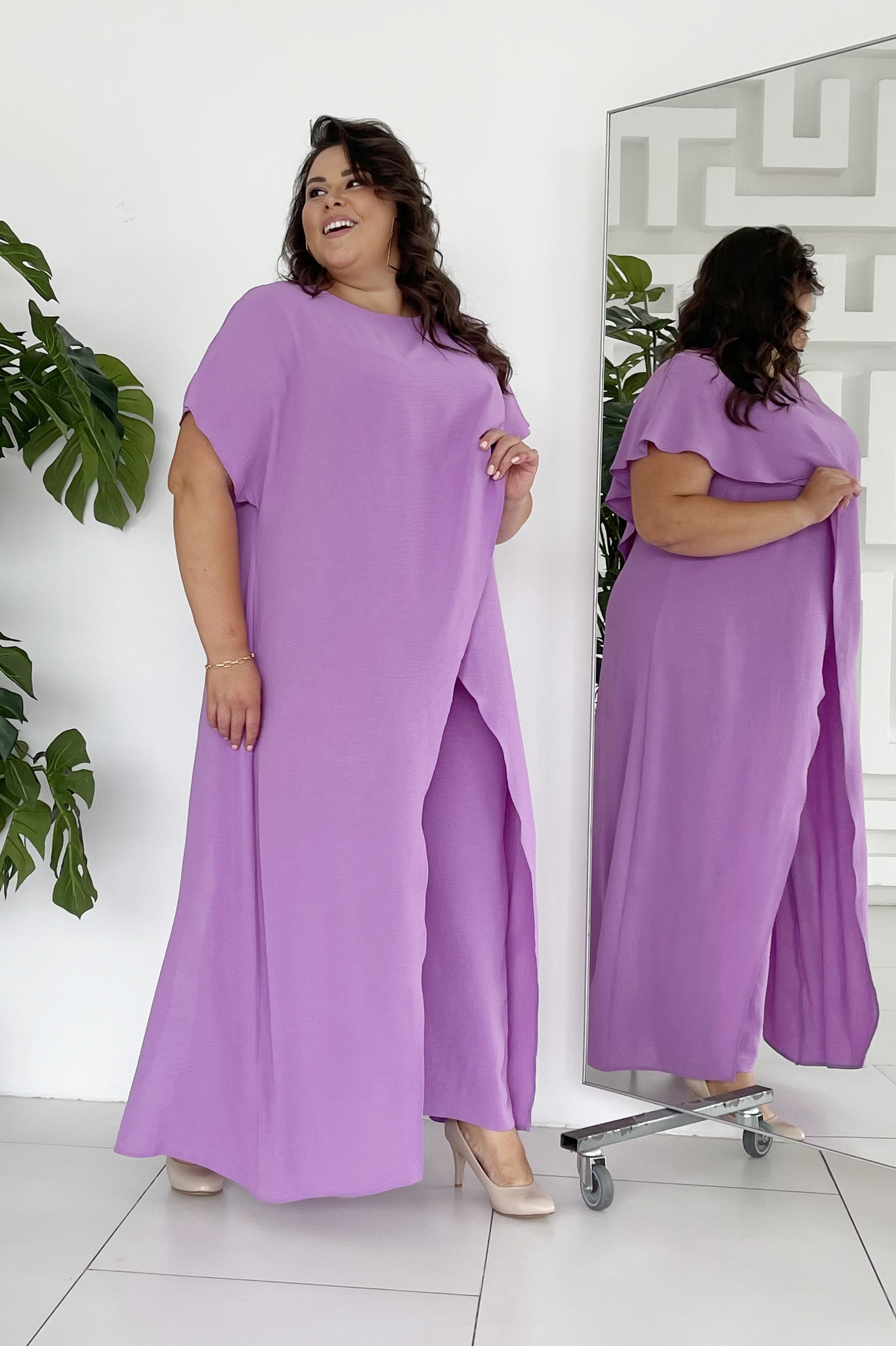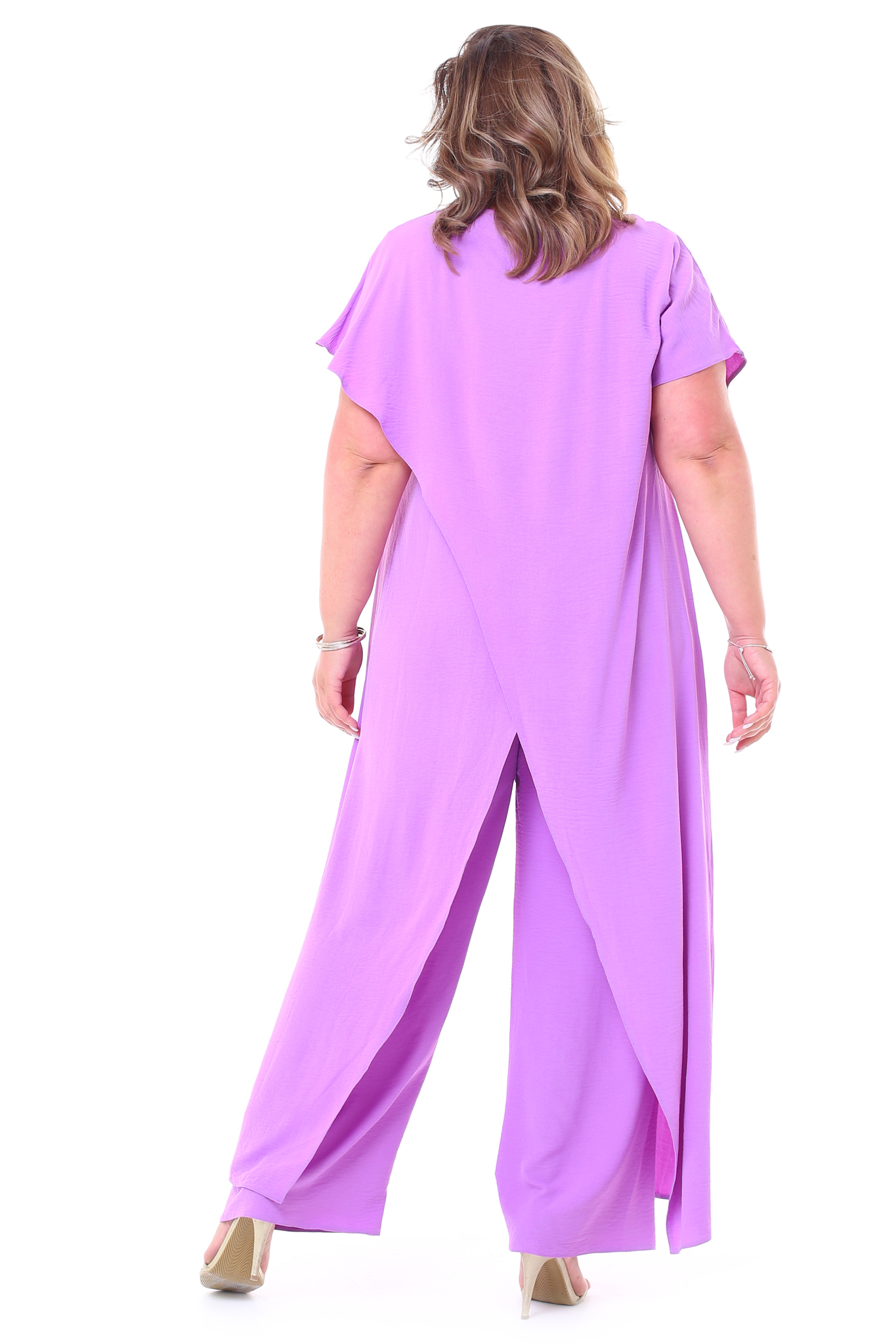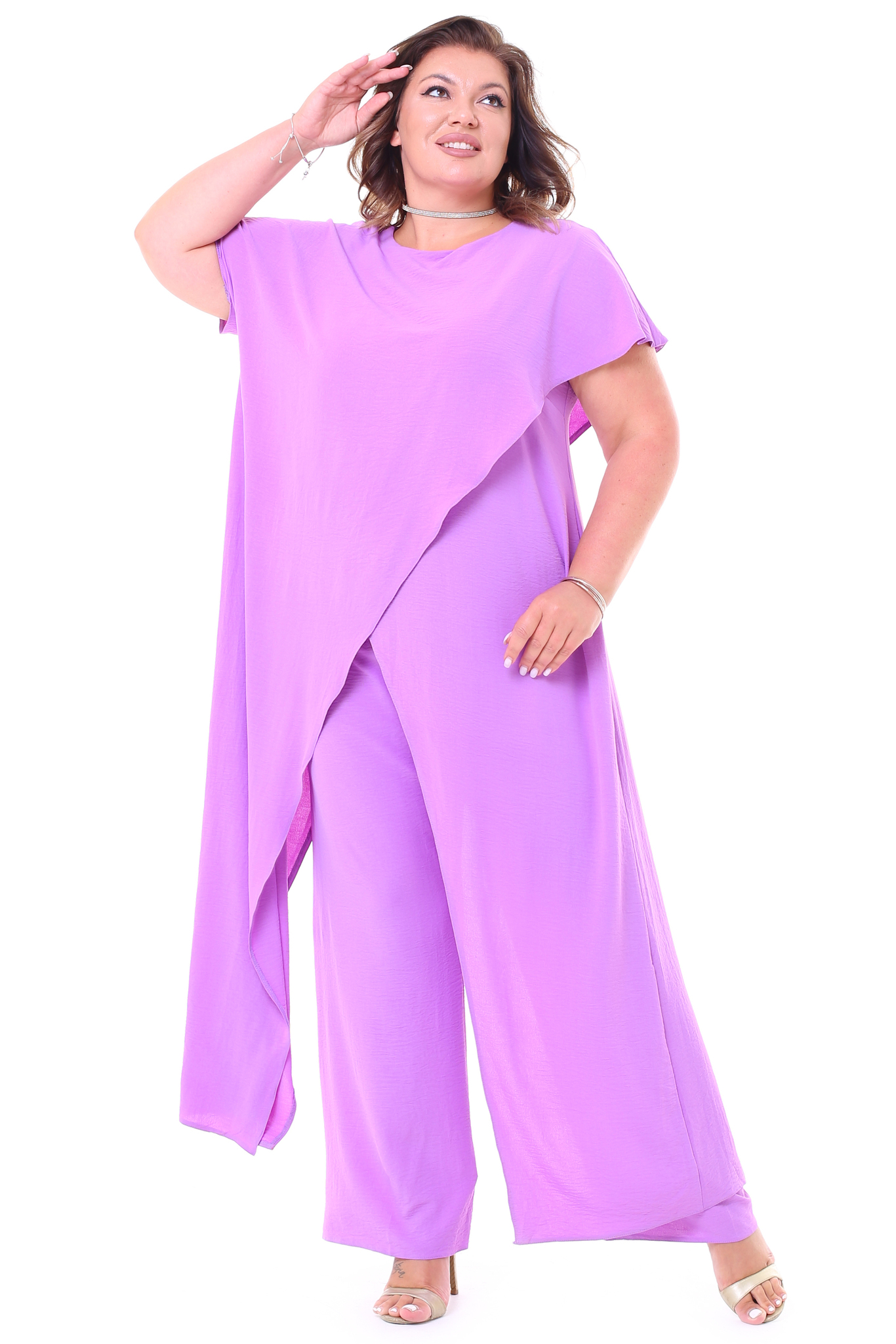 Костюм брючный "ласточка" палаццо с длинным верхом с запахом лаванда