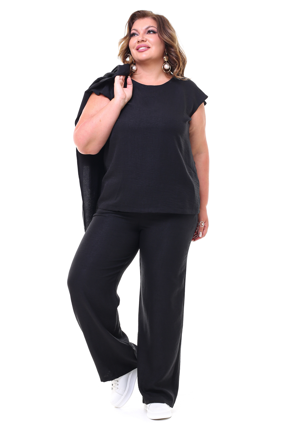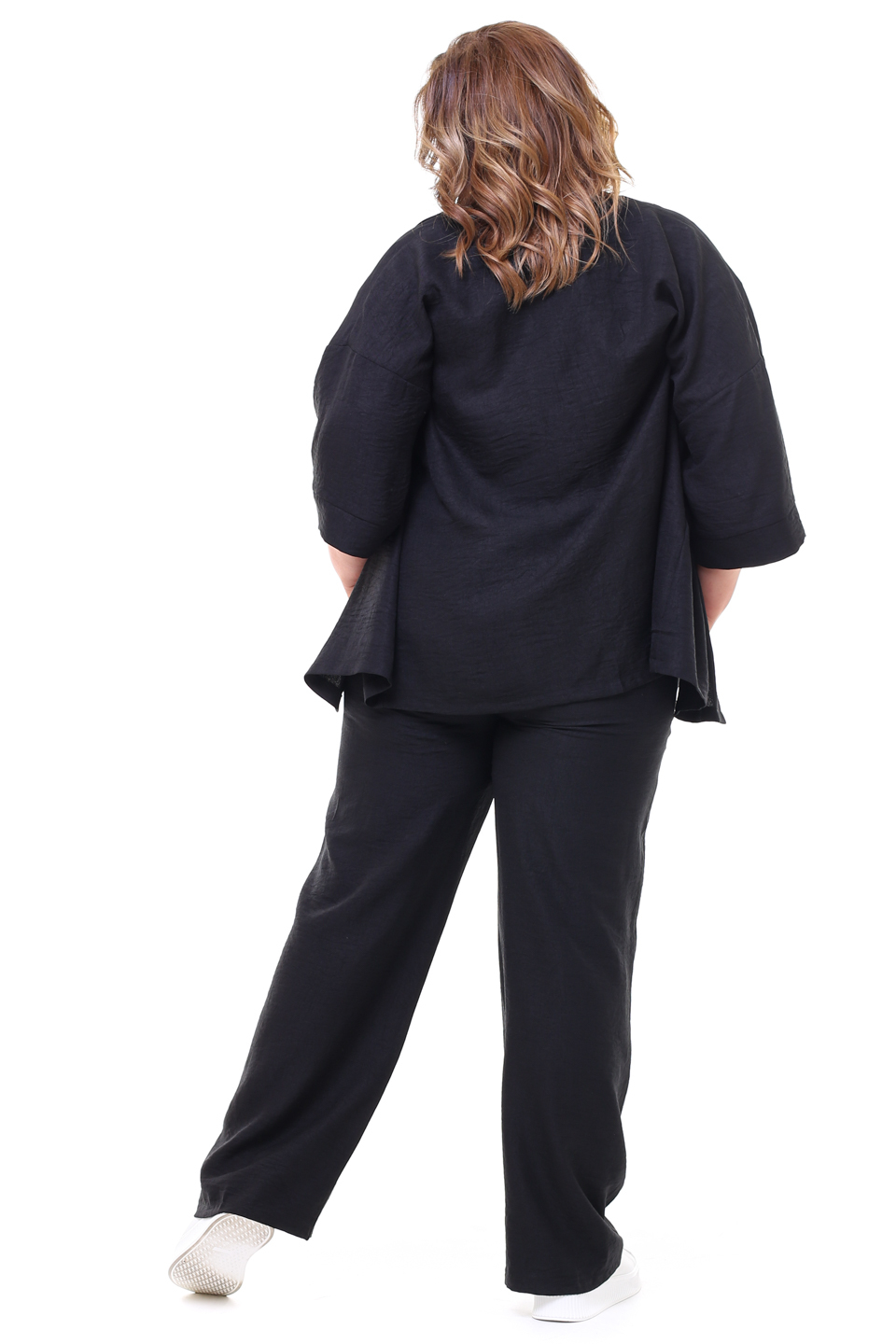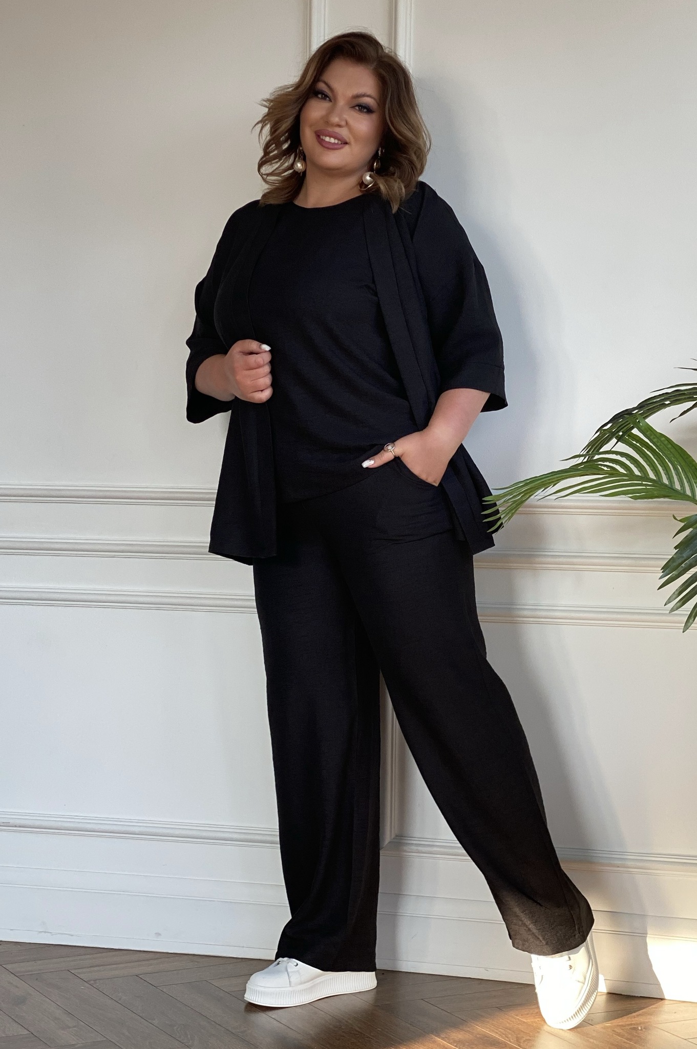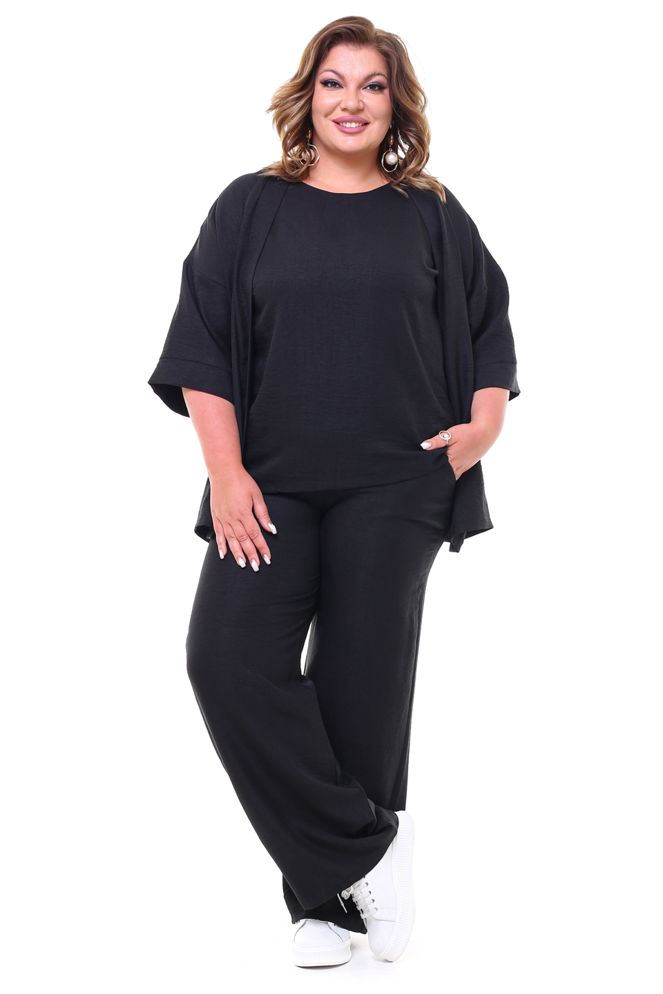 Костюм из мягкого материала состоит из удлиненного жакета, блузки и брюк. прямые широкие брючины свободного кроя отлично сидят за счет широкой эластичной резинки на поясе по спинке. по бокам практичные карманы.