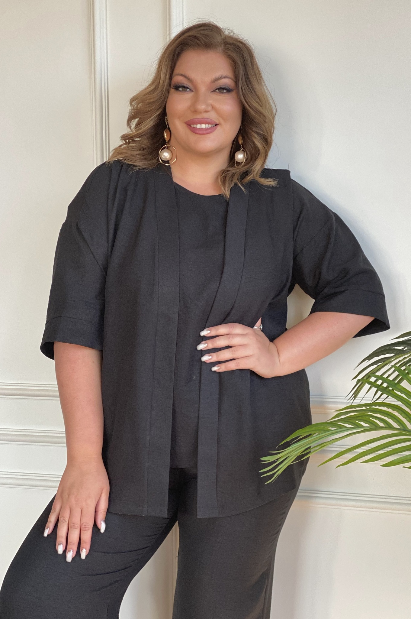 Жакет без застёжки имеет глубокий v-образный вырез и приспущенные рукава длиной 3/4. костюм превосходно сочетается как с каблуками для создания нарядного образа, так и с кедами для более повседневного стиля. модель также можно носить по отдельности.