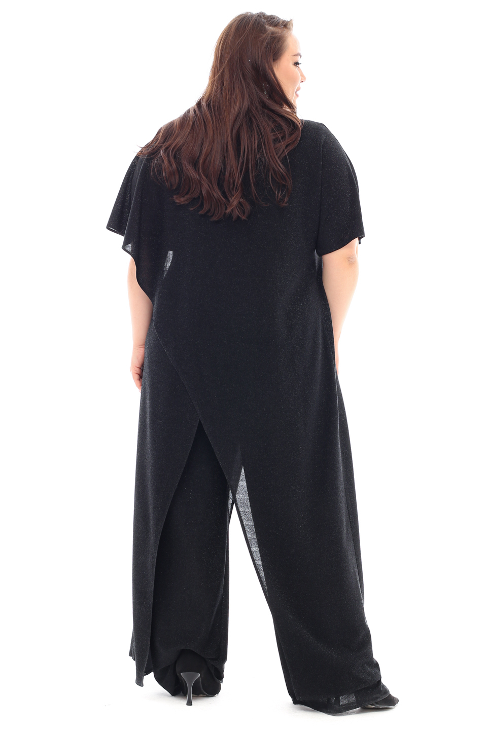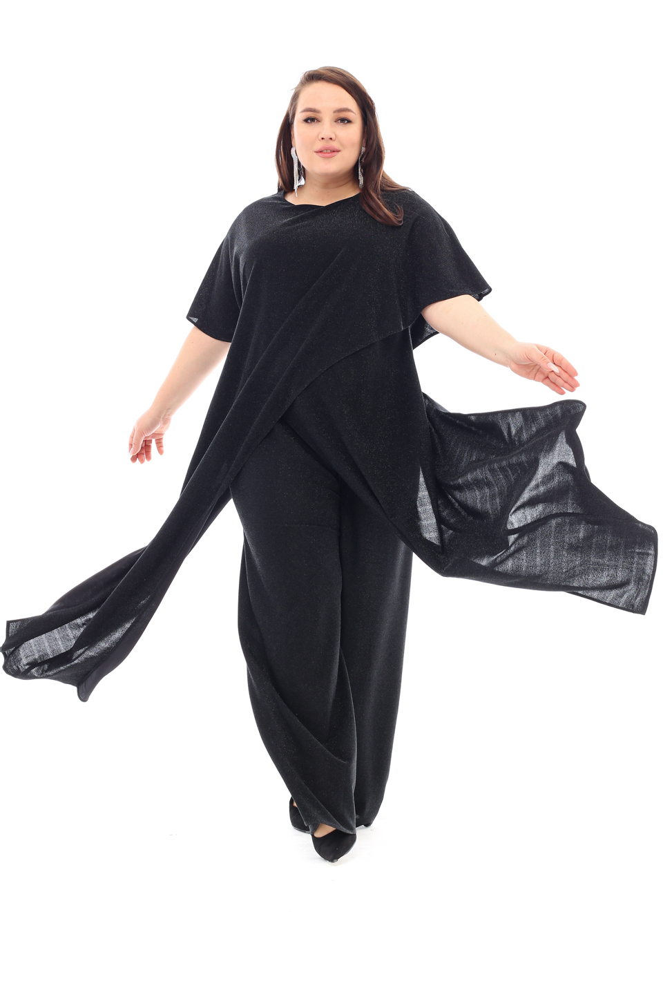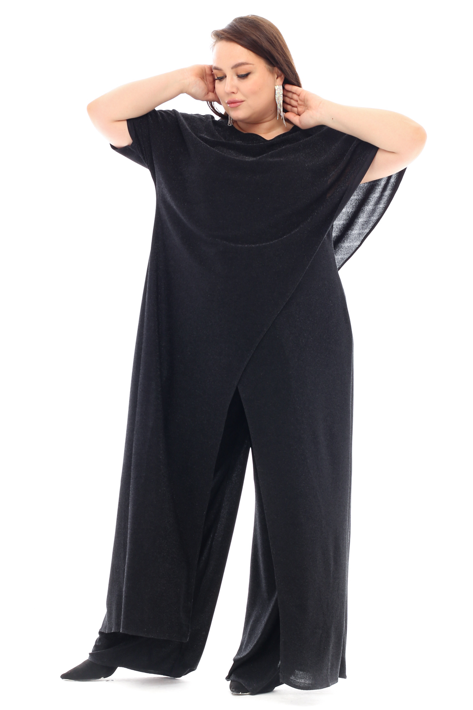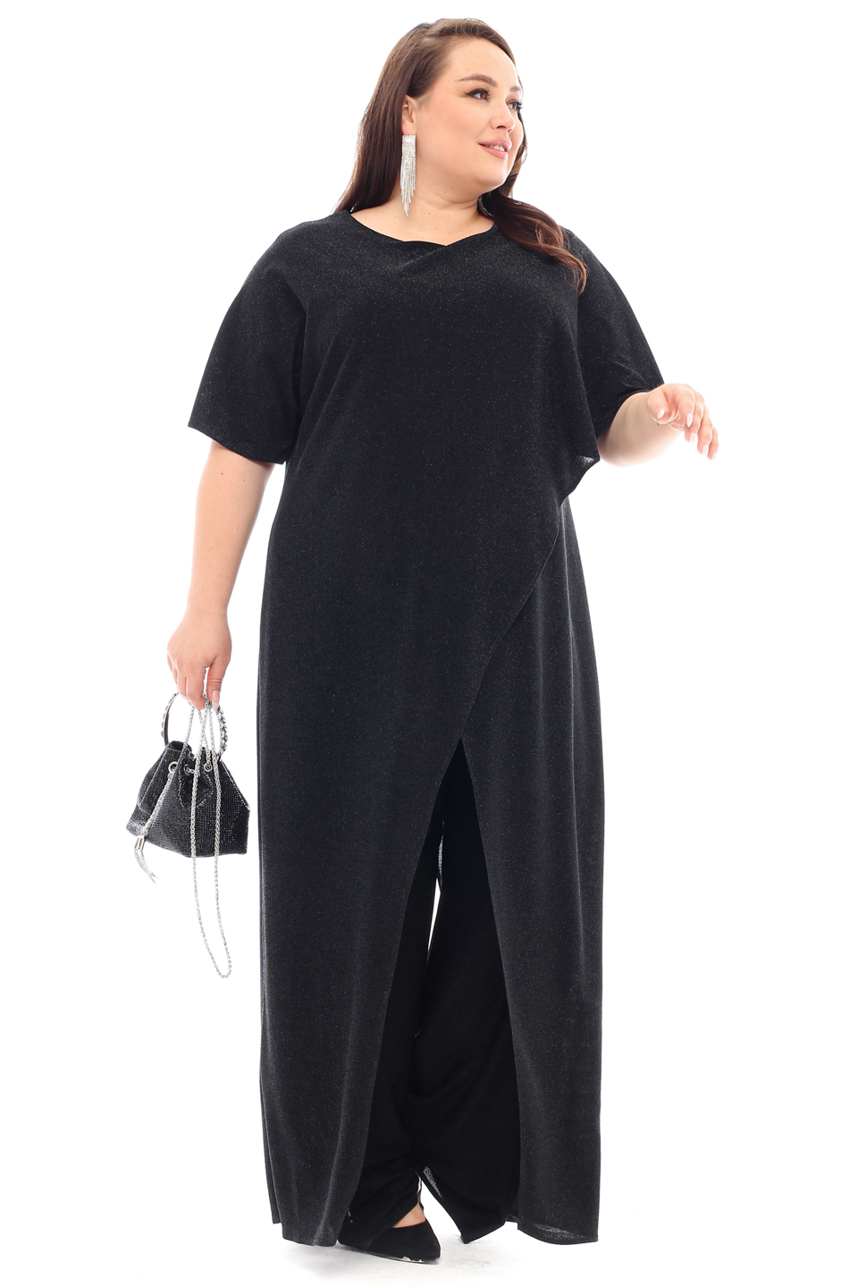 Стильный костюм из мягкого материала с добавлением нитей люрекса состоит из удлиненной туники и брюк. удобные брюки-палаццо свободного кроя имеют завышенную линию талии. брюки отлично сидят за счет комфортной резинки на поясе. по бокам практичные вшивные карманы.