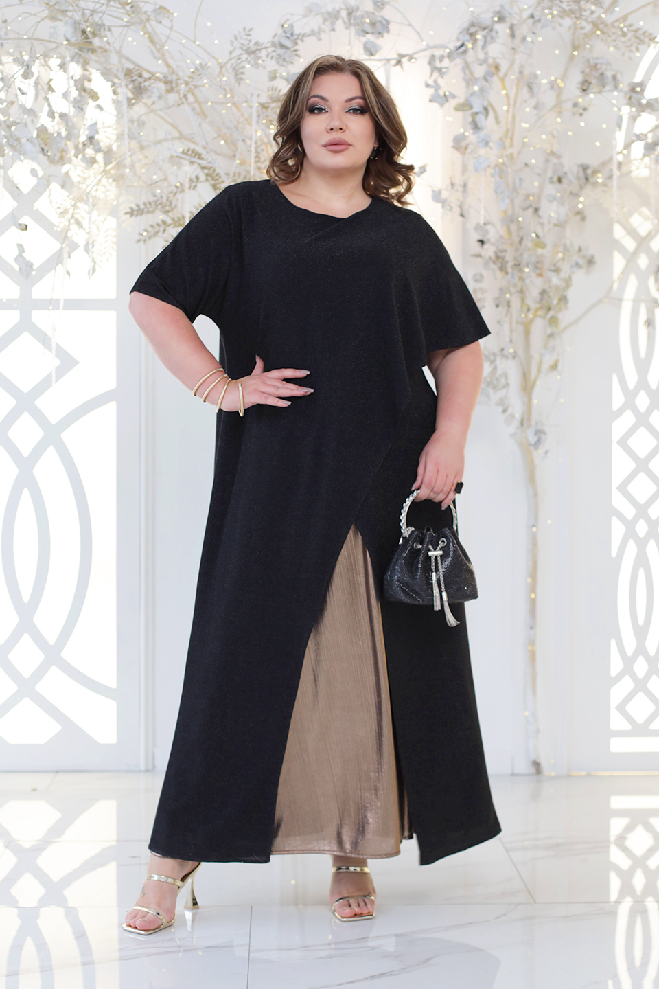 Оригинальная удлиненная туника с запахом имеет круглый вырез и короткие цельнокроеные рукава. ассиметричные края по бокам зрительно вытягивают силуэт и визуально стройнят. нити люрекса добавляют блеска и нарядности. оригинальный крой модели подойдёт как для офиса, так и для праздничных мероприятий. элементы костюма можно также носить по отдельности.длина изделия 50 размера по спинке верх - 149 см, низ - 112 см. в каждом следующем размере длина увеличивается.