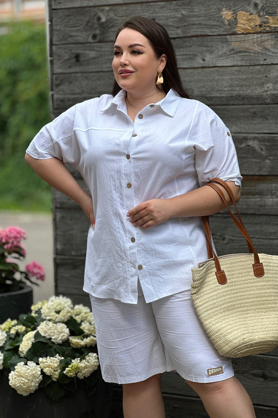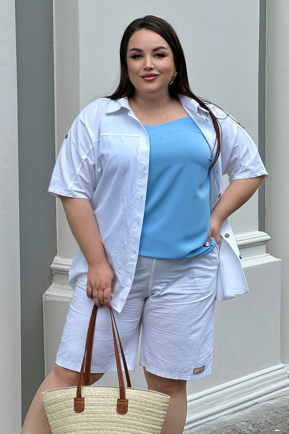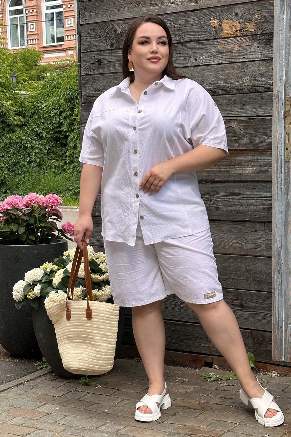 Стильный и комфортный костюм состоит из удлиненной рубашки и шорт-бермуд, выполненных из мягкого материала. рубашка имеет классический отложной воротник и короткие цельнокроеные рукава, присобранные хлястиком. кокетка обеспечивает оптимальную посадку по фигуре. модель застегивается на оригинальные пуговки по всей длине под планку.
