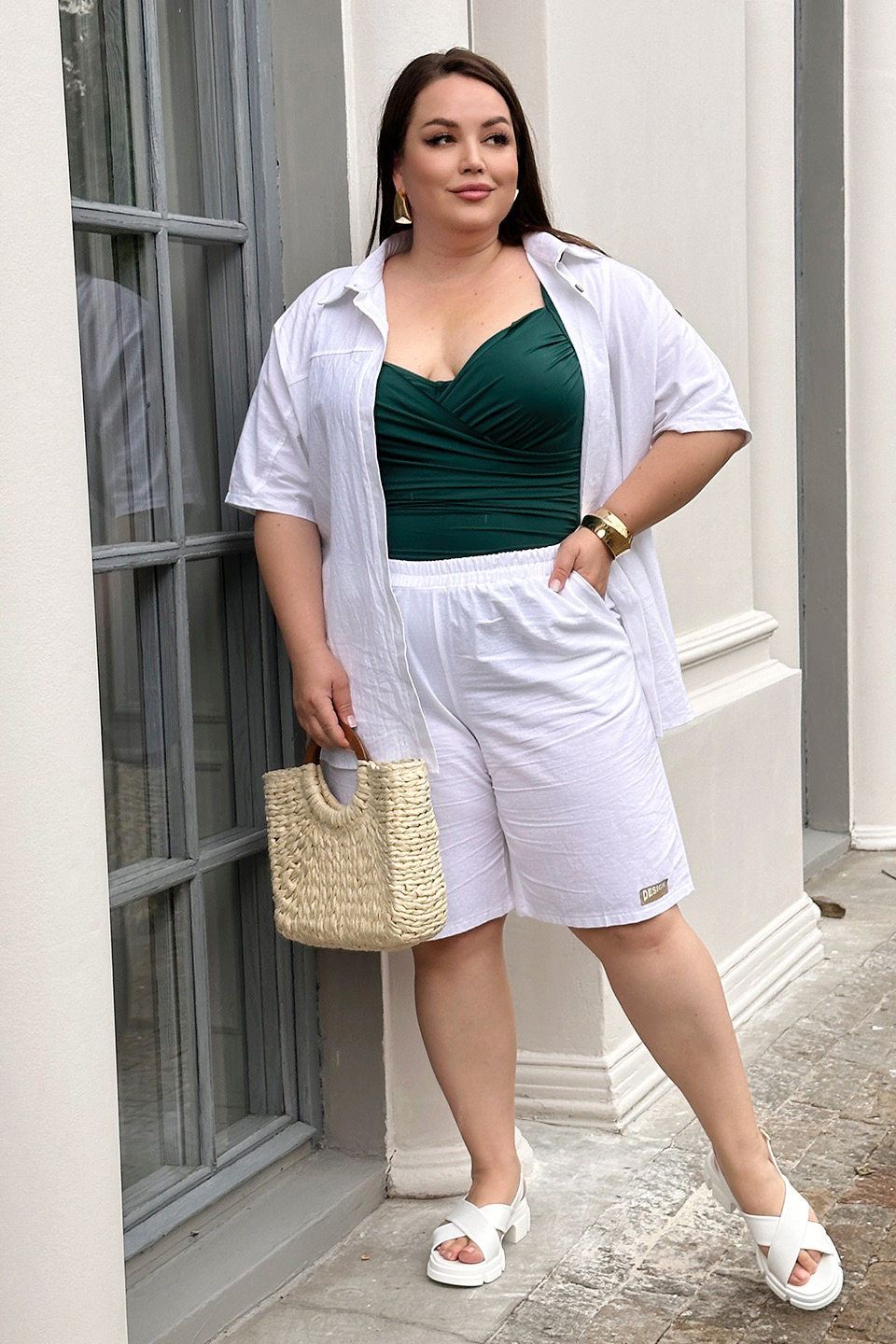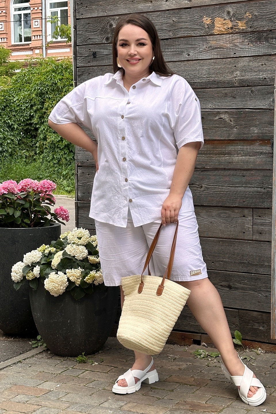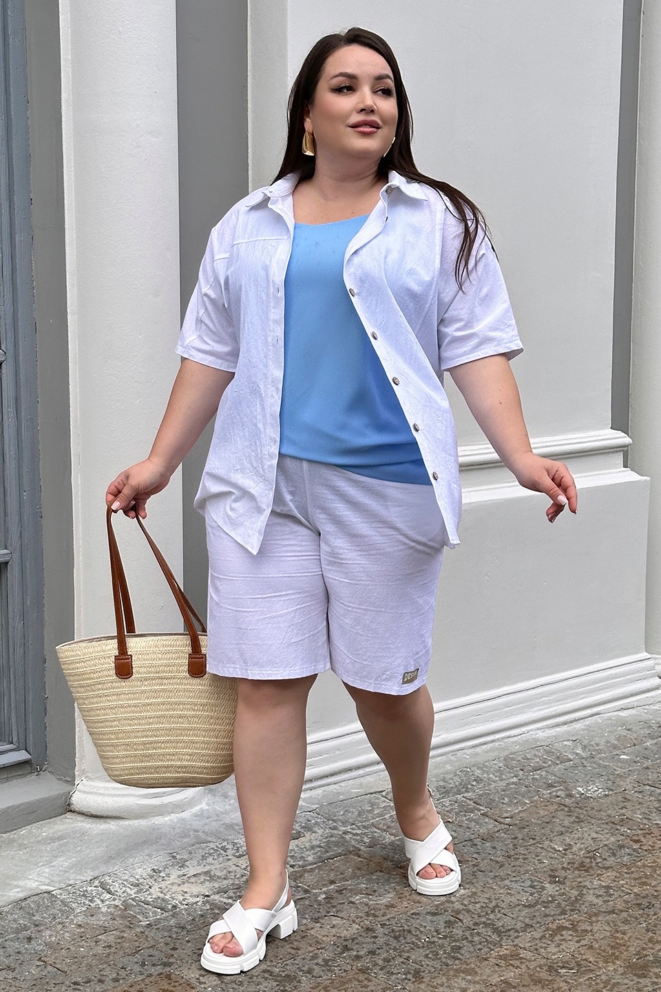 Стильный и комфортный костюм состоит из удлиненной рубашки и шорт-бермуд, выполненных из мягкого материала. рубашка имеет классический отложной воротник и короткие цельнокроеные рукава, присобранные хлястиком. кокетка обеспечивает оптимальную посадку по фигуре. модель застегивается на оригинальные пуговки по всей длине под планку.