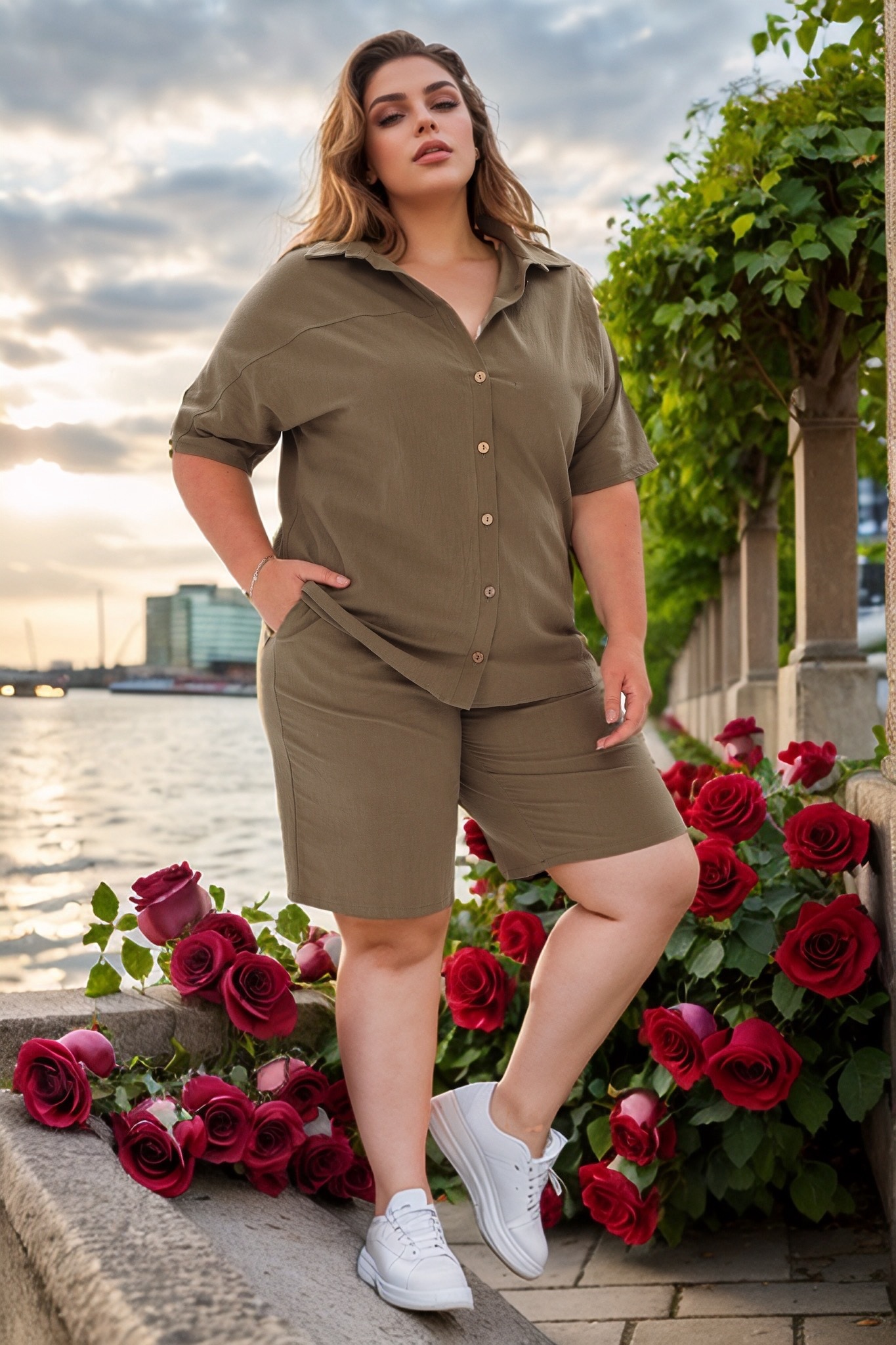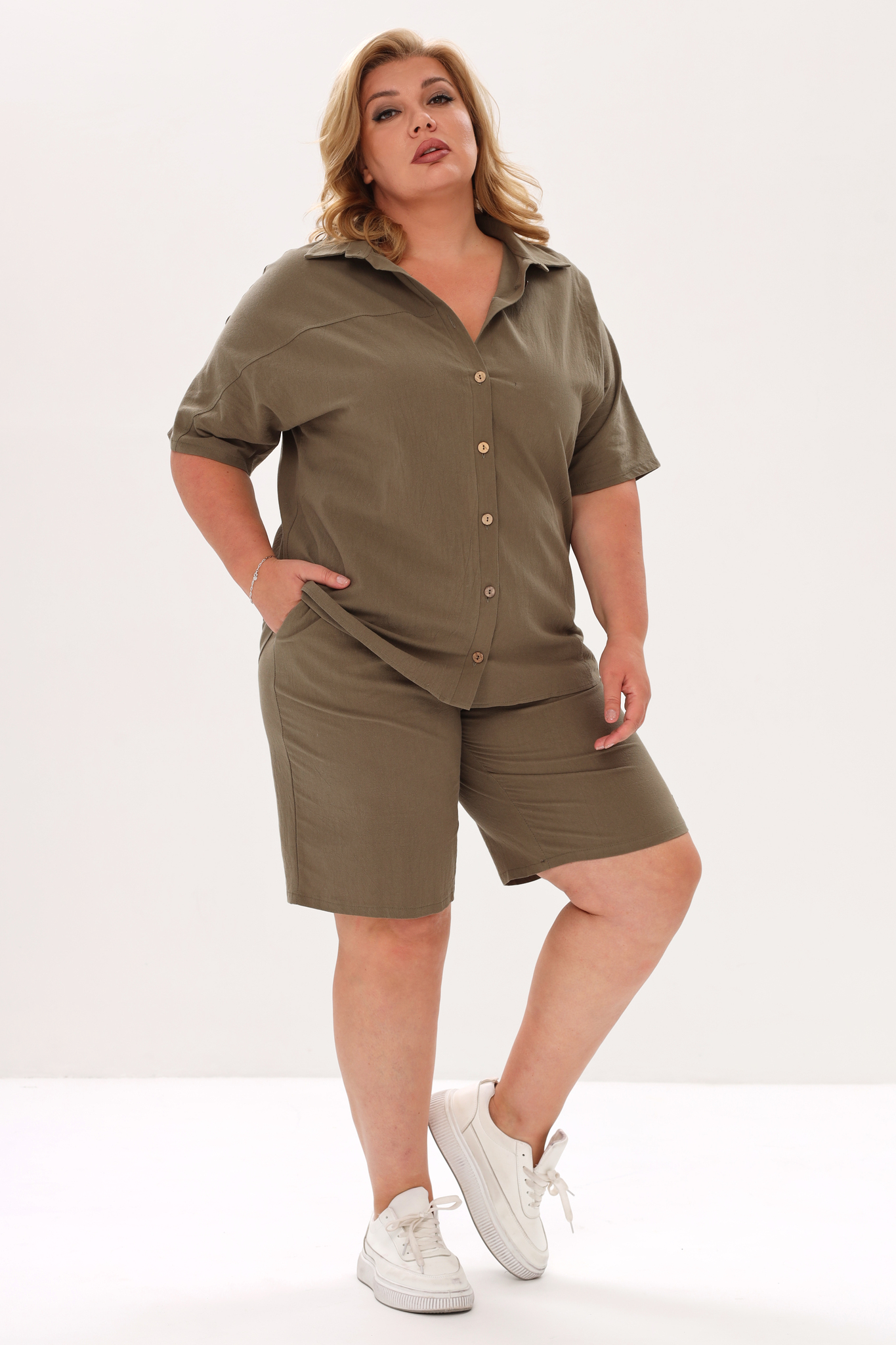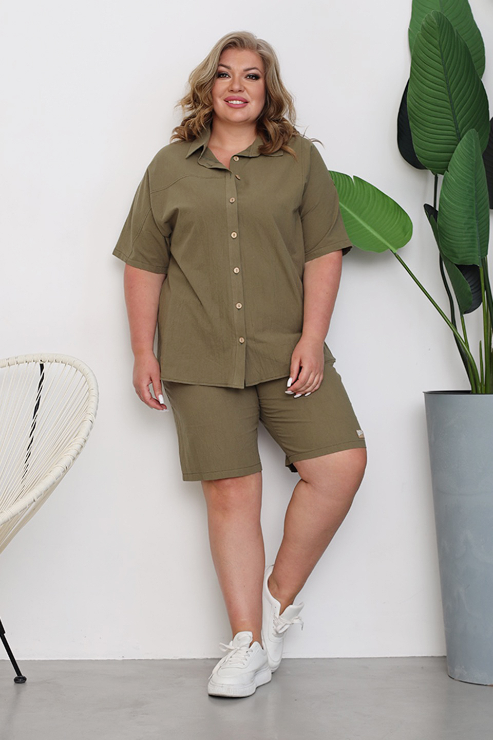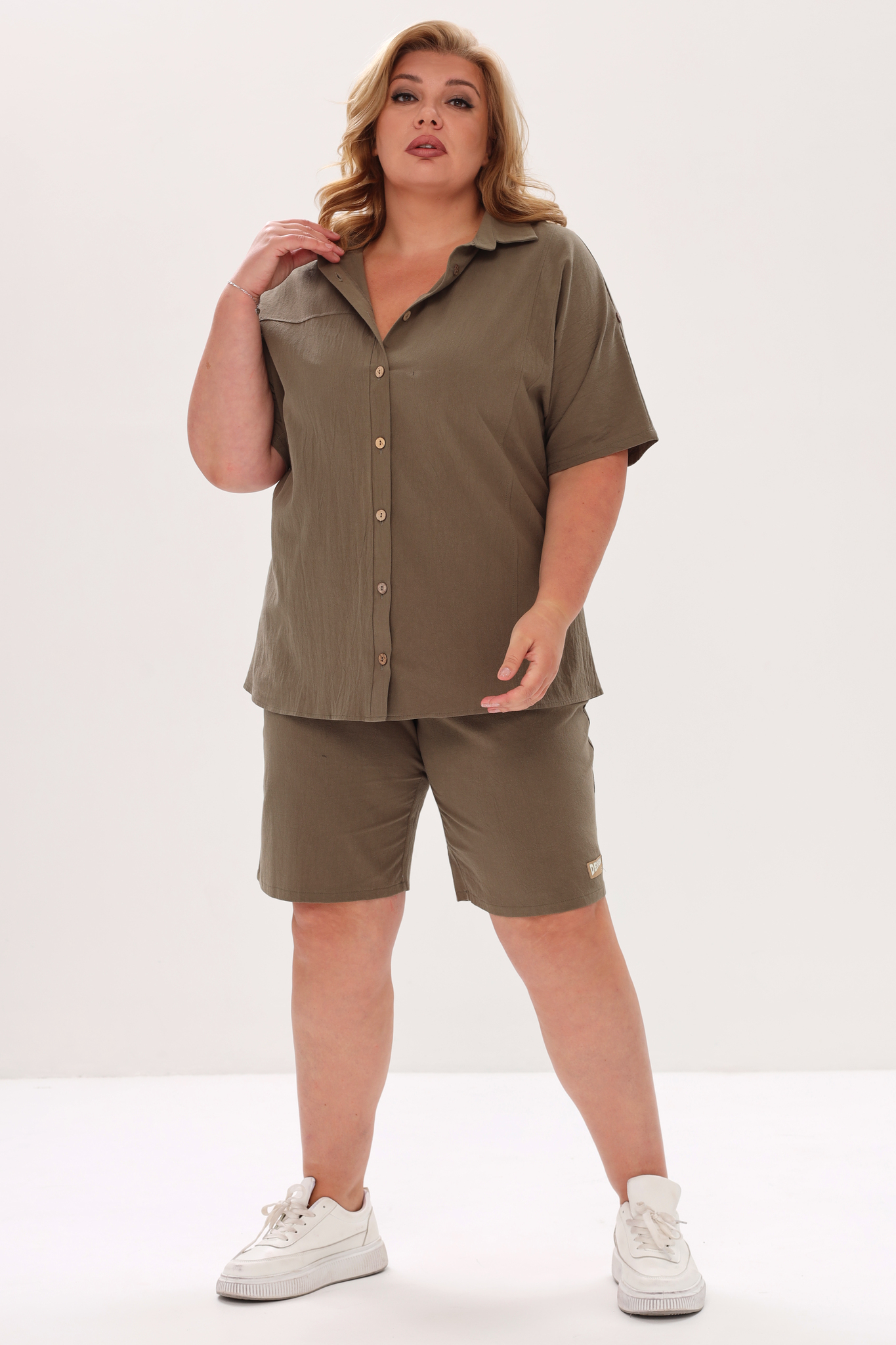 Стильный и комфортный костюм состоит из удлиненной рубашки и шорт-бермуд, выполненных из мягкого материала. рубашка имеет классический отложной воротник и короткие цельнокроеные рукава, присобранные хлястиком. кокетка обеспечивает оптимальную посадку по фигуре. модель застегивается на оригинальные пуговки по всей длине под планку.