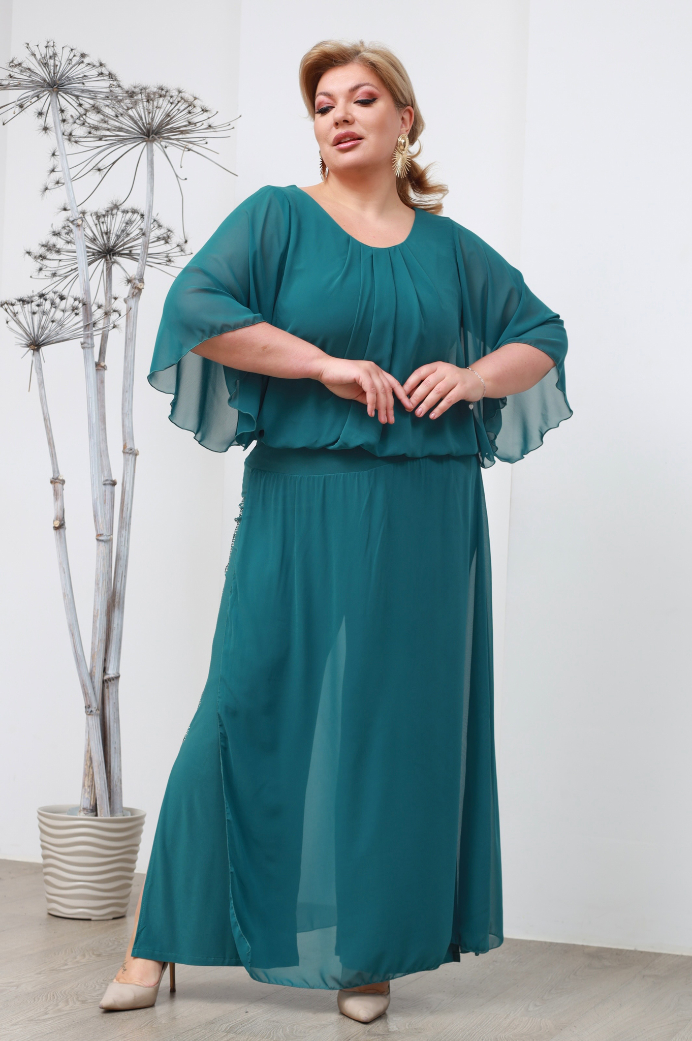 Стильный костюм из мягкого струящегося материала состоит из кофты и брюк. удобные брюки-палаццо свободного кроя из мягкого струящегося материала имеют завышенную линию талии. глубокие разрезы по бокам способствуют оптимальной посадке по фигуре. стразы на брючинах добавляют нарядности и блеска. шифоновый верх искусно скрывает мелкие недостатки фигуры. брюки отлично сидят за счет комфортной резинки на поясе.