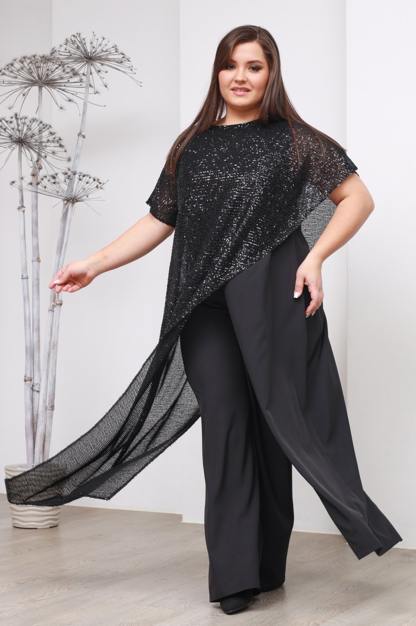Оригинальная удлиненная туника с запахом имеет круглый вырез и короткие цельнокроеные рукава. ассиметричные края по бокам зрительно вытягивают силуэт и визуально стройнят. пайетки добавляют блеска и нарядности. оригинальный крой модели подойдёт как для офиса, так и для праздничных мероприятий. элементы костюма можно также носить по отдельности. длина изделия 50 размера по спинке верх - 149 см, низ -109 см. в каждом следующем размере длина увеличивается.