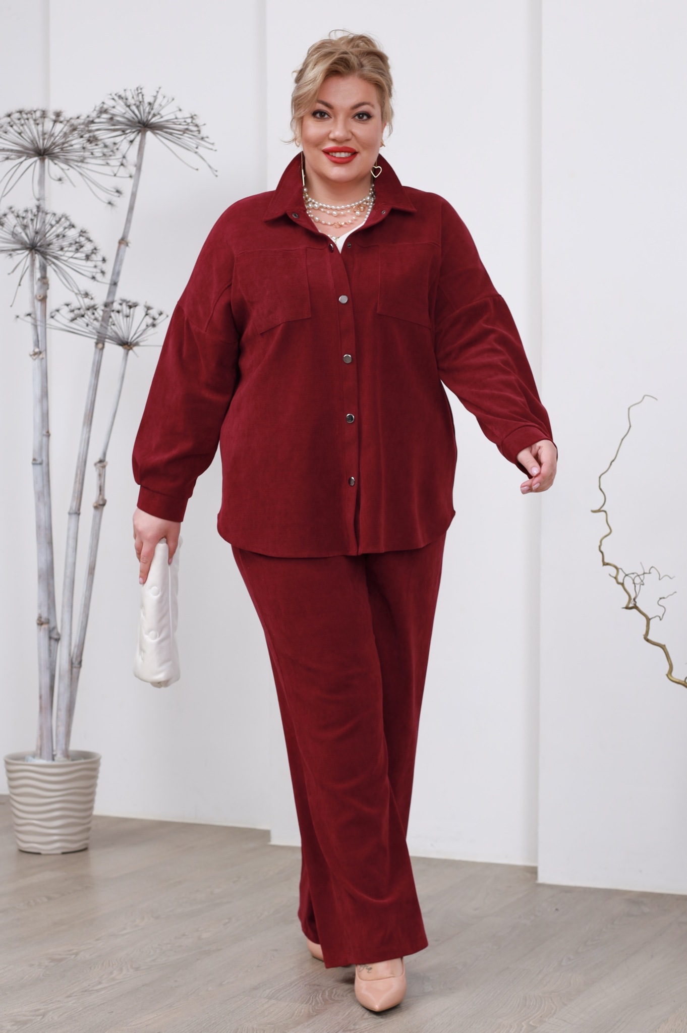 Костюм брючный микровельвет оверсайз красный